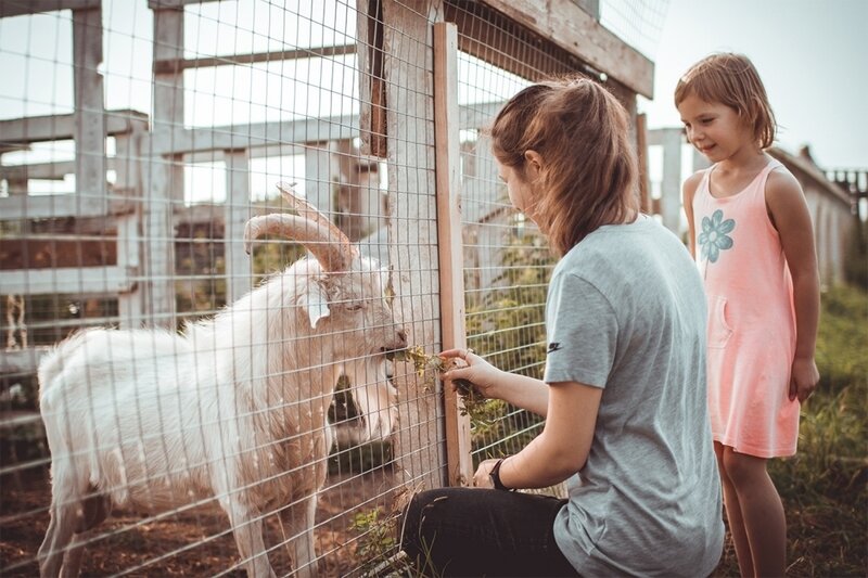 Здесь вы сможете увидеть козлят, овец, коров и телят, домашних птиц, а также и более диковинных зверей: лосят, верблюда, страусов, лис и многих других. И несомненно, вы познакомитесь с нашими лошадьми, которые всегда рады посетителям, особенно если вы принесёте им угощения.