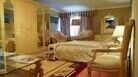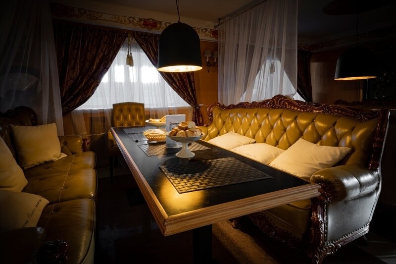 Апартаменты представляют собой две комнаты: просторный холл с прекрасной мягкой мебелью и столиком, а также спальня в которой расположена двухспальная кровать. Меблированная гостиная оборудована камином и плазменным телевизором. В санузле установлена душевая кабина.