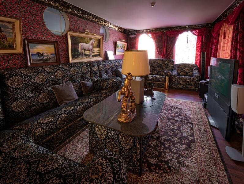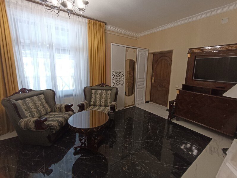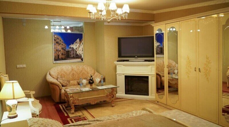 В номере 2 комнаты: спальня с двуспальной кроватью и гостиная — гарнитур мягкой мебели (диван раскладывается), плазма (Триколор), электрический камин, фен, утюг (по запросу). Санузел с душевой кабиной, косметические принадлежности, тапочки, полотенца.