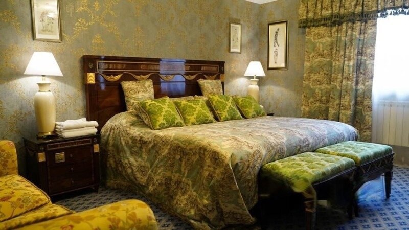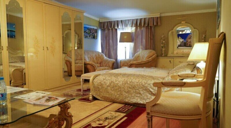 Апартаменты представляют собой 3 комнаты: просторный холл с шикарной мягкой мебелью и столиками, а также 2 спальни. Меблированная гостиная оборудована камином, плазменным телевизором, двумя диванами, обеденной зоной и офисным столиком. Также в номере имеется собственная ванна с двойной раковиной и санузлом.