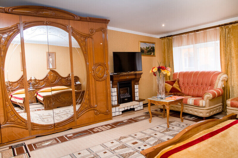 В номере: двуспальная кровать, раскладывающийся диван (дополнительное место), плазма (Триколор), камин, фен, утюг (по запросу). Санузел с душевой кабиной, косметические принадлежности, тапочки, полотенца.