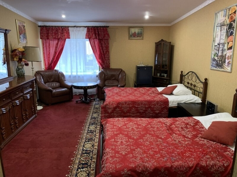 Основной корпус, отдельный вход в номер с улицы. В номере: две двуспальные кровати, плазма (Триколор), камин, фен, утюг (по запросу) , холодильник. Санузел с душевой кабиной: косметические принадлежности, тапочки, полотенца. Бесплатный Wi-Fi, внутренний телефон для вызова служб (без выхода в город).