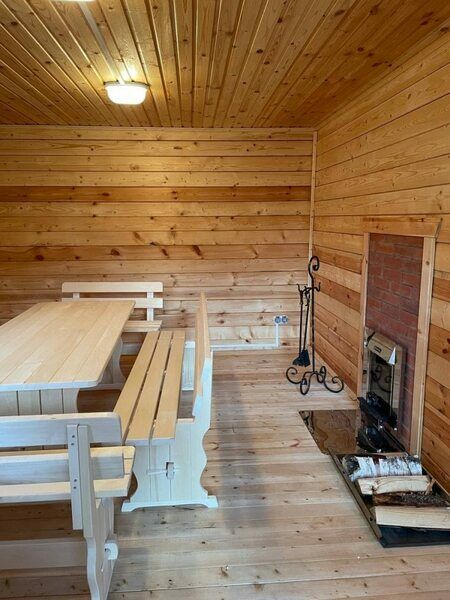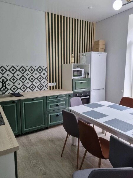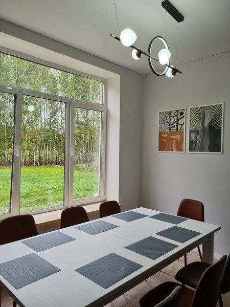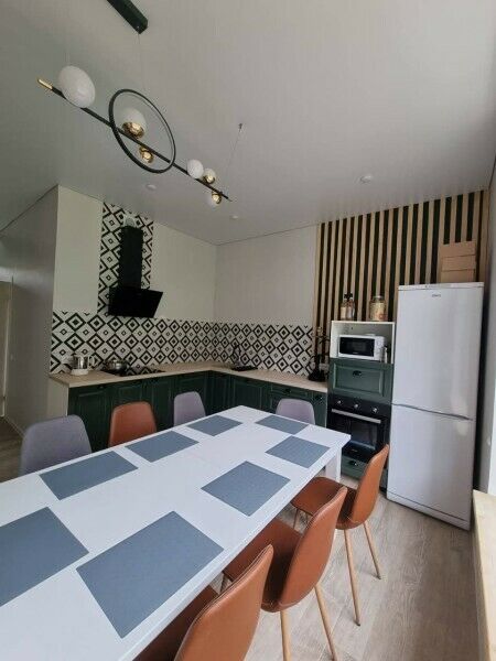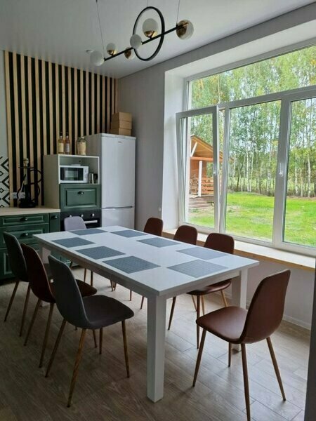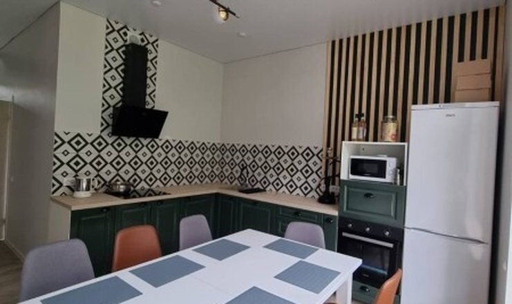 Приготовление еды можно организовать на просторной кухне с обеденным столом, рассчитанным на всех постояльцев, необходимым количеством бытовой техники, посуды и принадлежностей.