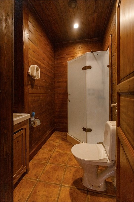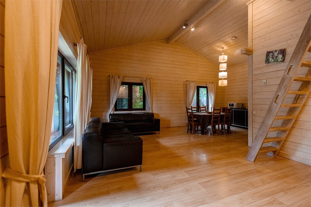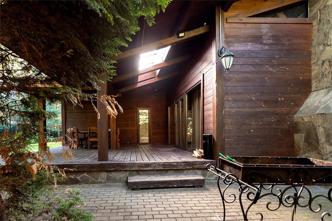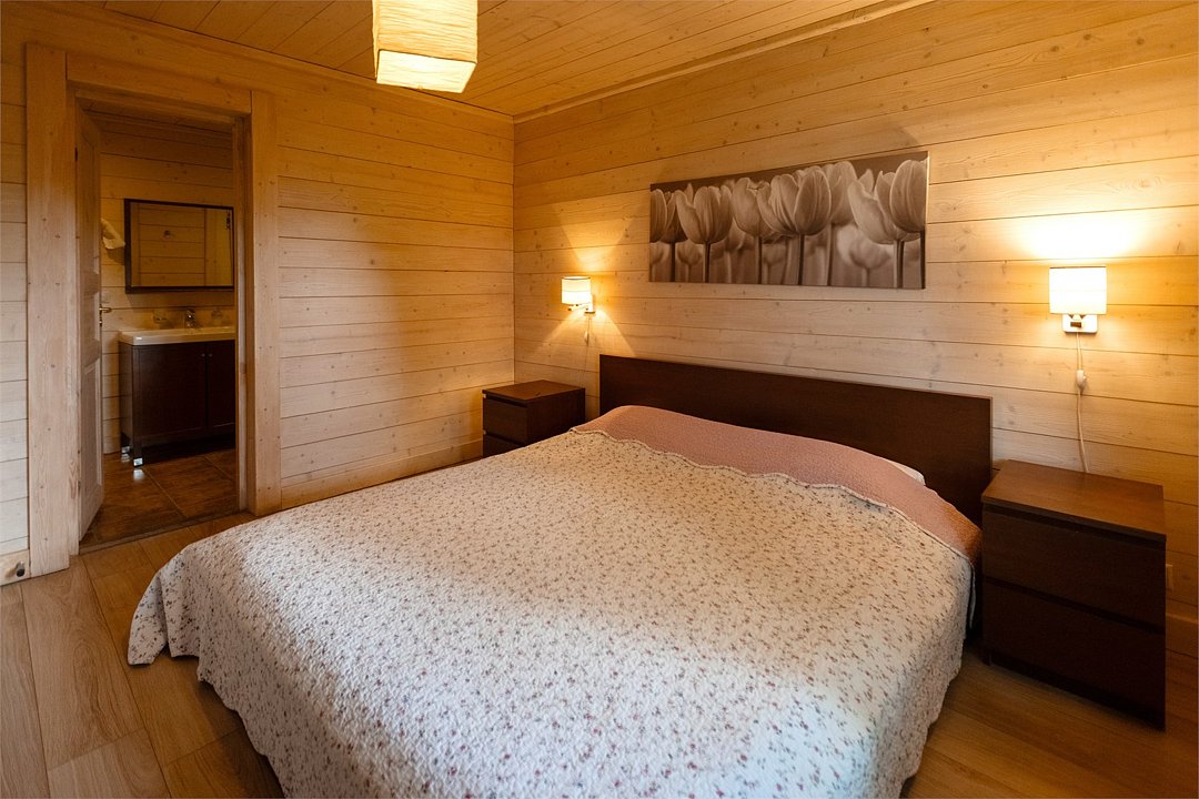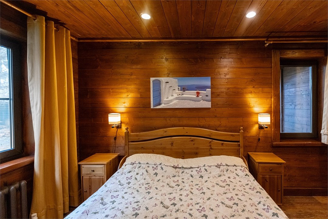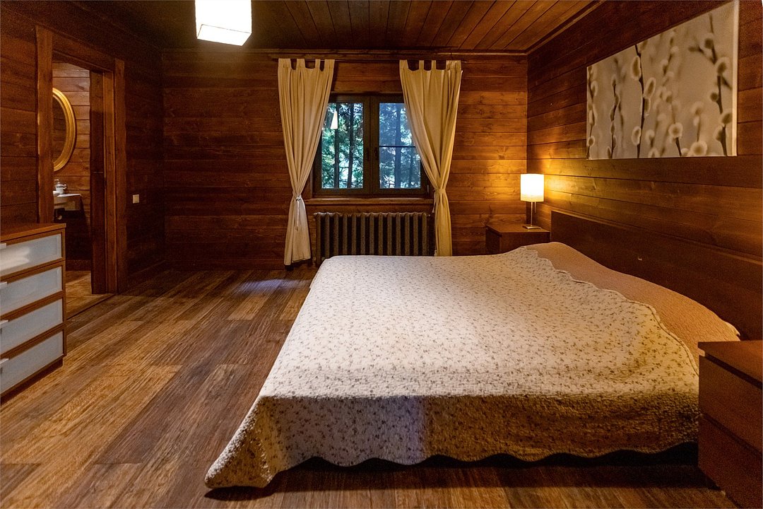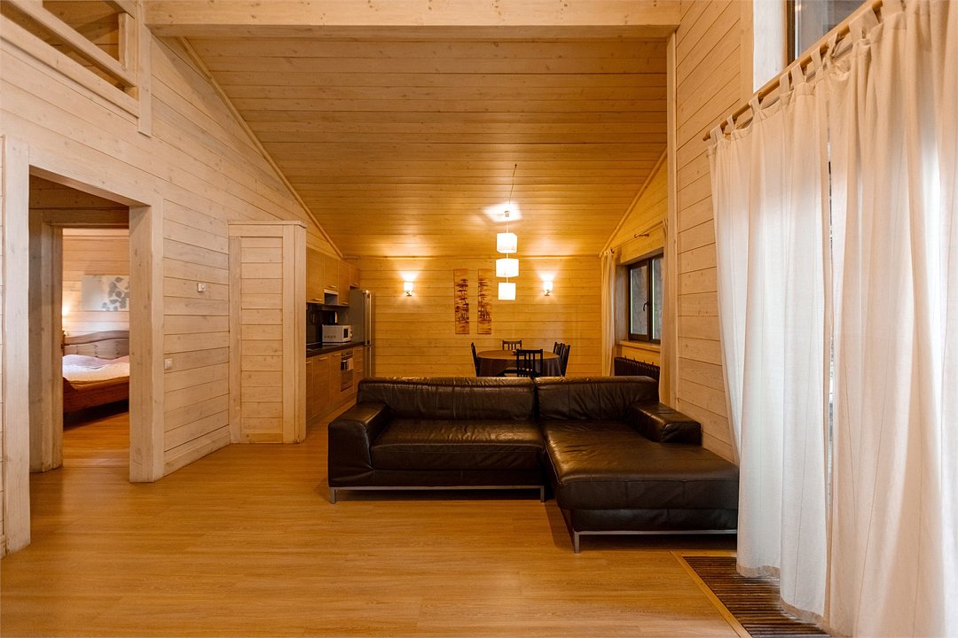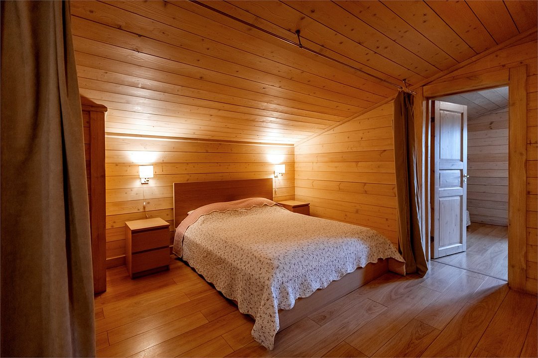 Жемчужина коттеджного комплекса – деревянное шале цвета палисандр, с теплым современным интерьером, в который изысканно вплетены восточные элементы, как, антикварный марокканский комод из темного дерева или дамасская люстра в столовой. Левое крыло шале отведено под финскую сауну и просторную банную зону с бочкой-купелью и сибирским банным чаном под открытым небом. На первом этаже кухня (оснащена посудомоечной машиной), гостиная с уютной каминной зоной и выходом на крытую террасу (с большом круглым столом) и зону барбекю, две изолированные спальни (одна с индивидуальным с/у) и с/у с душевой кабиной. На мансарде расположена третья спальня с видом на гостиную.Услуги и удобства