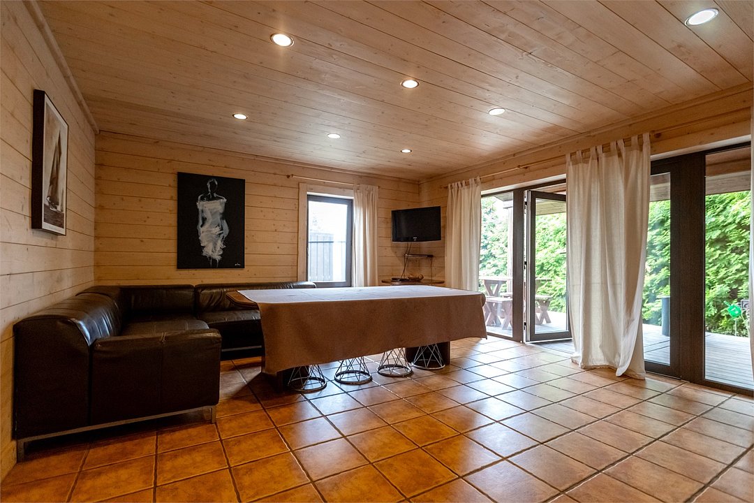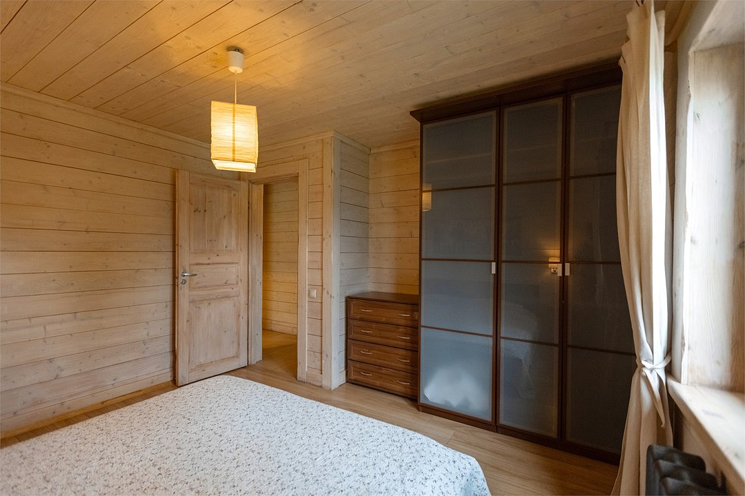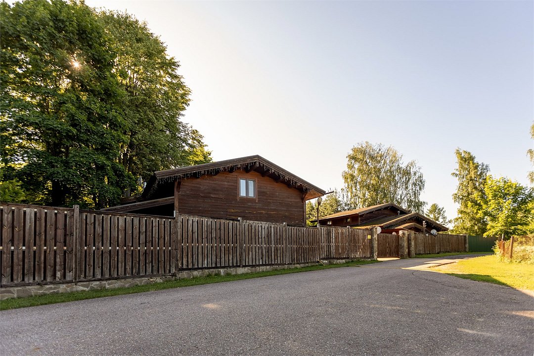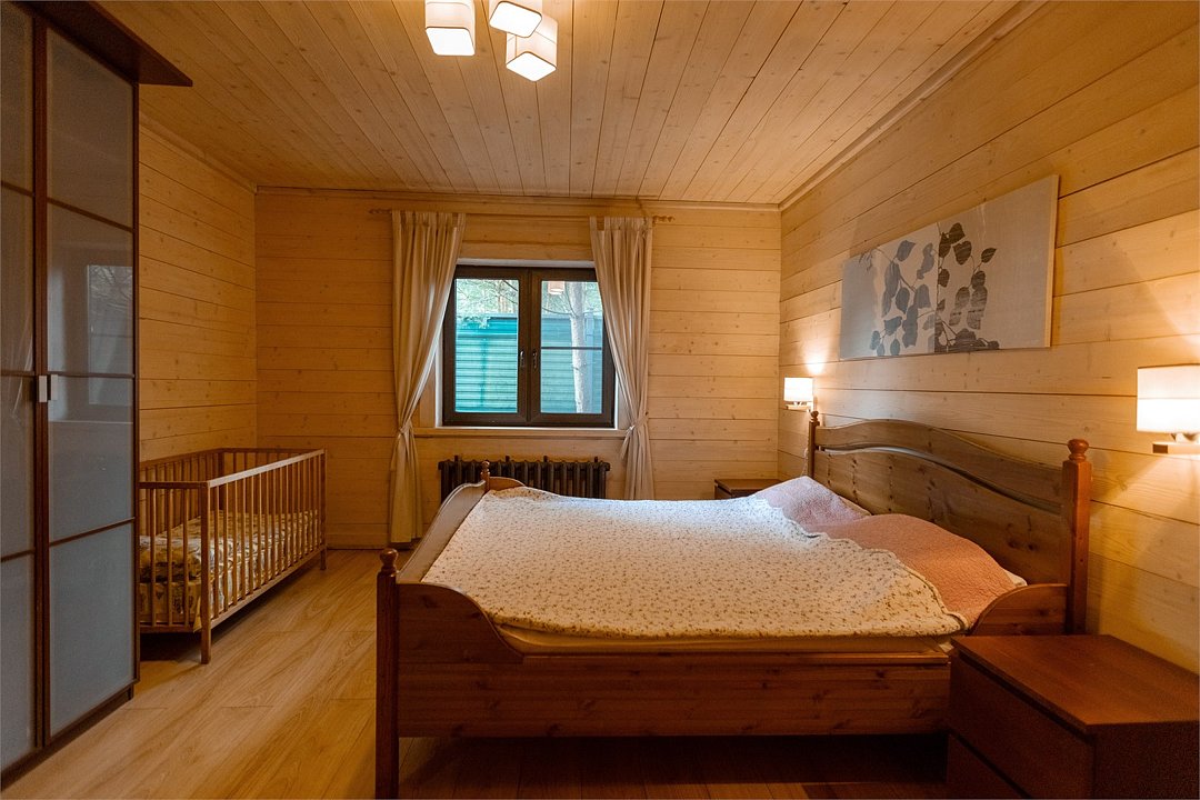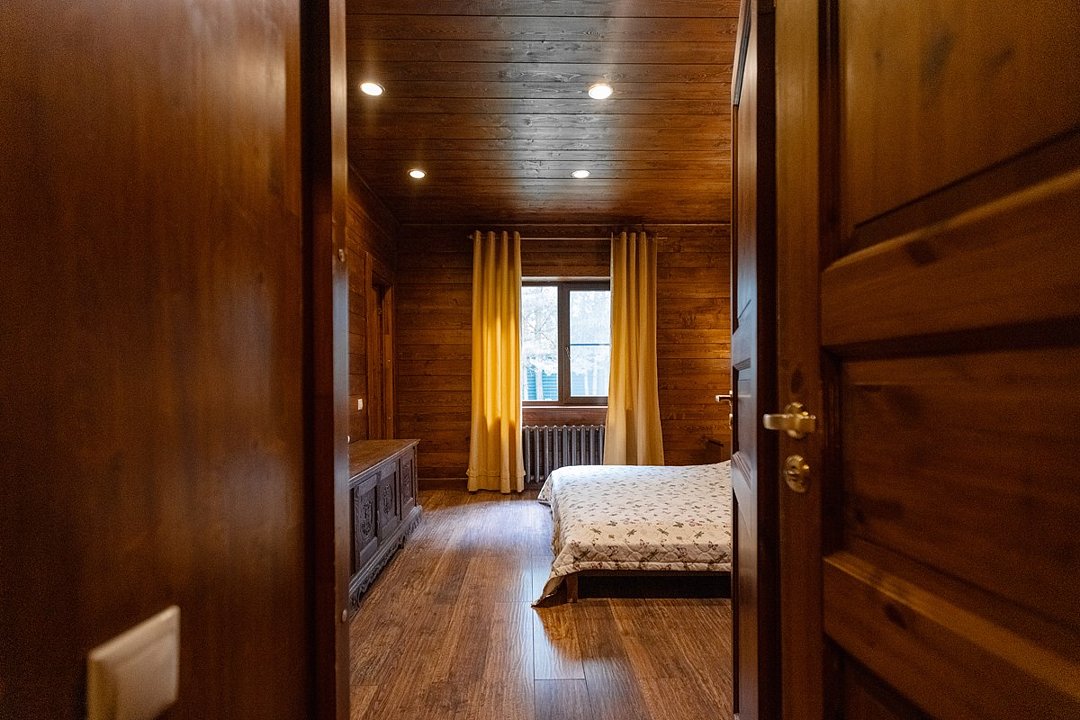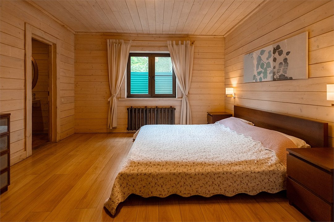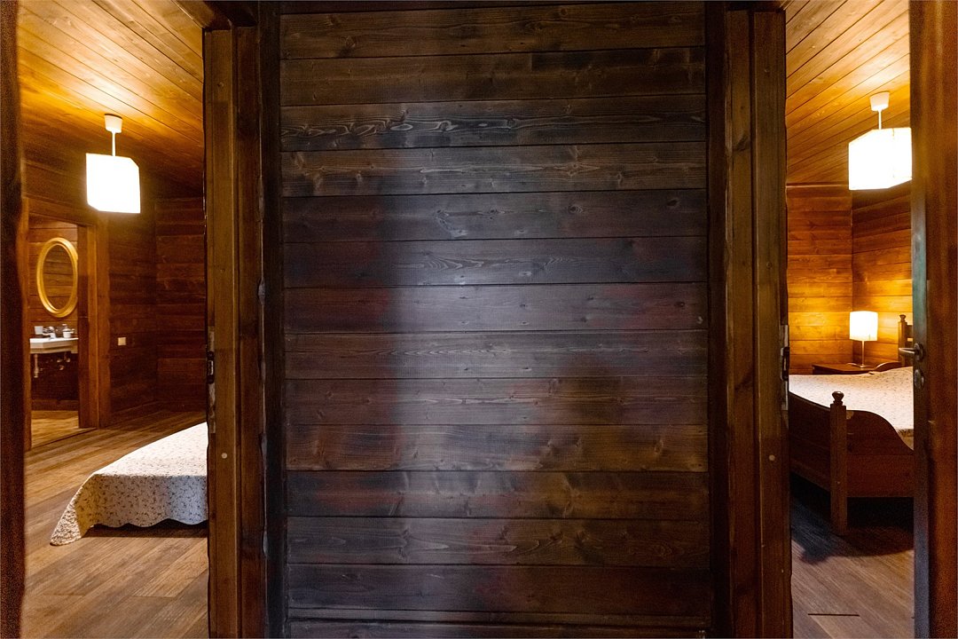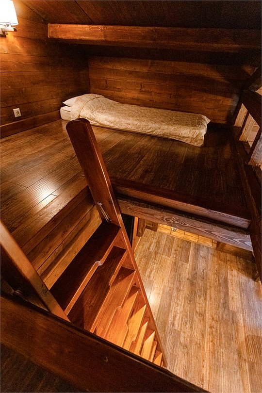 Жемчужина коттеджного комплекса – деревянное шале цвета палисандр, с теплым современным интерьером, в который изысканно вплетены восточные элементы, как, антикварный марокканский комод из темного дерева или дамасская люстра в столовой. Левое крыло шале отведено под финскую сауну и просторную банную зону с бочкой-купелью и сибирским банным чаном под открытым небом. На первом этаже кухня (оснащена посудомоечной машиной), гостиная с уютной каминной зоной и выходом на крытую террасу (с большом круглым столом) и зону барбекю, две изолированные спальни (одна с индивидуальным с/у) и с/у с душевой кабиной. На мансарде расположена третья спальня с видом на гостиную.Услуги и удобства