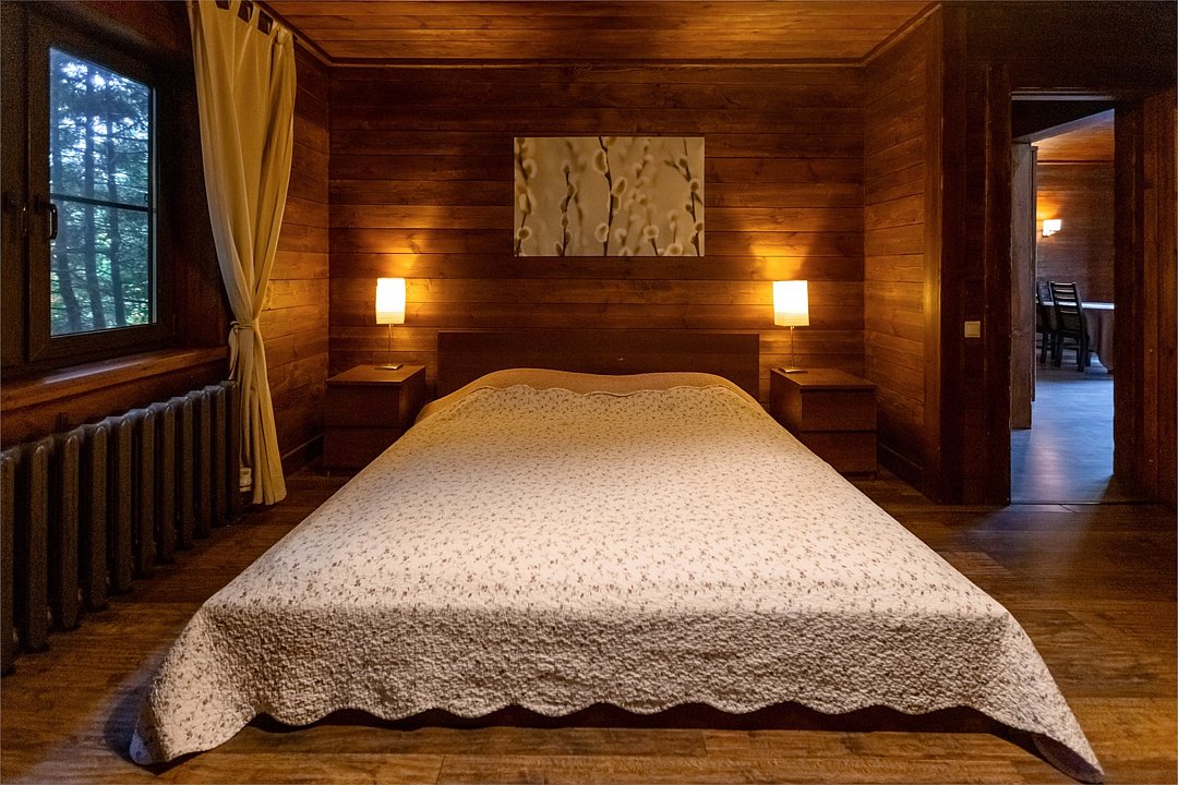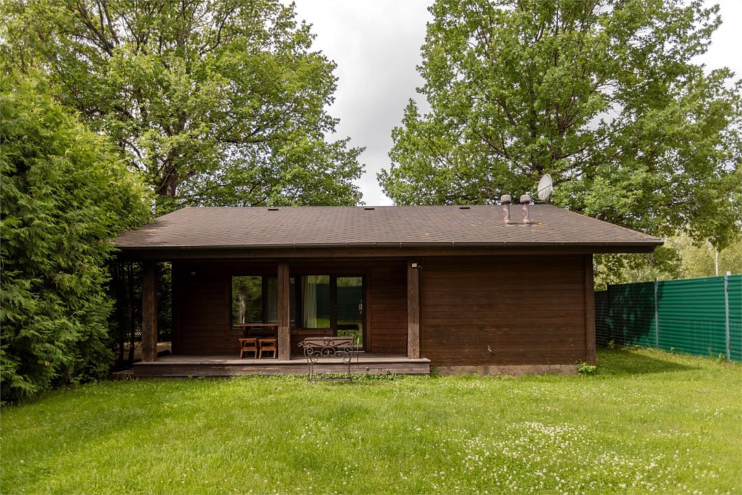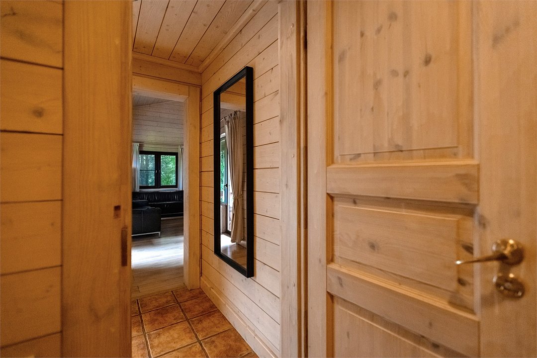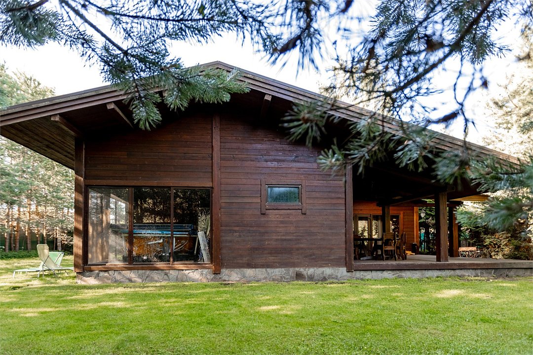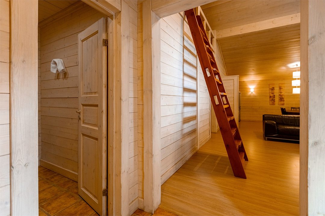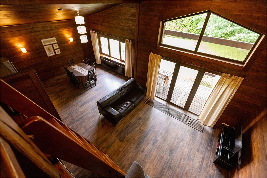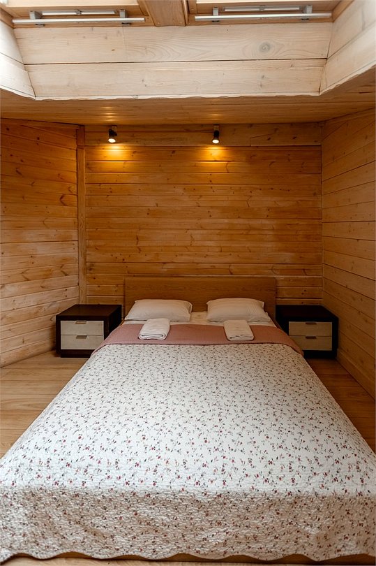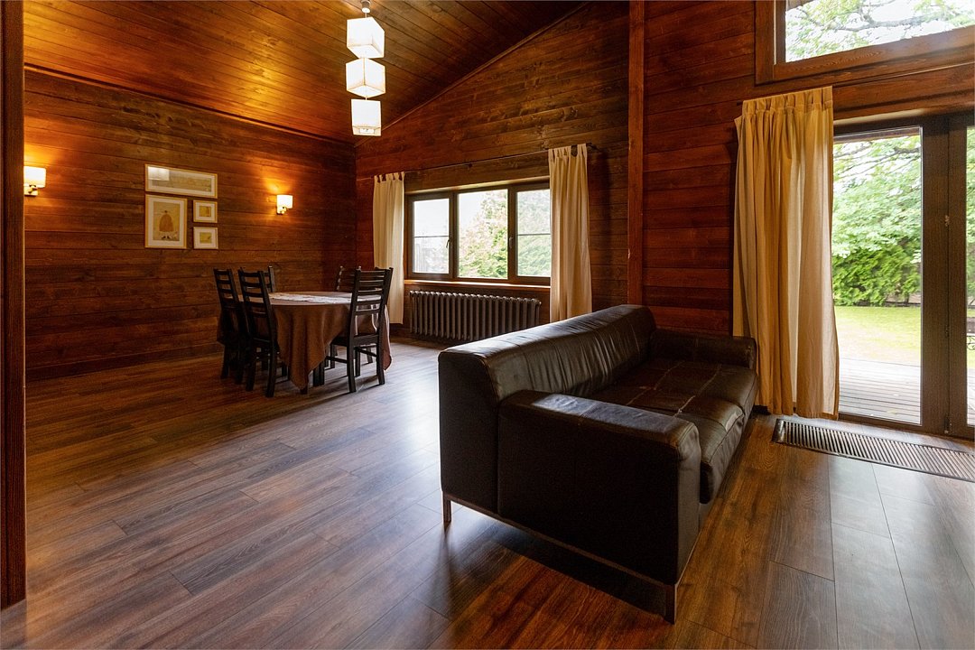 Жемчужина коттеджного комплекса – деревянное шале цвета палисандр, с теплым современным интерьером, в который изысканно вплетены восточные элементы, как, антикварный марокканский комод из темного дерева или дамасская люстра в столовой. Левое крыло шале отведено под финскую сауну и просторную банную зону с бочкой-купелью и сибирским банным чаном под открытым небом. На первом этаже кухня (оснащена посудомоечной машиной), гостиная с уютной каминной зоной и выходом на крытую террасу (с большом круглым столом) и зону барбекю, две изолированные спальни (одна с индивидуальным с/у) и с/у с душевой кабиной. На мансарде расположена третья спальня с видом на гостиную.Услуги и удобства