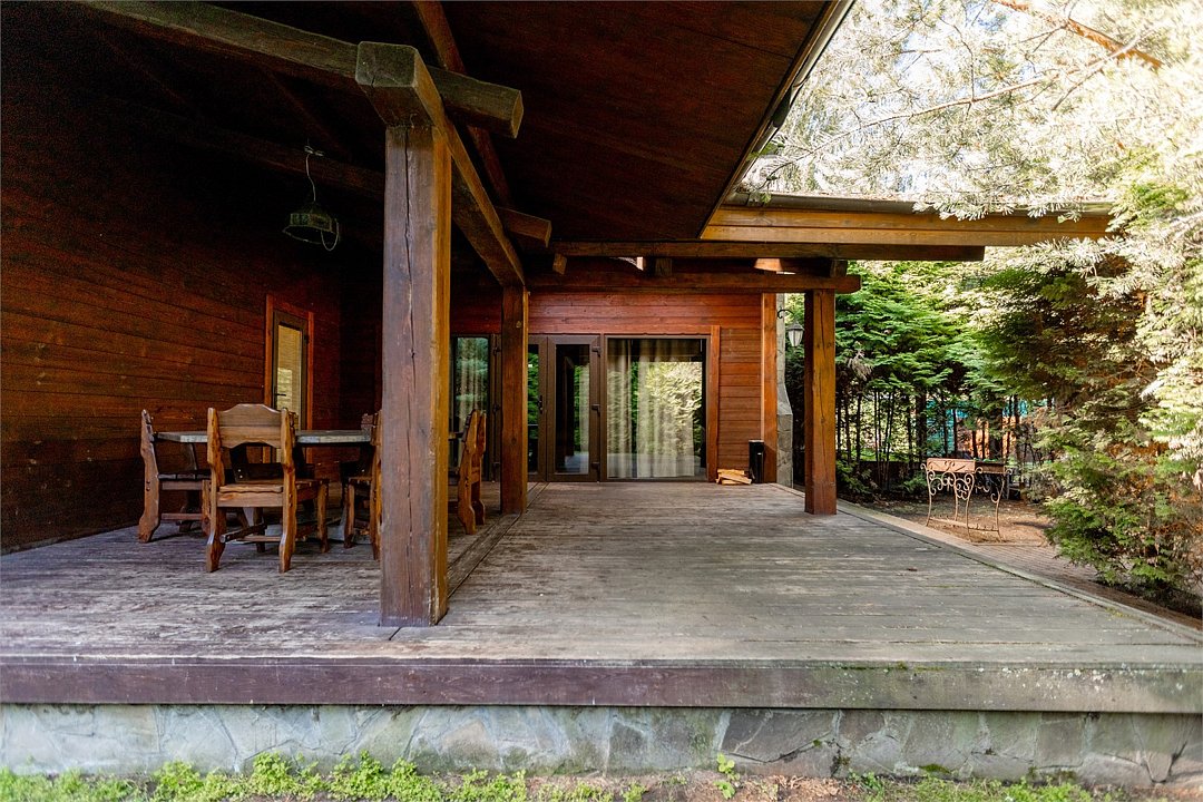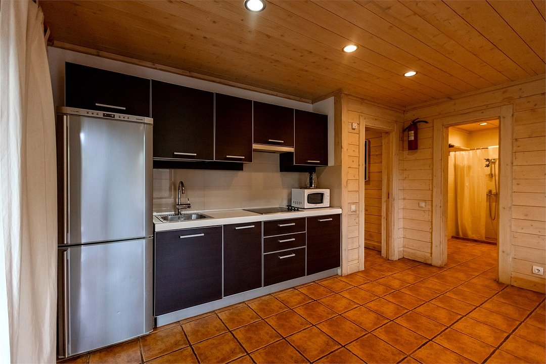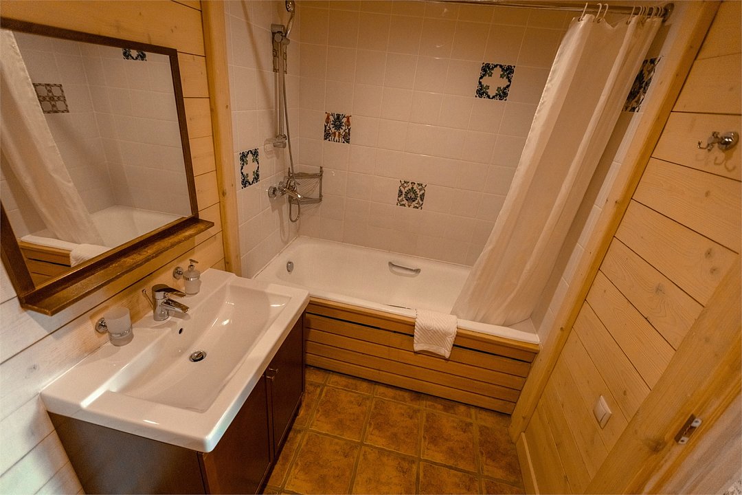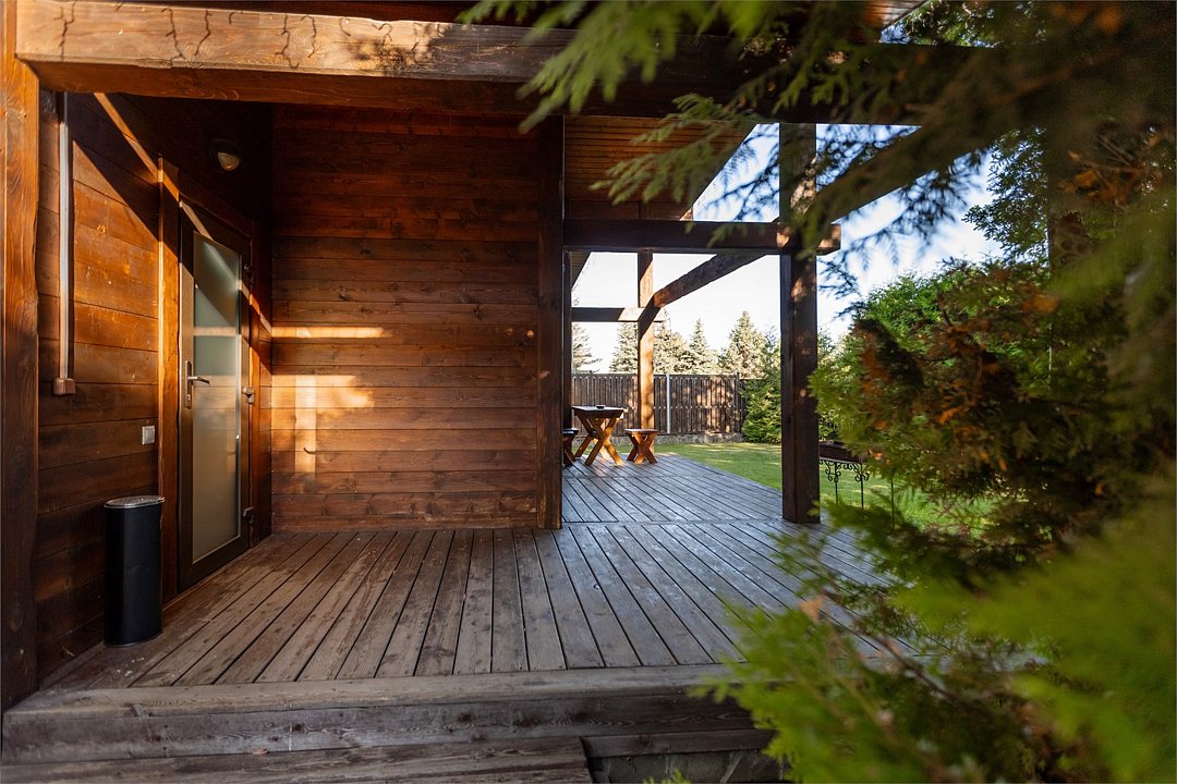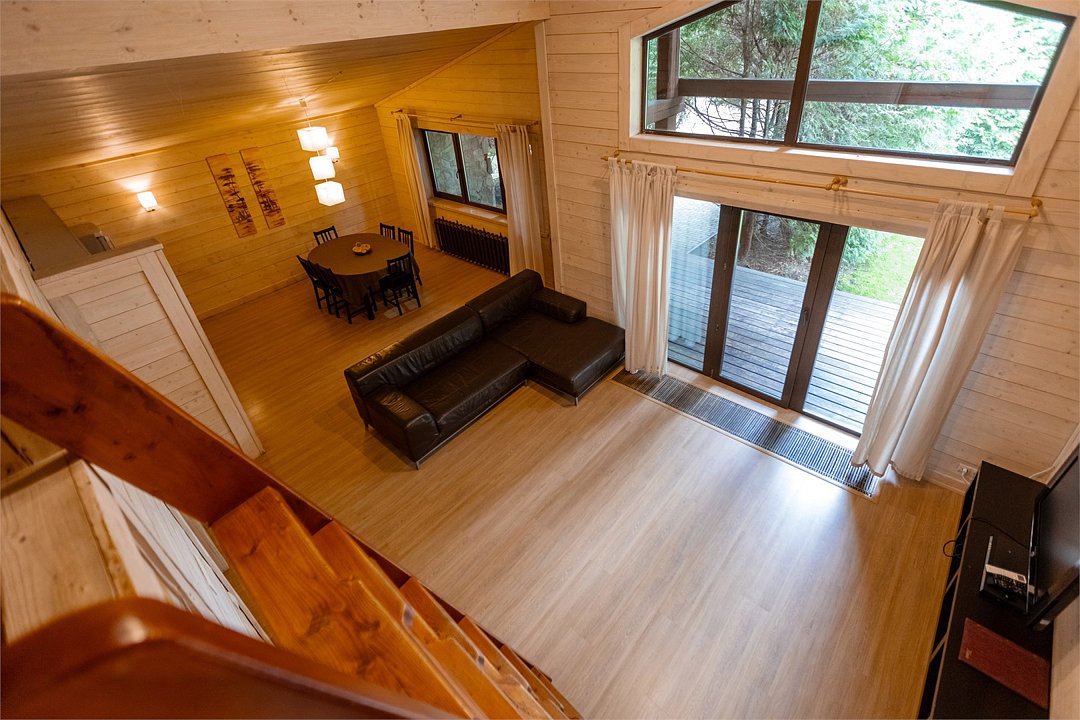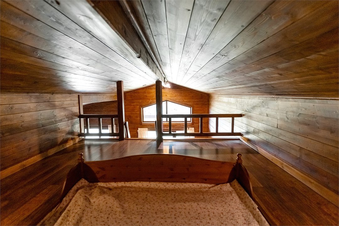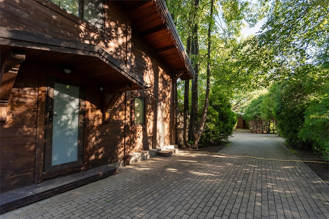 Жемчужина коттеджного комплекса – деревянное шале цвета палисандр, с теплым современным интерьером, в который изысканно вплетены восточные элементы, как, антикварный марокканский комод из темного дерева или дамасская люстра в столовой. Левое крыло шале отведено под финскую сауну и просторную банную зону с бочкой-купелью и сибирским банным чаном под открытым небом. На первом этаже кухня (оснащена посудомоечной машиной), гостиная с уютной каминной зоной и выходом на крытую террасу (с большом круглым столом) и зону барбекю, две изолированные спальни (одна с индивидуальным с/у) и с/у с душевой кабиной. На мансарде расположена третья спальня с видом на гостиную.Услуги и удобства