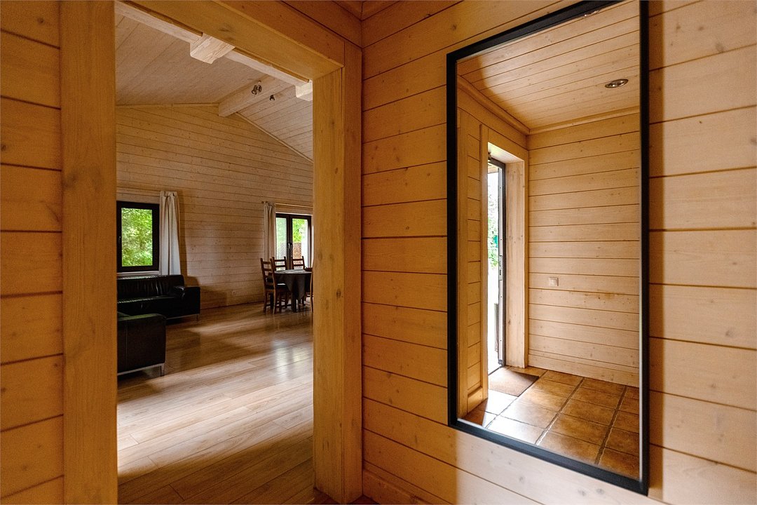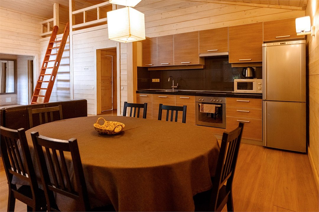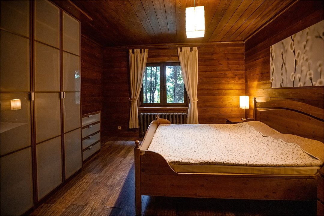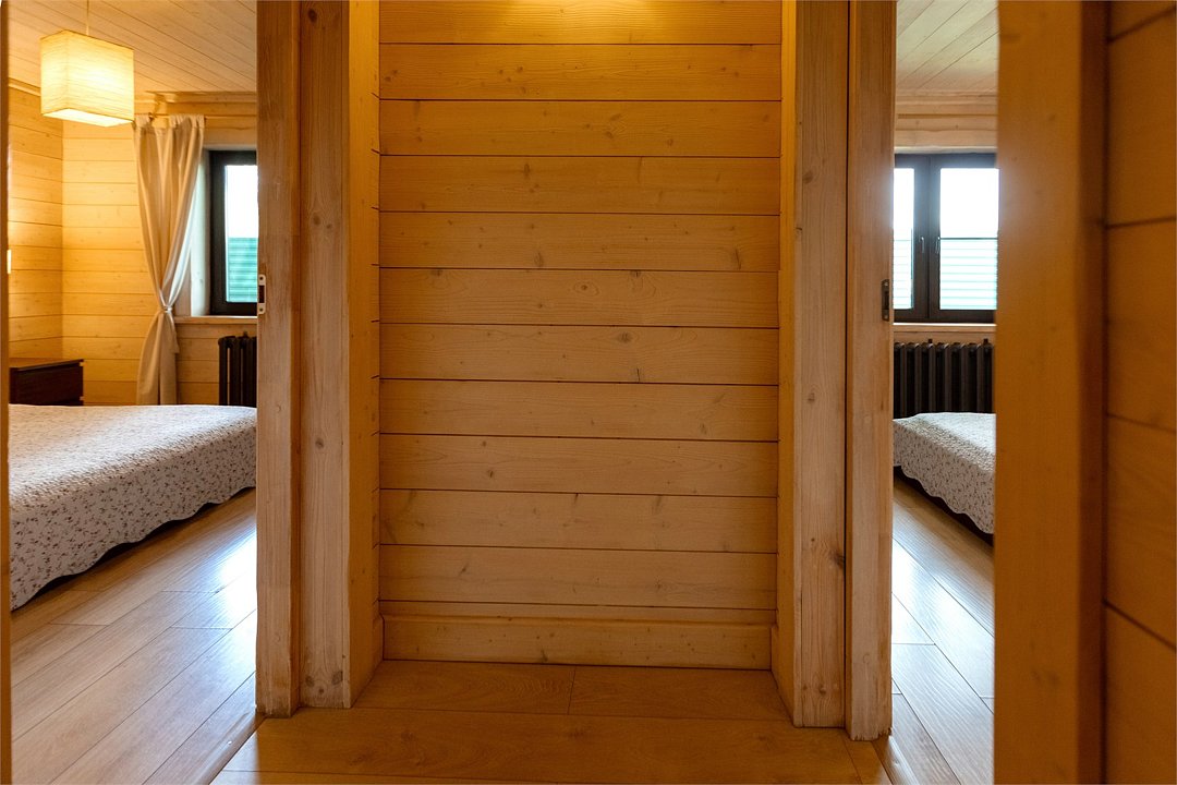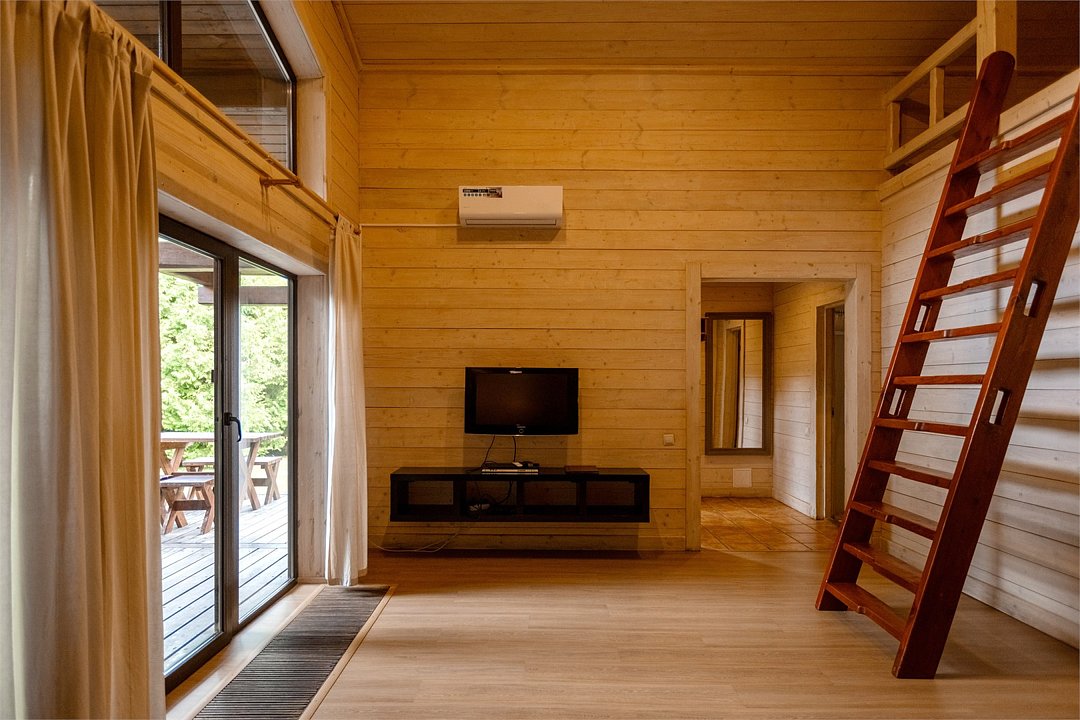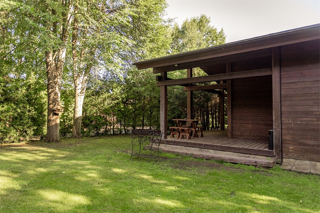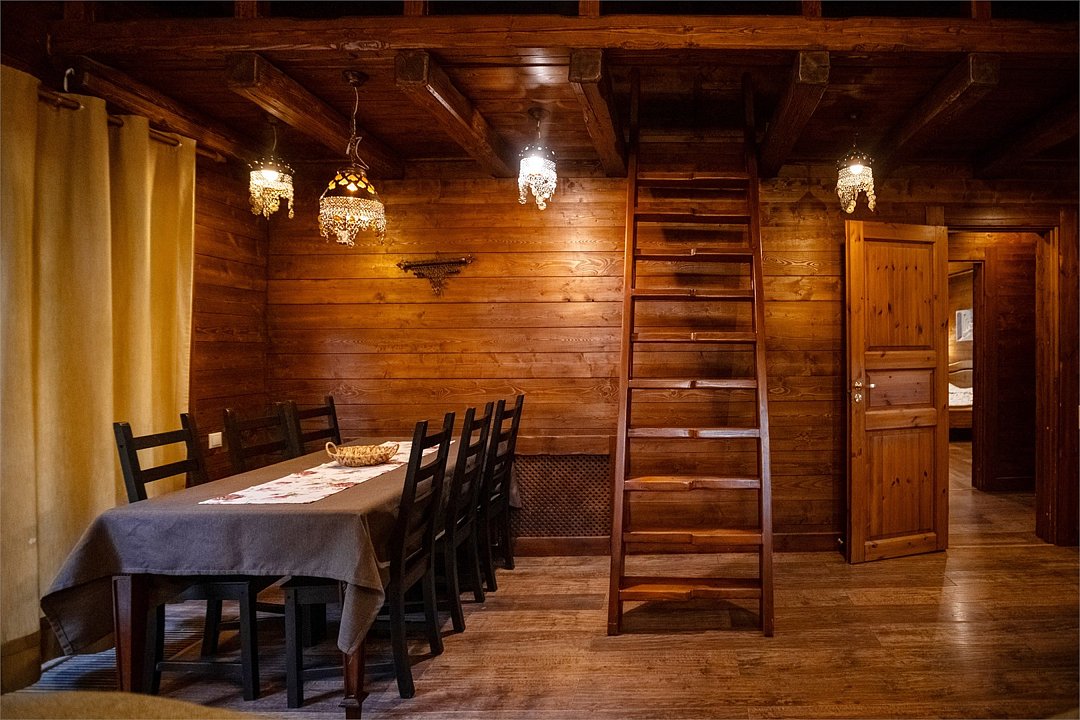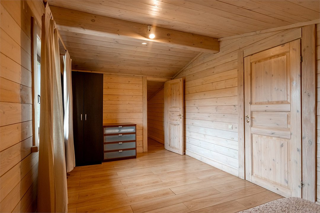 Жемчужина коттеджного комплекса – деревянное шале цвета палисандр, с теплым современным интерьером, в который изысканно вплетены восточные элементы, как, антикварный марокканский комод из темного дерева или дамасская люстра в столовой. Левое крыло шале отведено под финскую сауну и просторную банную зону с бочкой-купелью и сибирским банным чаном под открытым небом. На первом этаже кухня (оснащена посудомоечной машиной), гостиная с уютной каминной зоной и выходом на крытую террасу (с большом круглым столом) и зону барбекю, две изолированные спальни (одна с индивидуальным с/у) и с/у с душевой кабиной. На мансарде расположена третья спальня с видом на гостиную.Услуги и удобства