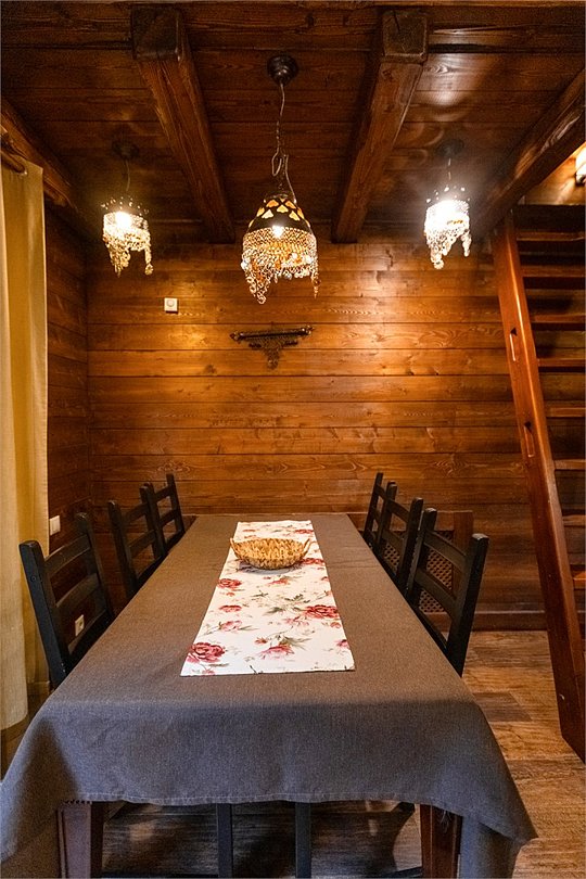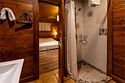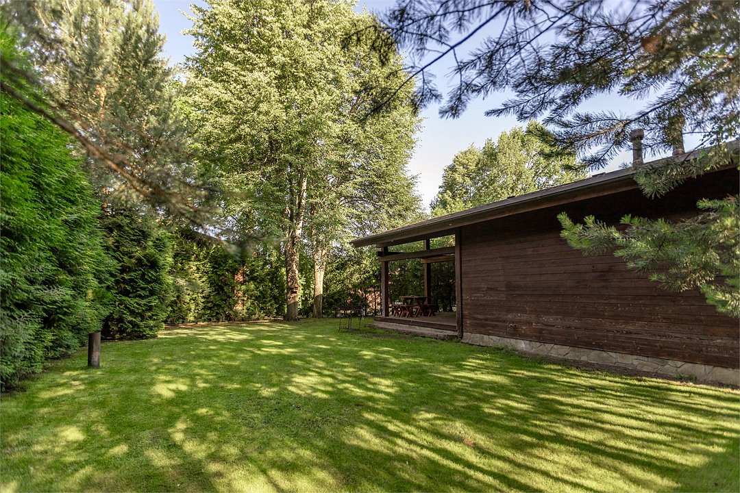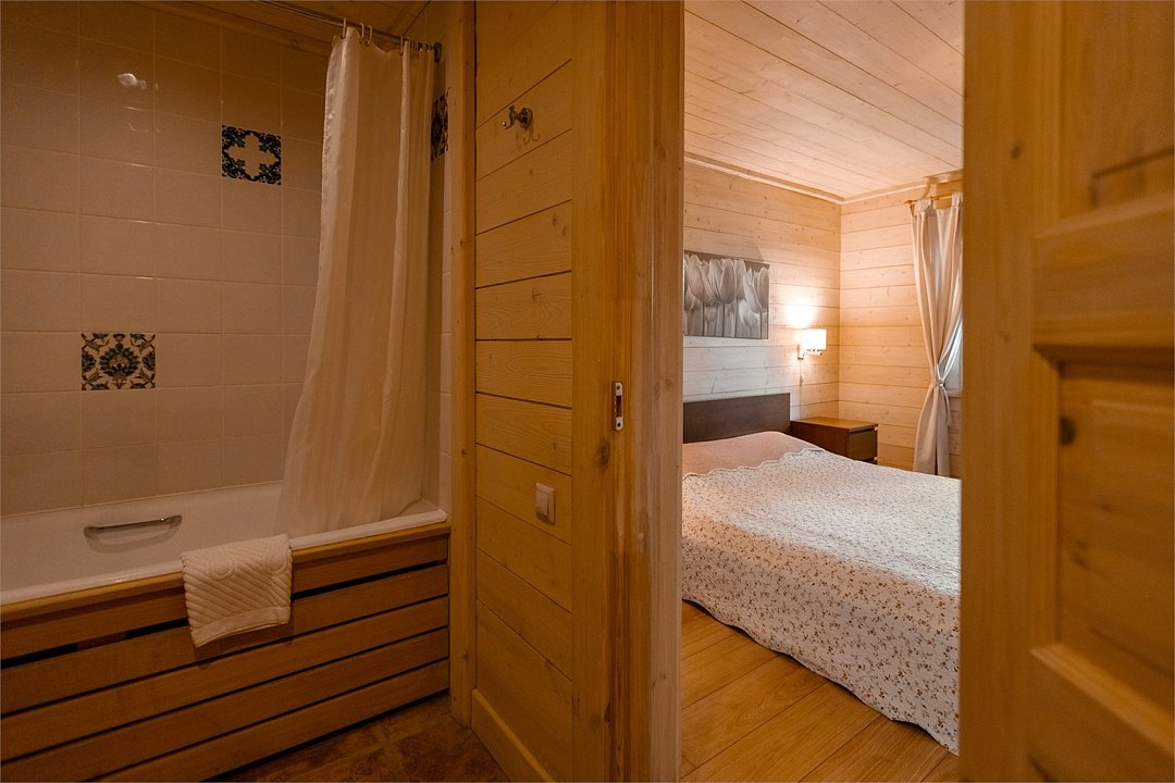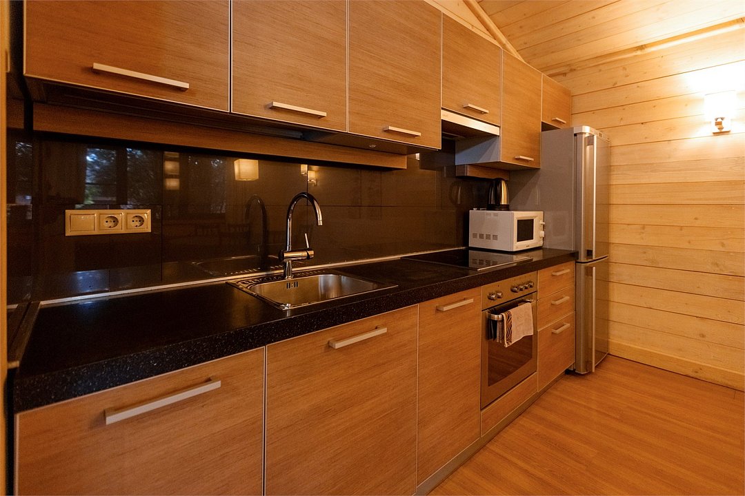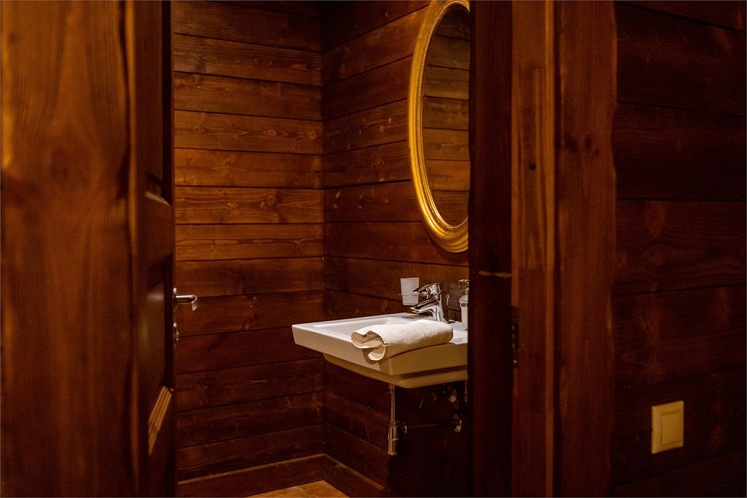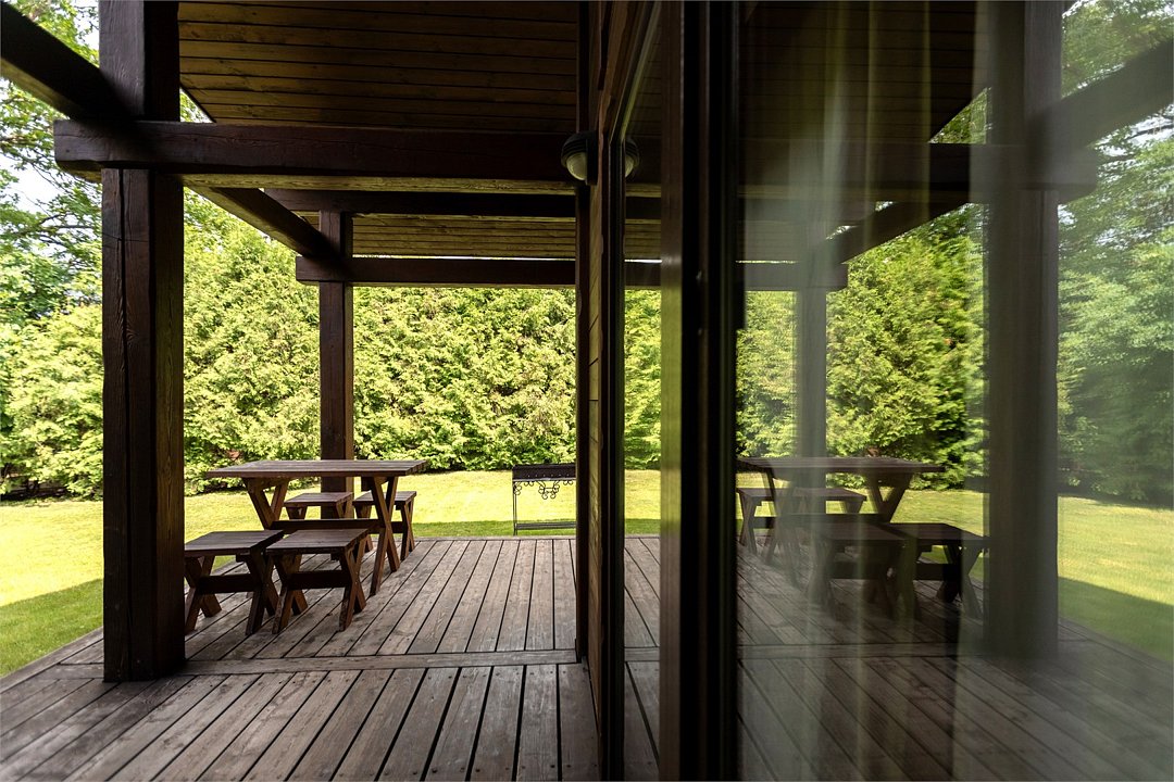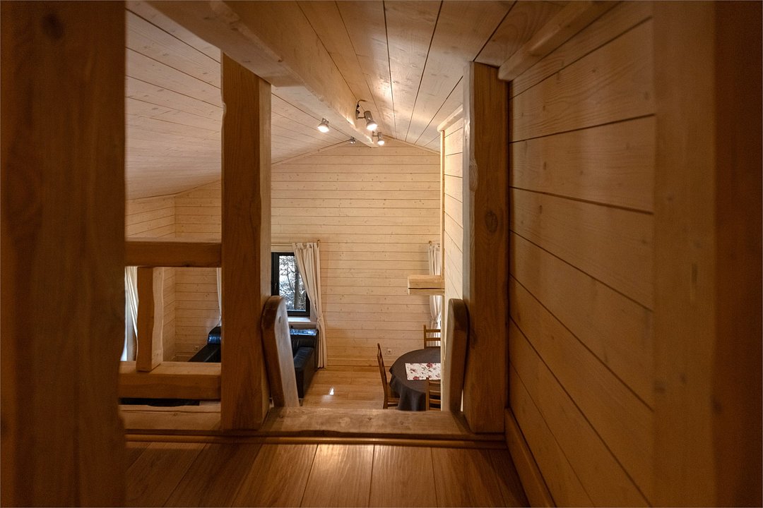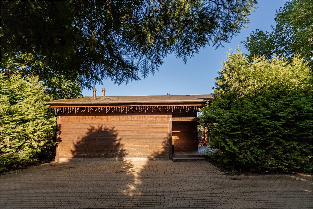 Жемчужина коттеджного комплекса – деревянное шале цвета палисандр, с теплым современным интерьером, в который изысканно вплетены восточные элементы, как, антикварный марокканский комод из темного дерева или дамасская люстра в столовой. Левое крыло шале отведено под финскую сауну и просторную банную зону с бочкой-купелью и сибирским банным чаном под открытым небом. На первом этаже кухня (оснащена посудомоечной машиной), гостиная с уютной каминной зоной и выходом на крытую террасу (с большом круглым столом) и зону барбекю, две изолированные спальни (одна с индивидуальным с/у) и с/у с душевой кабиной. На мансарде расположена третья спальня с видом на гостиную.Услуги и удобства