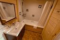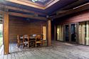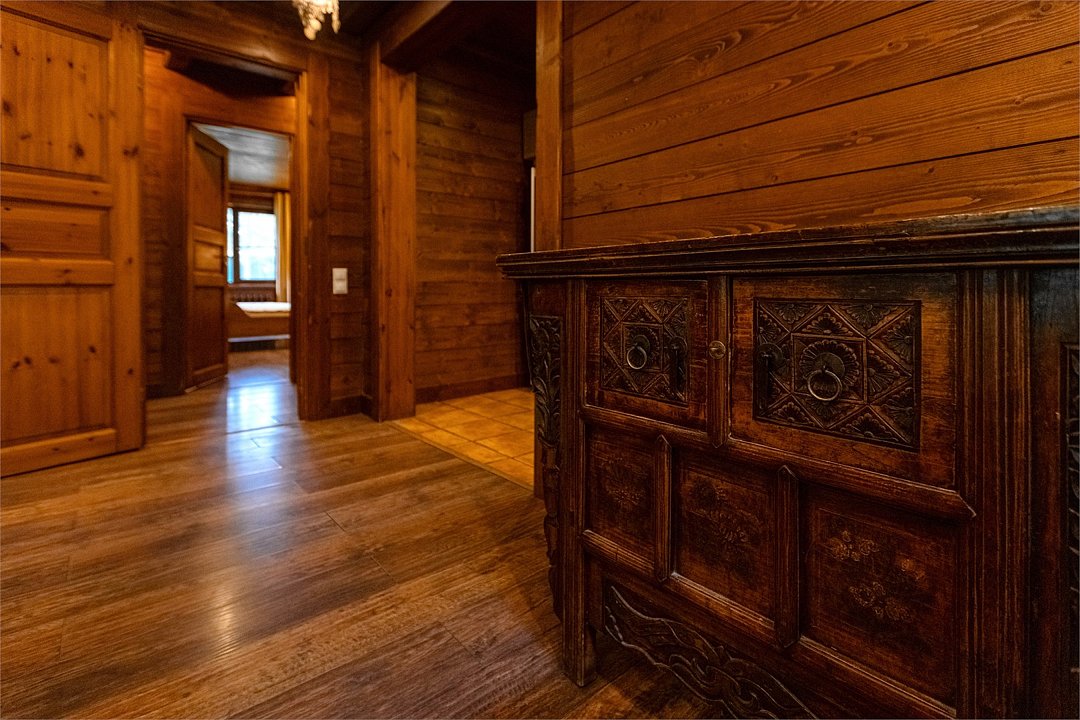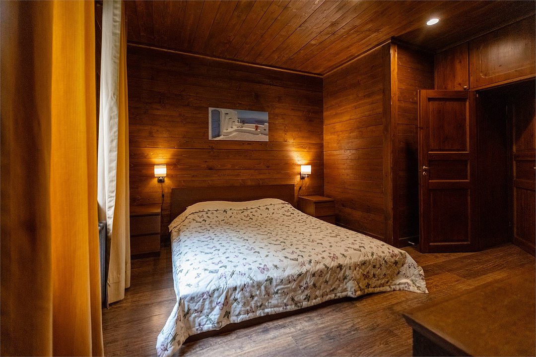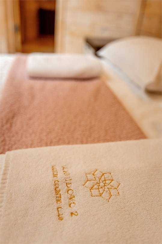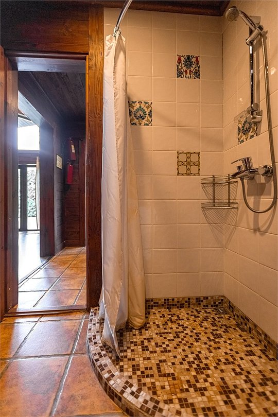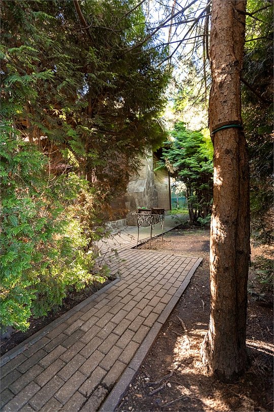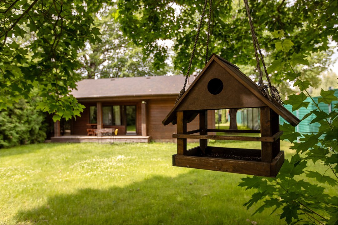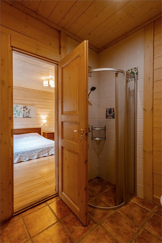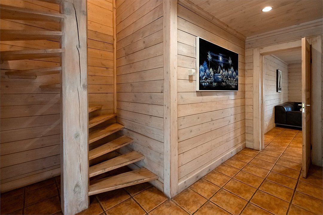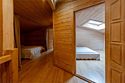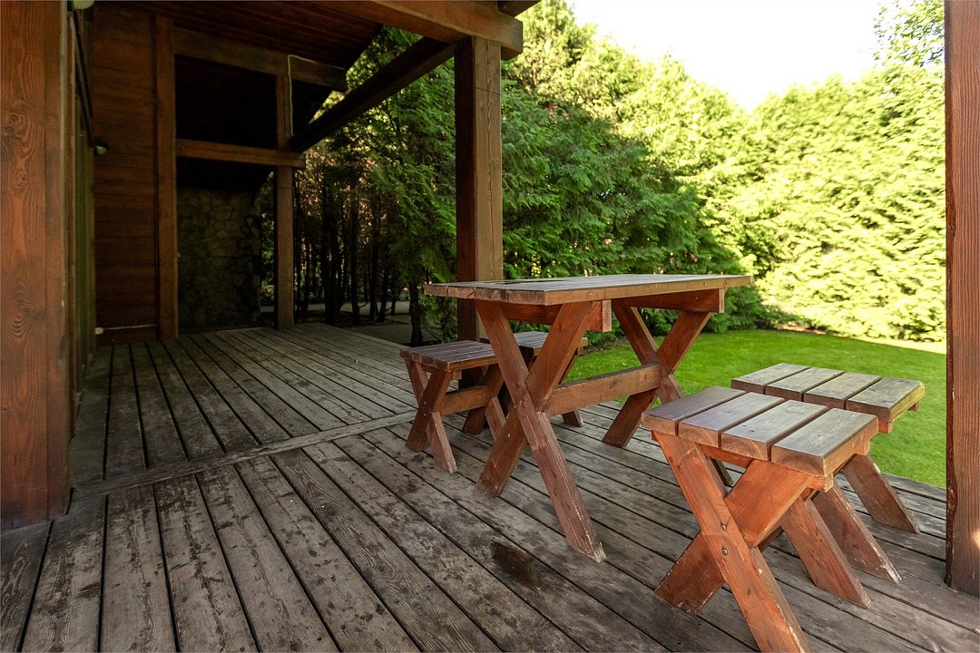 Жемчужина коттеджного комплекса – деревянное шале цвета палисандр, с теплым современным интерьером, в который изысканно вплетены восточные элементы, как, антикварный марокканский комод из темного дерева или дамасская люстра в столовой. Левое крыло шале отведено под финскую сауну и просторную банную зону с бочкой-купелью и сибирским банным чаном под открытым небом. На первом этаже кухня (оснащена посудомоечной машиной), гостиная с уютной каминной зоной и выходом на крытую террасу (с большом круглым столом) и зону барбекю, две изолированные спальни (одна с индивидуальным с/у) и с/у с душевой кабиной. На мансарде расположена третья спальня с видом на гостиную.Услуги и удобства