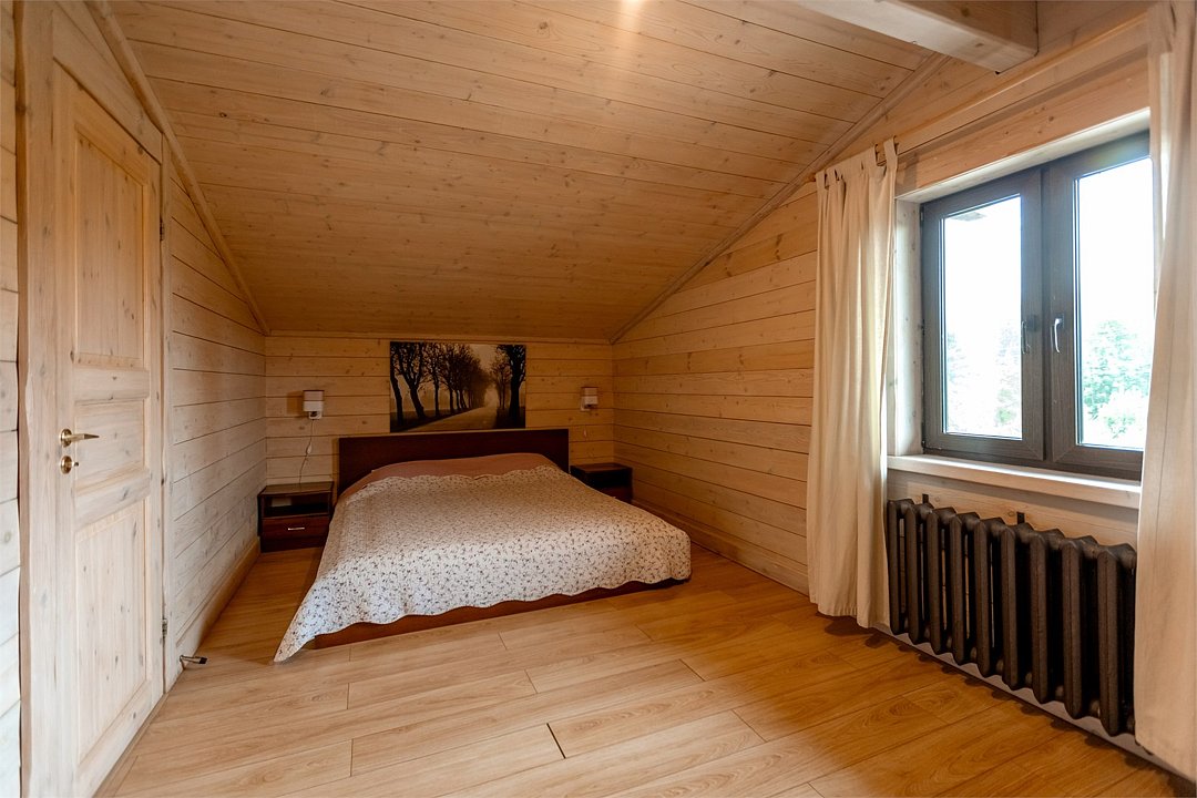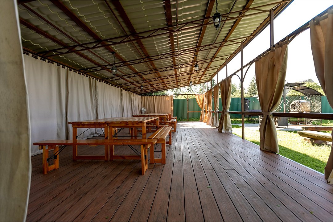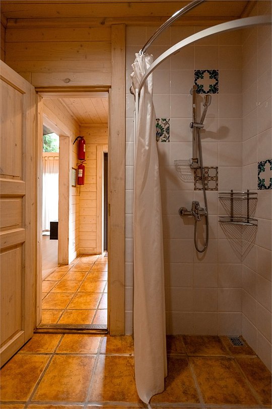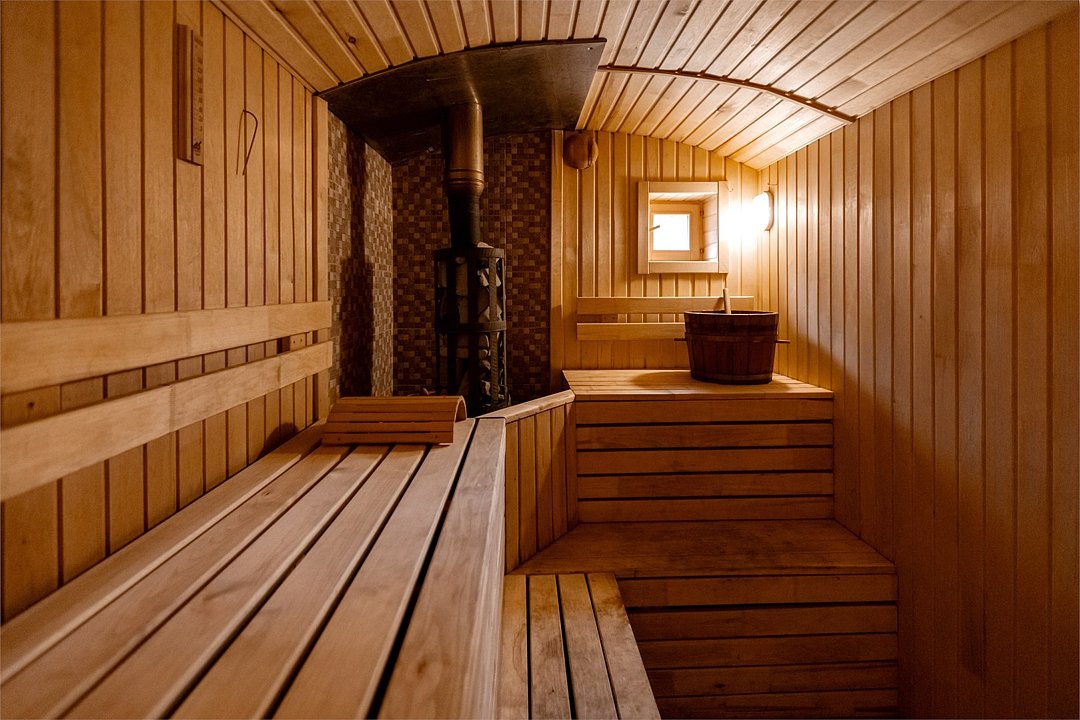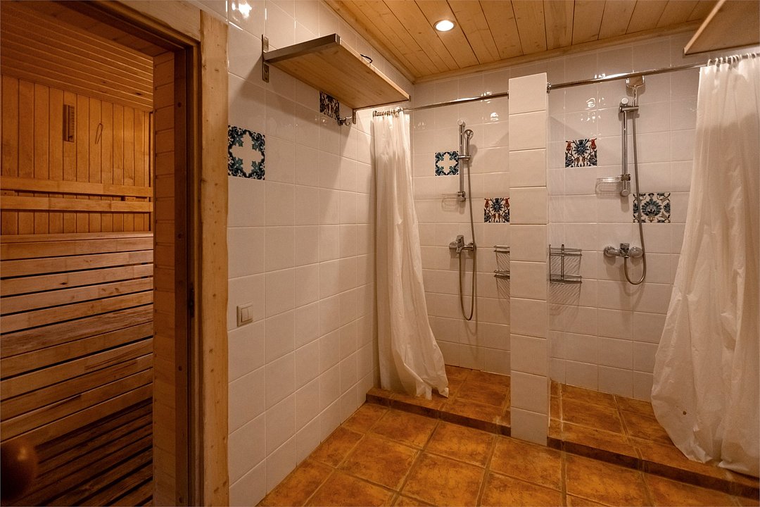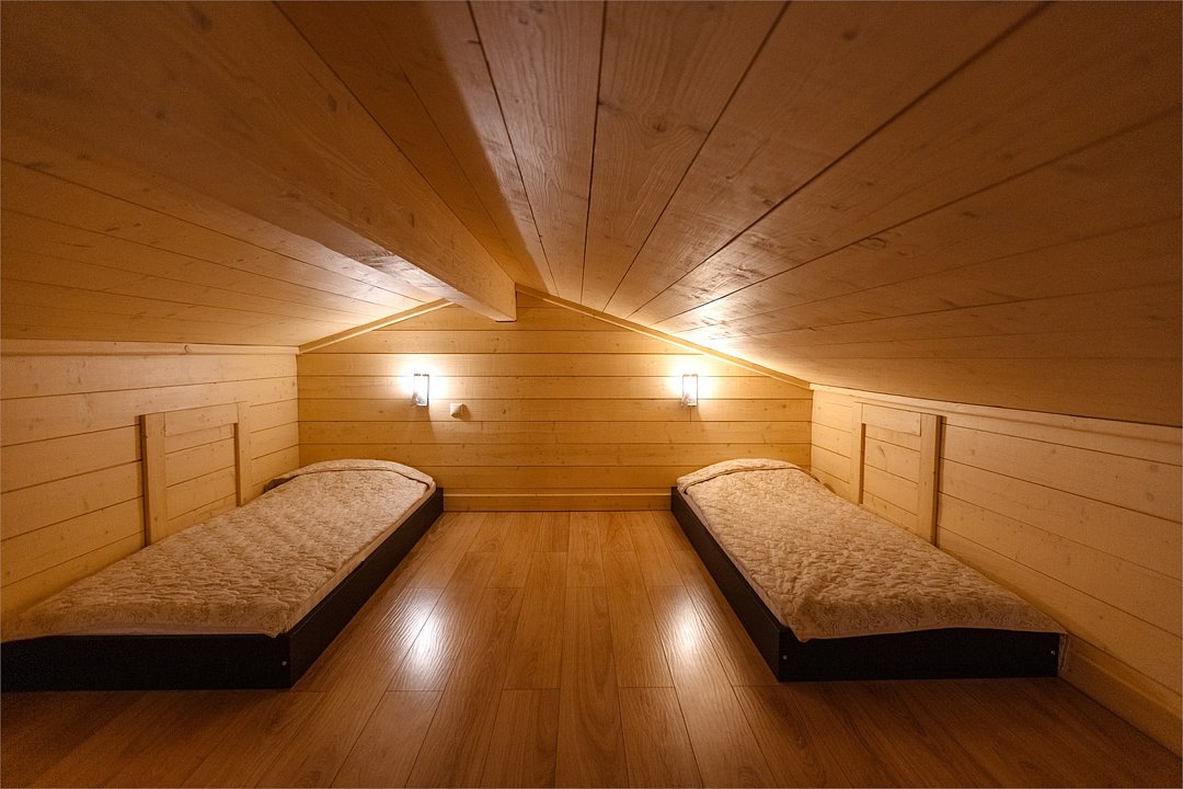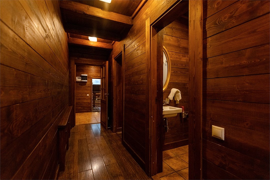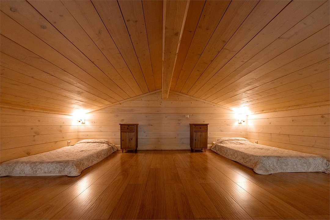 На первом этаже просторная комната отдыха с высокими потолками, парная и помывочная. На втором мансардном этаже расположены массажные кабинеты с прекрасным видом на реку.Можно забронировать только при аренде отделения в Русской бане.Баня по-деревенски