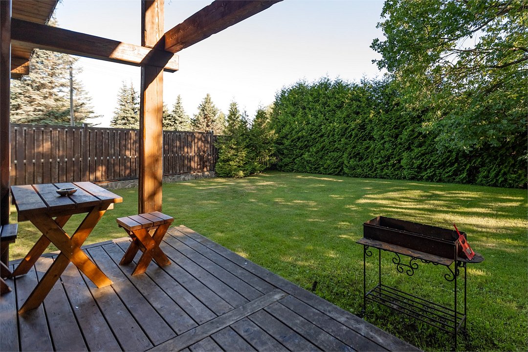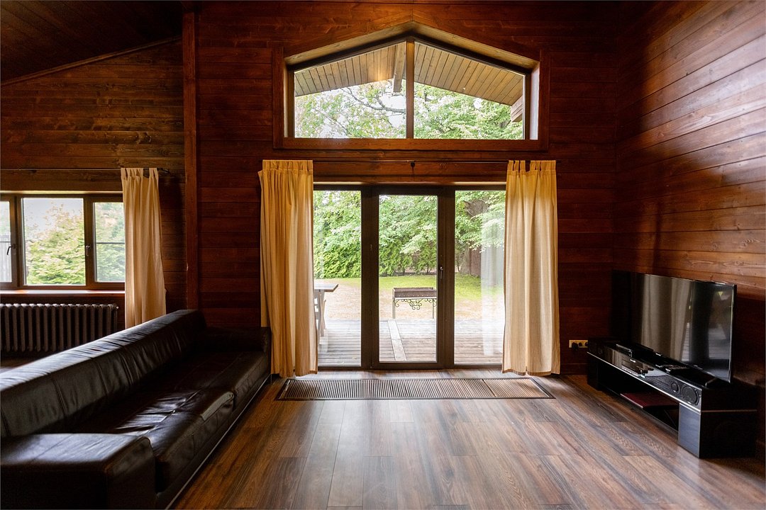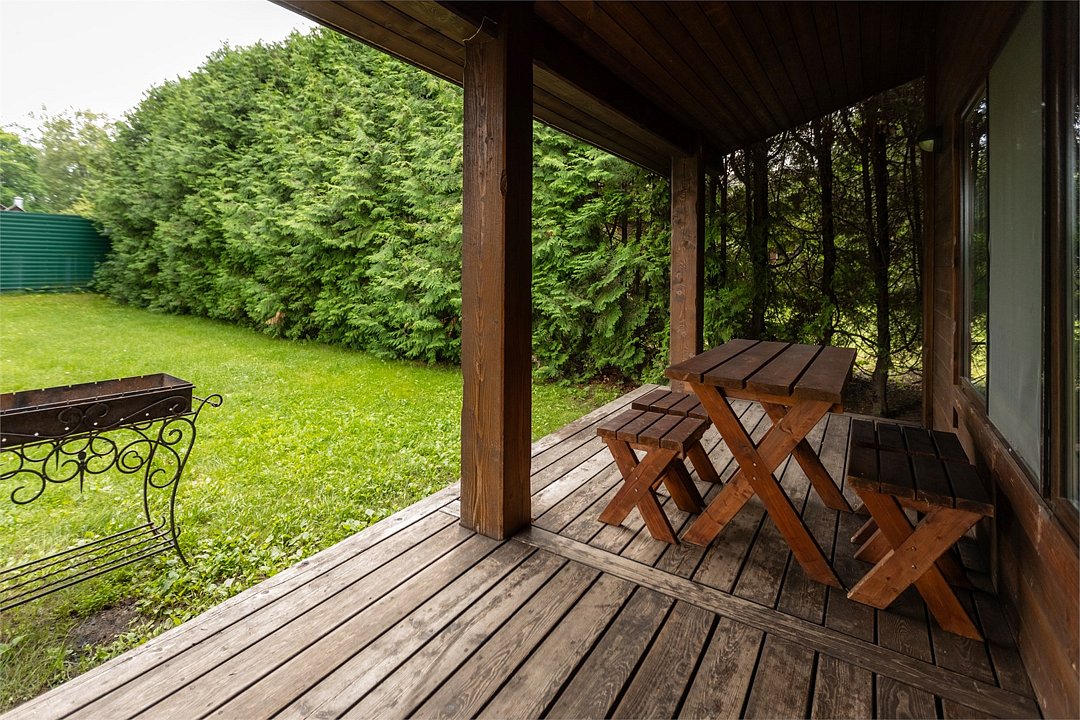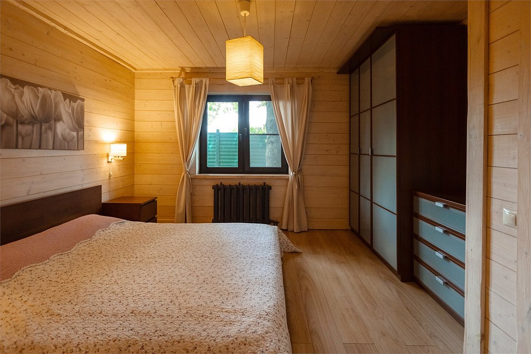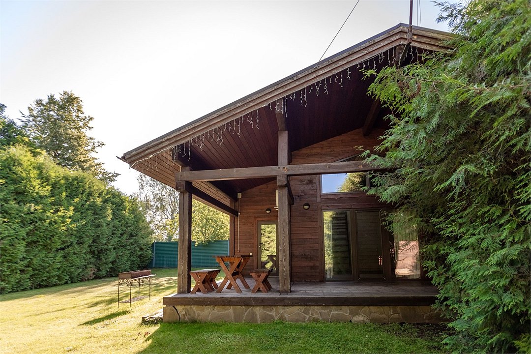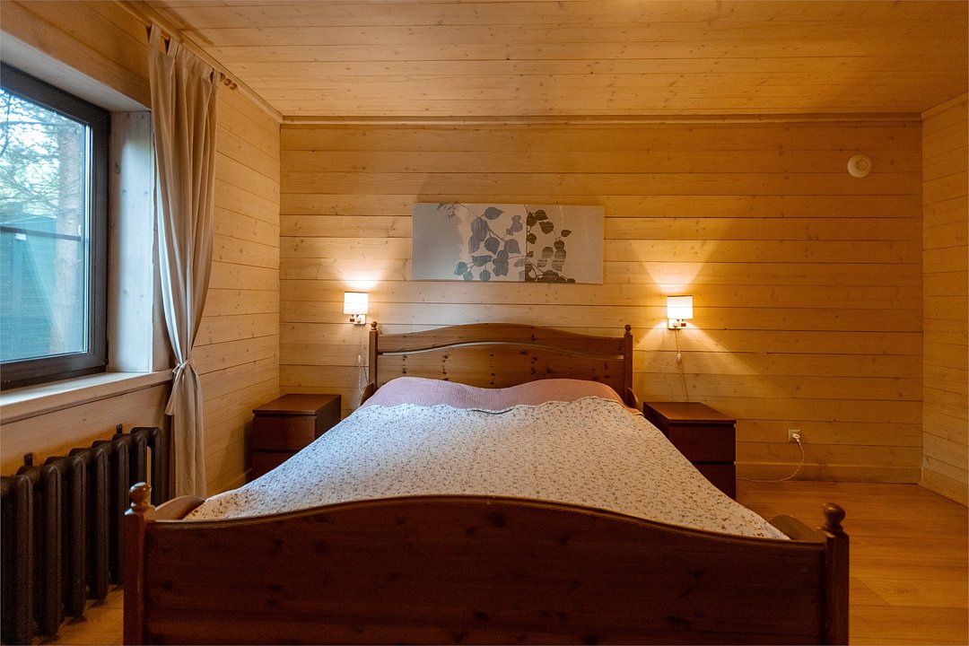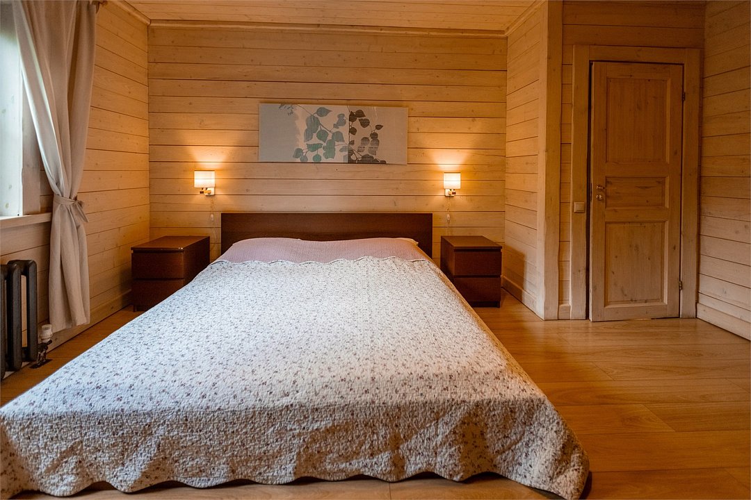 Светлый уютный дом с русской баней, комфортной зоной отдыха и тремя спальными комнатами идеально подходит для любителей попариться в бане на природе. К дому прилегает отдельная территория, огороженная хвойной живой изгородью, с террасой и зоной для барбекю. На первом этаже кухня (оснащена посудомоечной машиной), гостинная, с/у. На втором этаже две изолированные спальни (одна с санузлом) и одна проходная спальня.Услуги и удобства