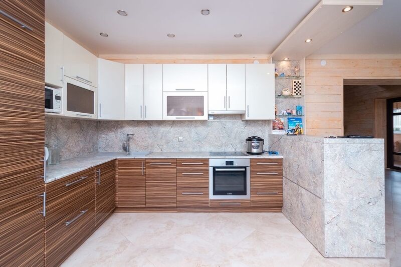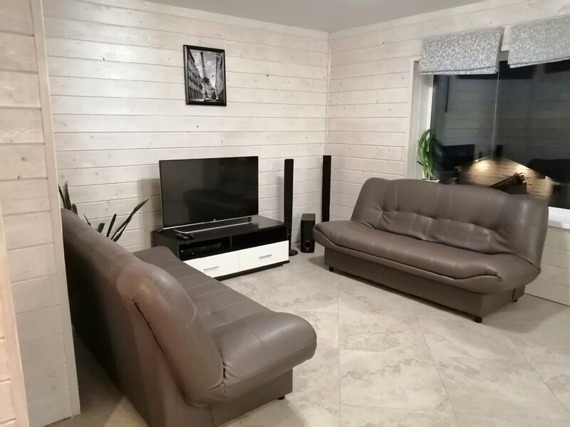На первом этаже расположены просторная гостиная с телевизором, совмещенный санузел со стиральной машиной и полностью оборудованная кухня. На втором этаже находятся три спальные комнаты с комфортными кроватями и раскладными диванами.
