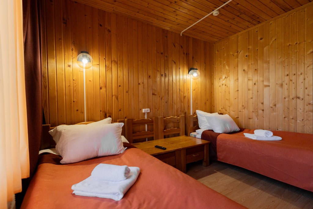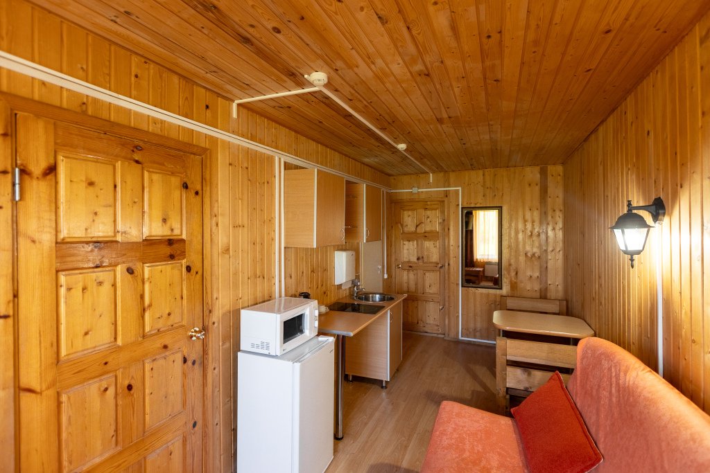 В корпусе есть номера с двумя отдельными комнатами, в каждой из которых: две кровати, платяной шкаф и прикроватные тумбочки. В общем холле — обеденный стол, четыре табурета, чайник, микроволновая печь. Санузел оборудован на два номера.