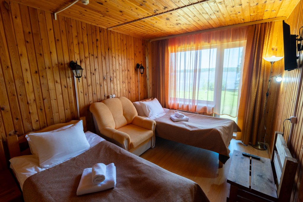 В каждом номере есть кровати, прикроватные тумбочки и платяной шкаф. Мебель сделана из сосны. Собственный санузел. В некоторых номерах есть мини-кухня с электроплитой, чайником, микроволновой печью, посудой и табуретами.