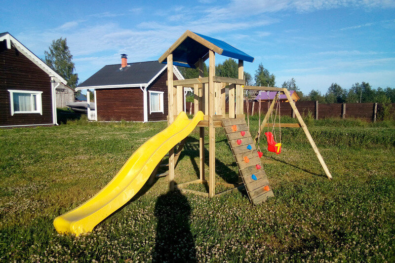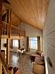 Дом рассчитан на 5 персон. Первый этаж: прихожая; кухня, совмещенная с гостиной; санузел и душевая с сауной. Раскладной диван. Коттедж оборудован камином. Второй этаж: спальня с одной односпальной и двухспальной кроватями, балкон.