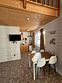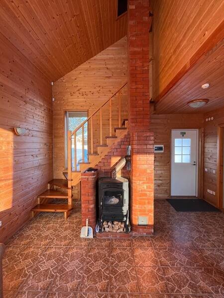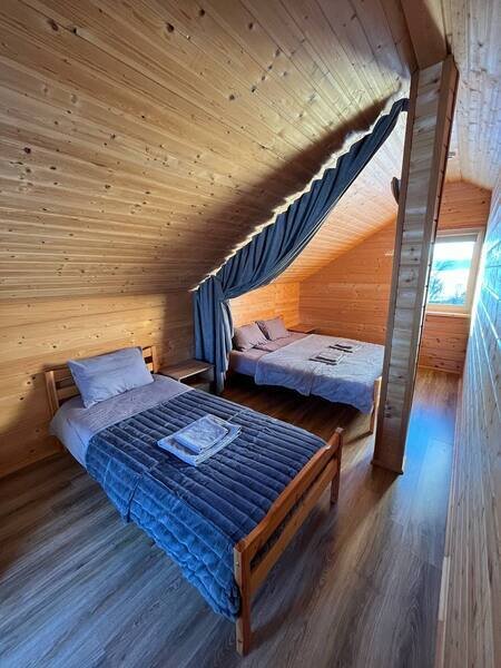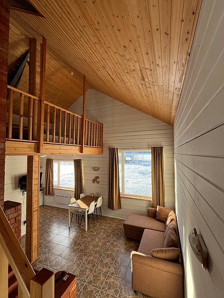 Дом рассчитан на 5 персон. Первый этаж: прихожая; кухня, совмещенная с гостиной; санузел и душевая. Раскладной диван. Коттедж оборудован камином. Второй этаж: спальня с одной односпальной и двухспальной кроватями, балкон.