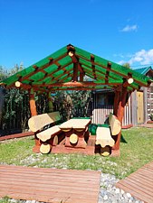 Зона для пикника с мангалом и рубленной беседкой, летняя кухня с доп. плитой, где можно обработать грибы и рыбу. Рядом лес, в 100 метрах свой выход к Озеру и лодка.