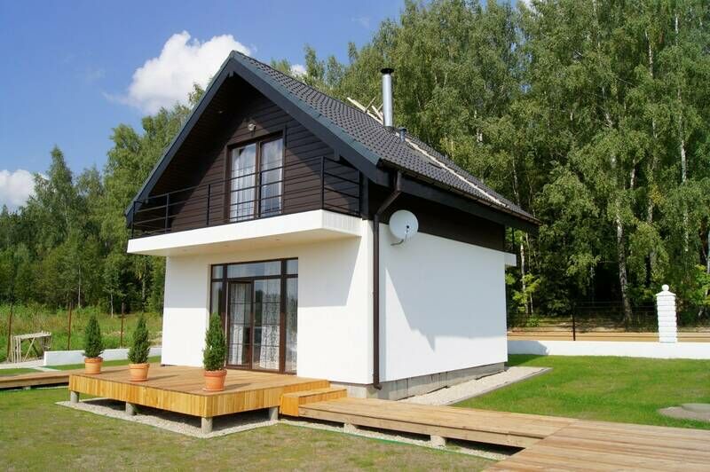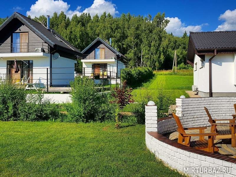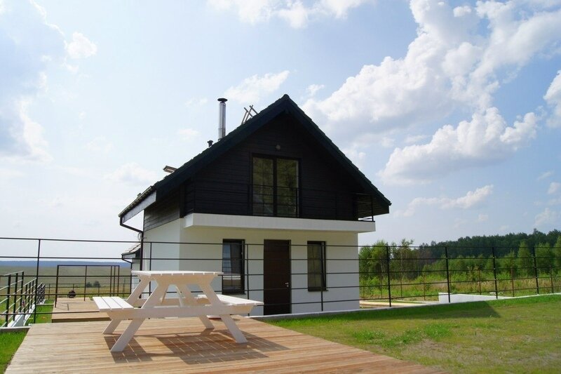 На первом этаже дома располагается гостиная-кухня с панорамными окнами, настоящий дровяной камин, отдельная туалетная комната и душевая. Первый этаж дома оборудован системой теплый пол. На втором этаже расположены 2 спальни, которые имеют отдельные балконы, здесь можно насладиться прекрасным видом. Комфортную температуру в спальнях поддерживают современные радиаторы Kermi. У каждого домика отдельная территория, где можно удобно расположиться на утренний кофе или вечернее чаепитие, приготовить шашлык или барбекю (мангал, наборы дачной мебели входят в комплектацию каждого коттеджа).