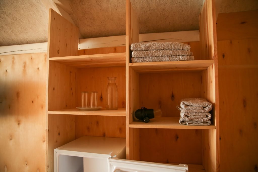 Такой «роскошный глэмпинг» подойдет любителям природы, путешественникам и людям, которым интересно все новое. В домике есть двуспальная кровать, а место для третьего человека или ребенка есть на антресолях под крышей, также домики оснащены вентиляторами на теплое время и обогревателями на холодное время.