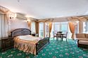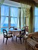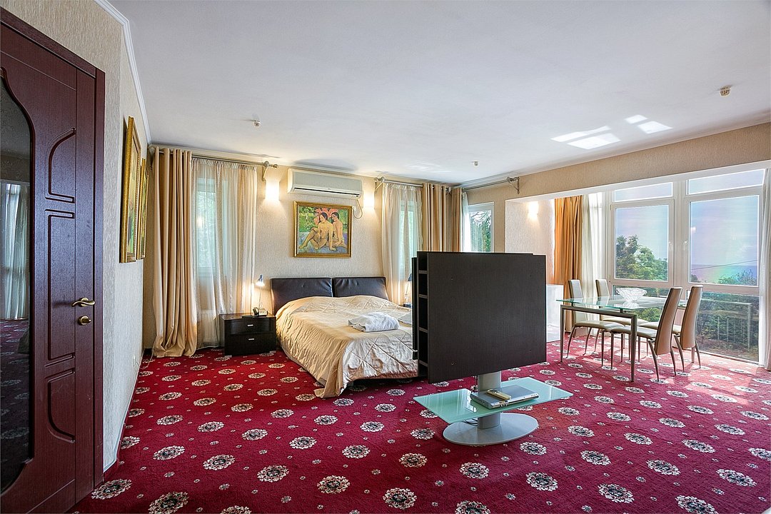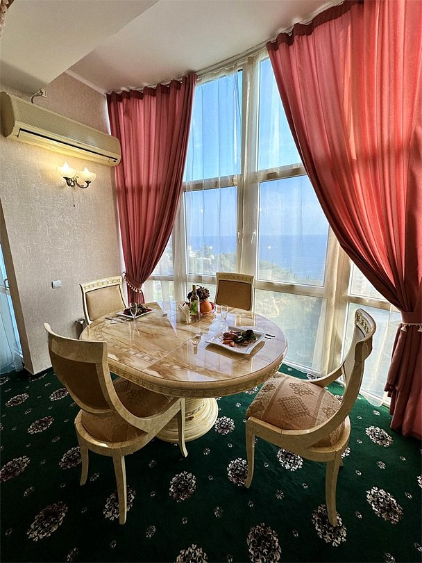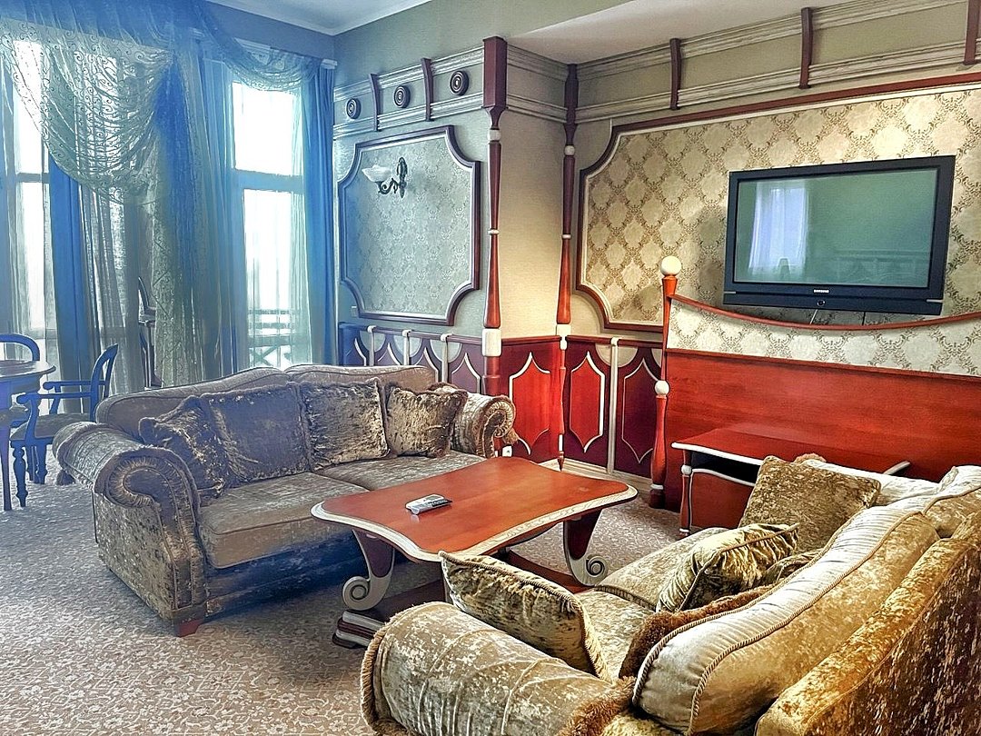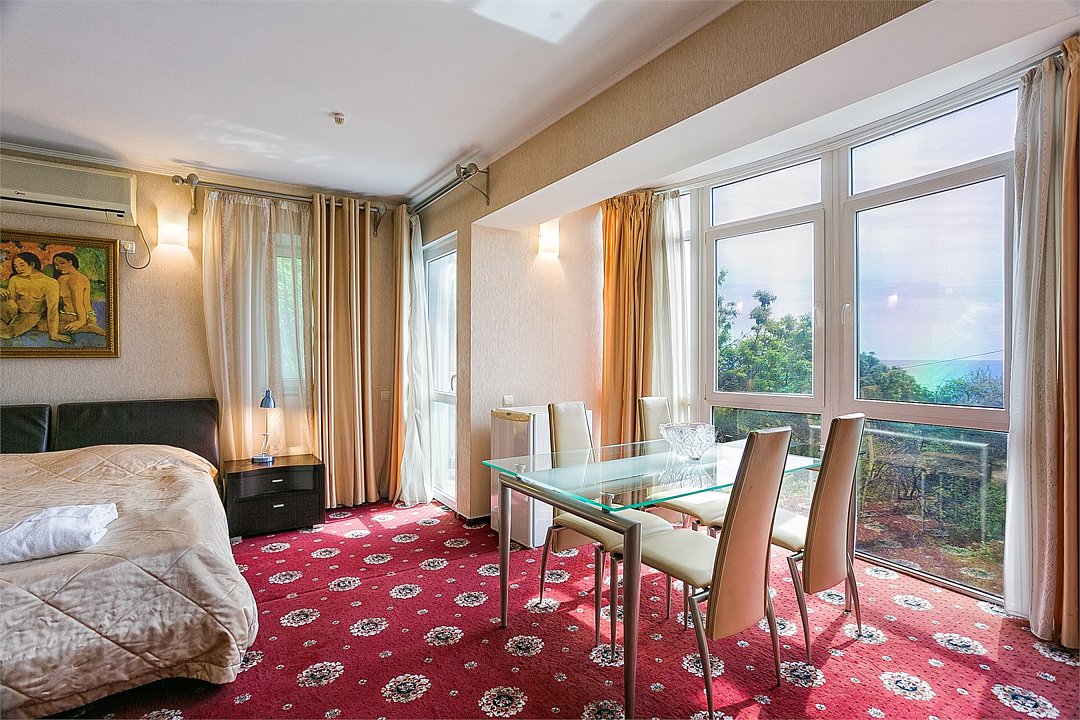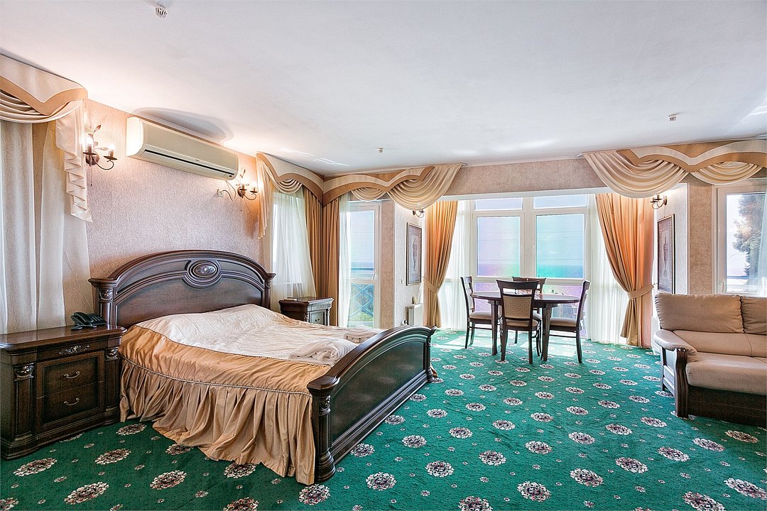 Однокомнатный улучшенный люкс с панорамными окнами с видом на море и парк, расположен на 5 этаже. Номер оснащен двуспальной кроватью, двумя диванами, кондиционером, телевизором со спутниковым ТВ, французским балконом, столом и стульями. Номер имеет винтовую лестницу с выходом на смотровую площадку на крыше отеля. Площадь номера: 61,5 кв.м Сан.узел: джакузи, биде, умывальник со столешницей из натурального камня лабрадорита, туалет. Уборка в номере ежедневно. Смена белья и махровых изделий производится один раз в три дня проживания. ОБРАЩАЕМ ВАШЕ ВНИМАНИЕ: дети до 4-х лет (включительно) размещаются бесплатно с предоставлением дополнительного места до 1-го ребёнка в номере. Если в номере будет проживать двое детей до 4-х лет, то проживание второго ребёнка оплачивается по цене дополнительного места для ребёнка от 5 до 11 лет.Услуги и удобства