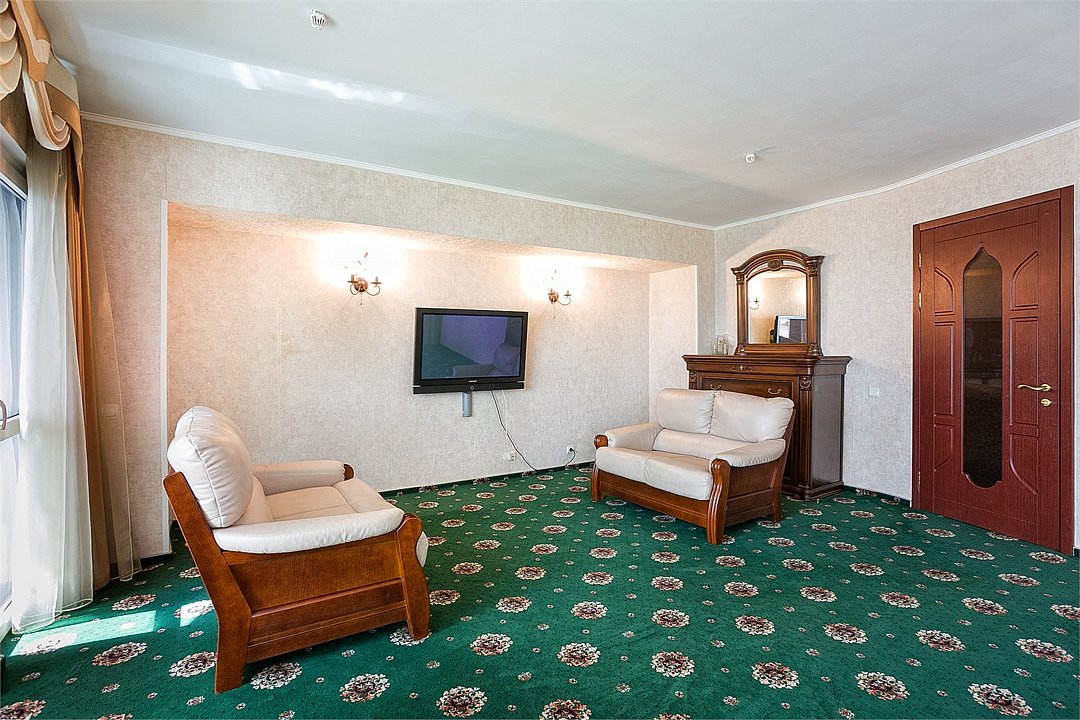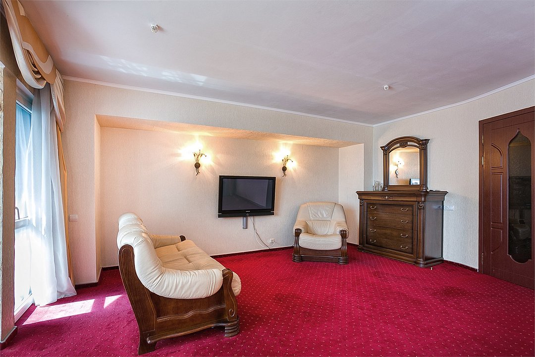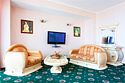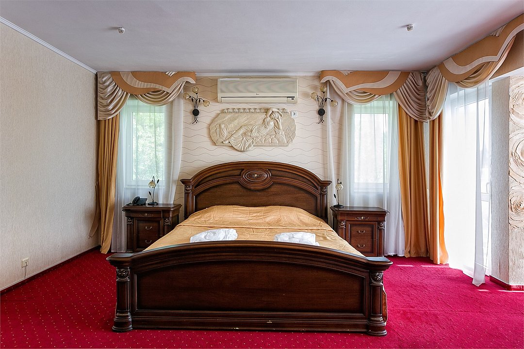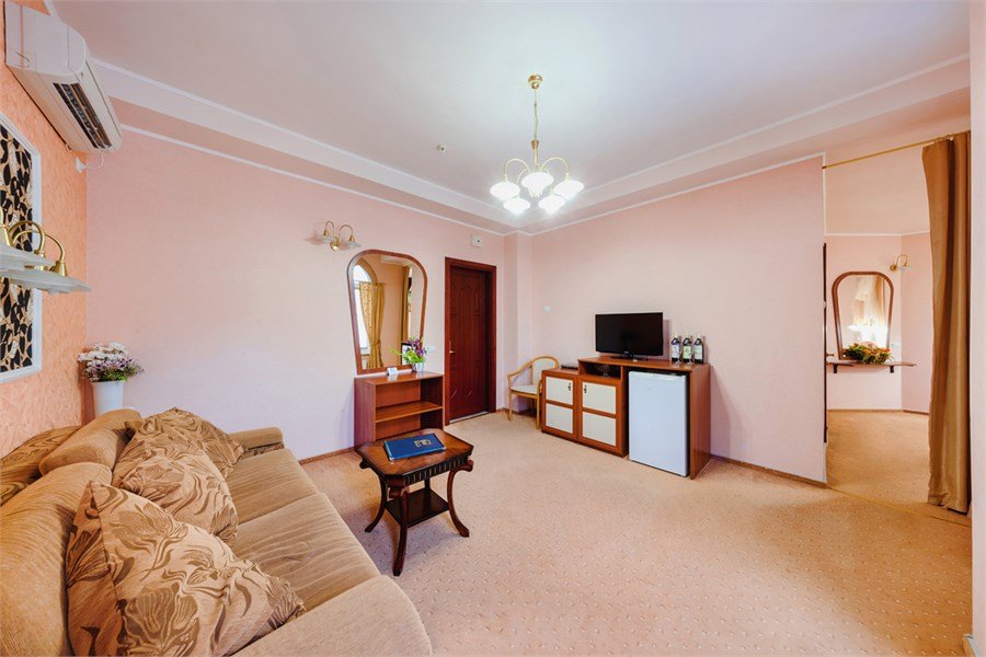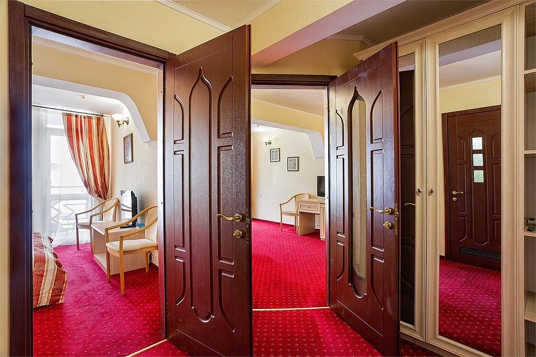Двухкомнатный люкс, расположенный на 4 этаже. Номер с видом на бассейн. Оснащен двуспальной кроватью, двухместным раскладным диваном, двумя кондиционерами, двумя телевизорами со спутниковым ТВ и холодильником. Одна комната проходная. Балкон с мебелью. Площадь номера: 40.1 кв.м Сан.узел: ванна, биде, умывальник со столешницей из натурального камня лабрадорита, туалет. Текущая уборка в номере ежедневно. Смена белья и махровых изделий производится один раз в три дня проживания. ОБРАЩАЕМ ВАШЕ ВНИМАНИЕ: дети до 4-х лет (включительно) размещаются бесплатно с предоставлением дополнительного места до 1-го ребёнка в номере. Если в номере будет проживать двое детей до 4-х лет, то проживание второго ребёнка оплачивается по цене дополнительного места для ребёнка от 5 до 11 лет.Услуги и удобства