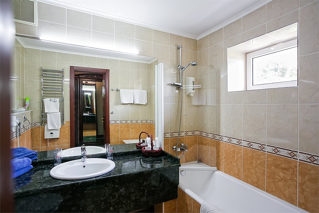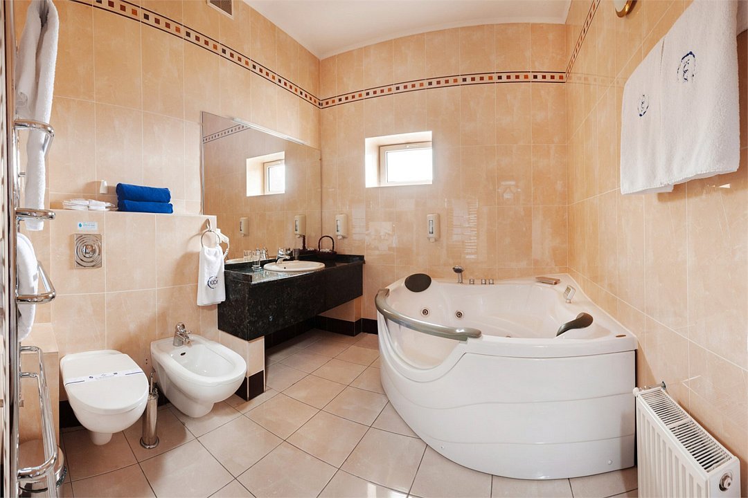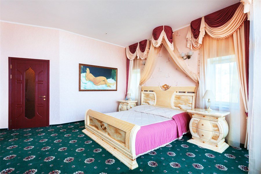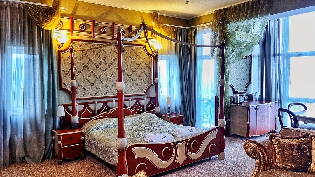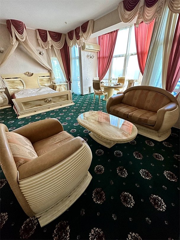 Двухкомнатный люкс, расположенный на 4 этаже. Номер с видом на бассейн. Оснащен двуспальной кроватью, двухместным раскладным диваном, двумя кондиционерами, двумя телевизорами со спутниковым ТВ и холодильником. Одна комната проходная. Балкон с мебелью. Площадь номера: 40.1 кв.м Сан.узел: ванна, биде, умывальник со столешницей из натурального камня лабрадорита, туалет. Текущая уборка в номере ежедневно. Смена белья и махровых изделий производится один раз в три дня проживания. ОБРАЩАЕМ ВАШЕ ВНИМАНИЕ: дети до 4-х лет (включительно) размещаются бесплатно с предоставлением дополнительного места до 1-го ребёнка в номере. Если в номере будет проживать двое детей до 4-х лет, то проживание второго ребёнка оплачивается по цене дополнительного места для ребёнка от 5 до 11 лет.Услуги и удобства