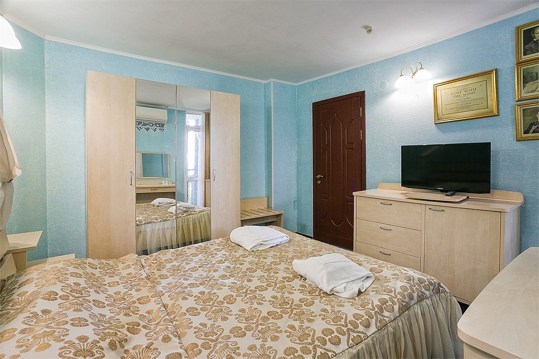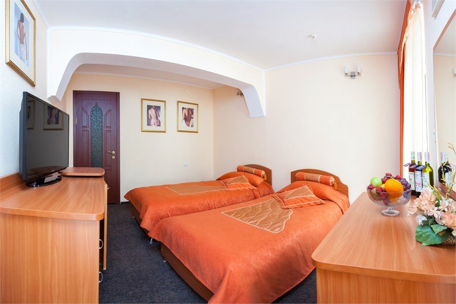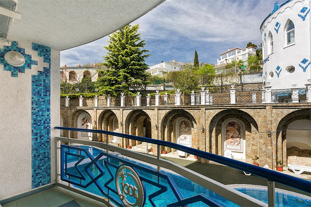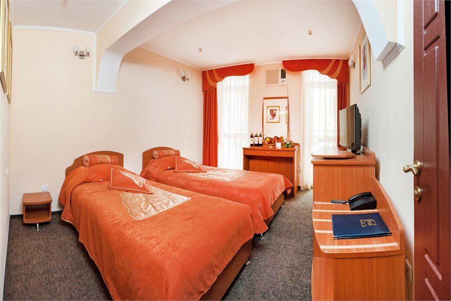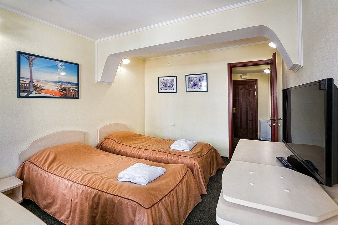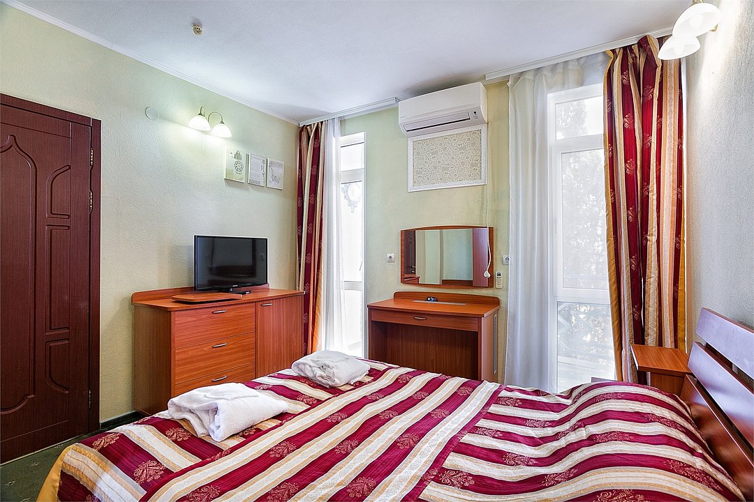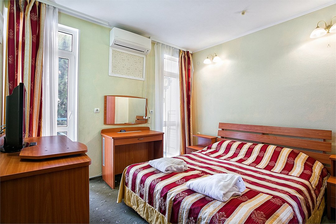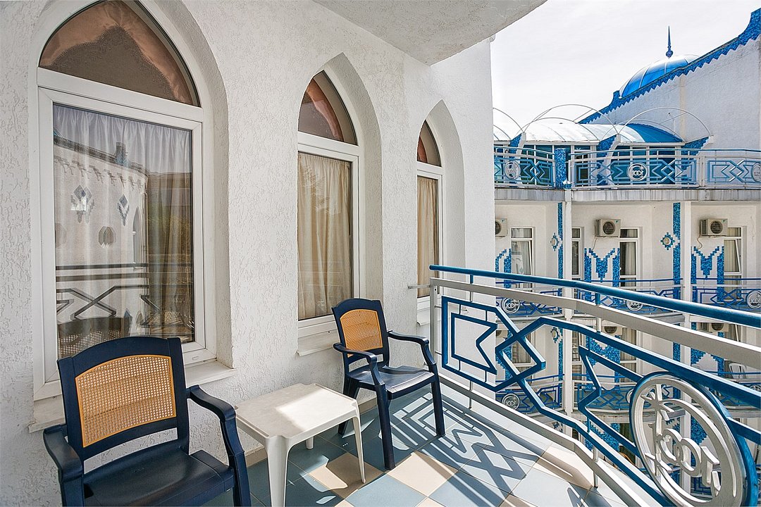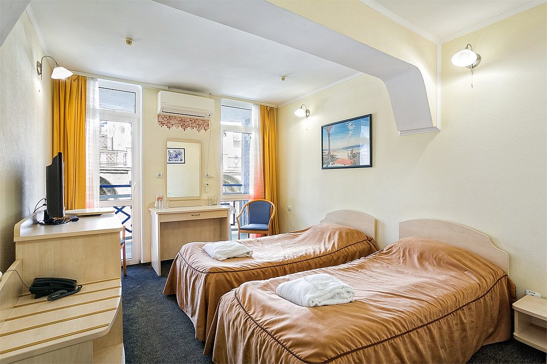 Однокомнатный номер с видом на внутренний дворик и открытый бассейн, расположен на 1 и 2 этажах. Номер оснащен двумя односпальными кроватями, кондиционером, телевизором со спутниковым ТВ и холодильником. Балкон с мебелью. Площадь номера: 22 кв.м Сан.узел: ванна, умывальник со столешницей из натурального камня лабрадорита, туалет. Уборка в номере ежедневно. Смена белья и махровых изделий производится один раз в три дня.Услуги и удобства