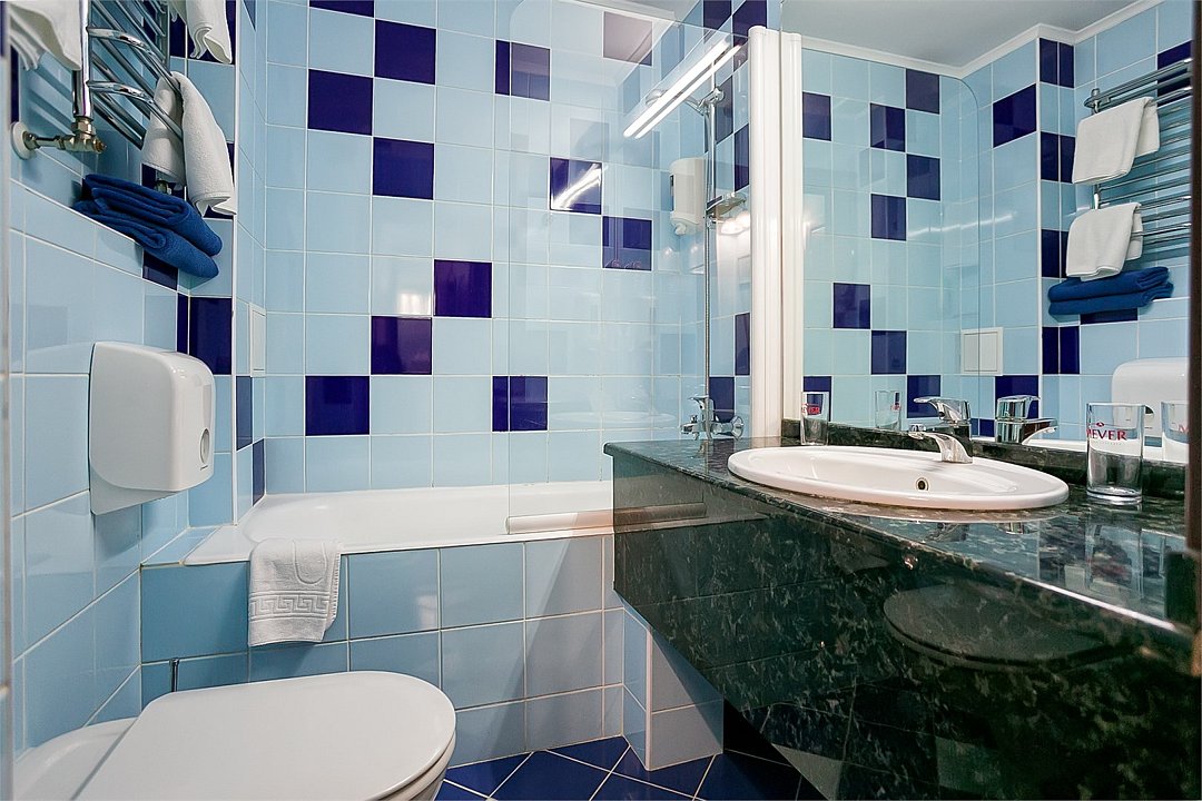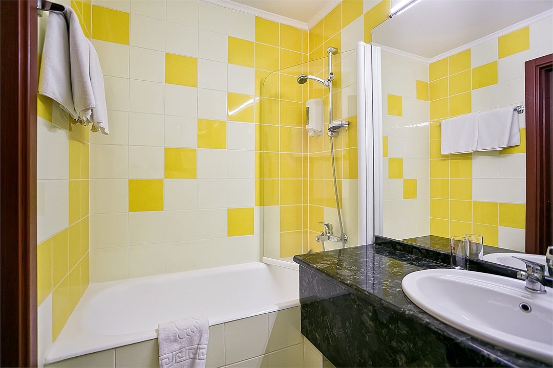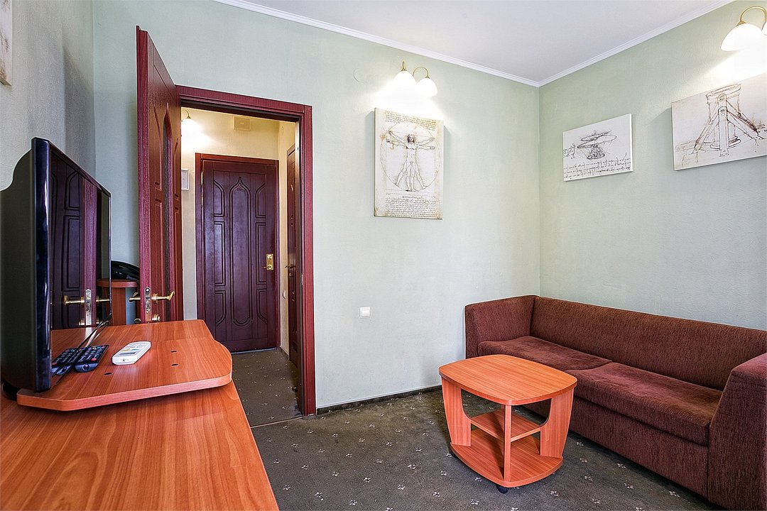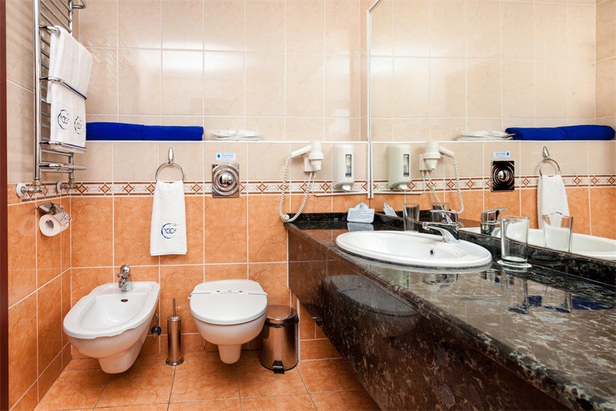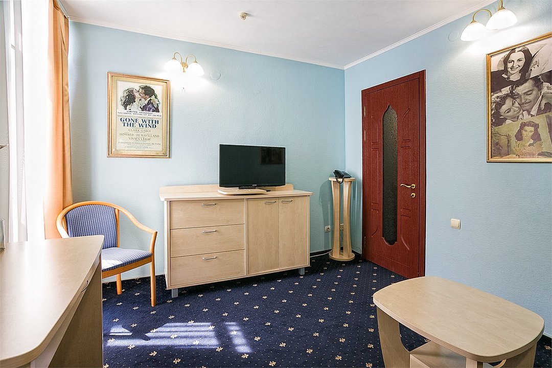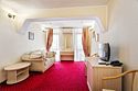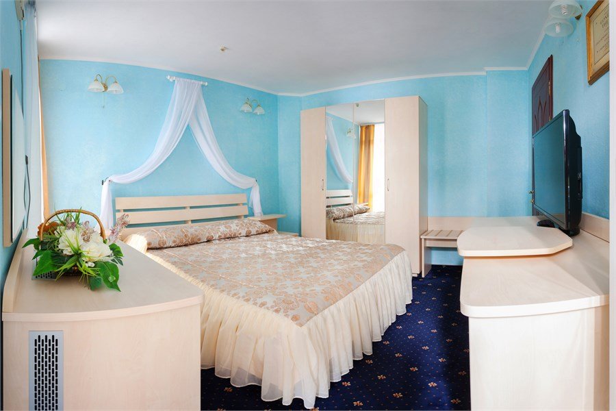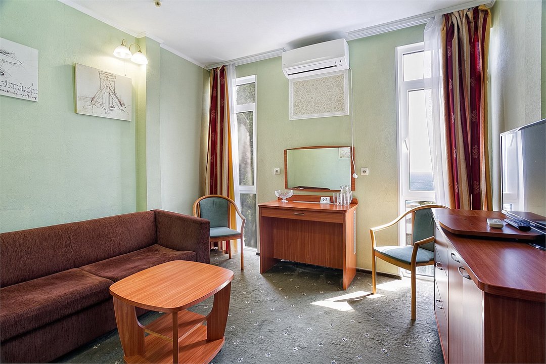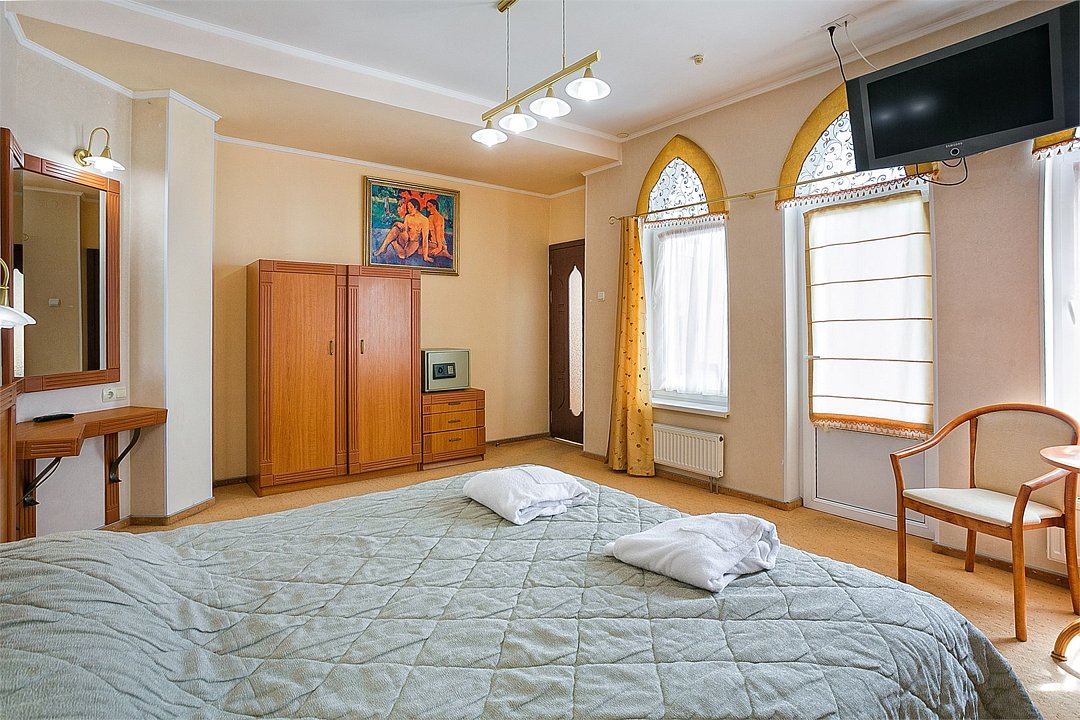 Однокомнатный номер с видом на внутренний дворик и открытый бассейн, расположен на 1 и 2 этажах. Номер оснащен двумя односпальными кроватями, кондиционером, телевизором со спутниковым ТВ и холодильником. Балкон с мебелью. Площадь номера: 22 кв.м Сан.узел: ванна, умывальник со столешницей из натурального камня лабрадорита, туалет. Уборка в номере ежедневно. Смена белья и махровых изделий производится один раз в три дня.Услуги и удобства