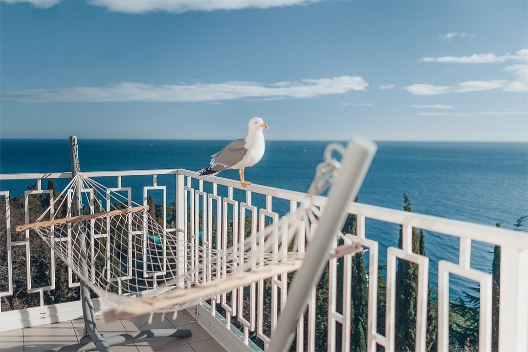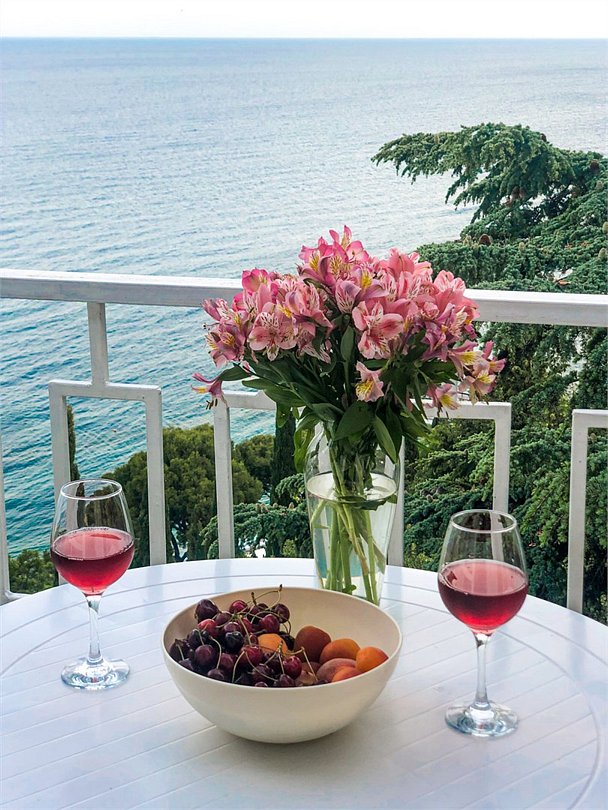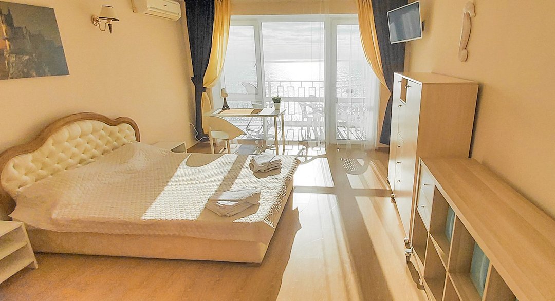телевизор, Wi-Fi, холодильник, кондиционер, балкон, двуспальная кровать, шкаф для одежды, обеденный стол, зеркало, набор посуды, душ, вид на море, стаканы, столовые приборы, стул, стол, сушилка для белья, цифровое тв, затемняющая штора, можно с питомцамиВ номере