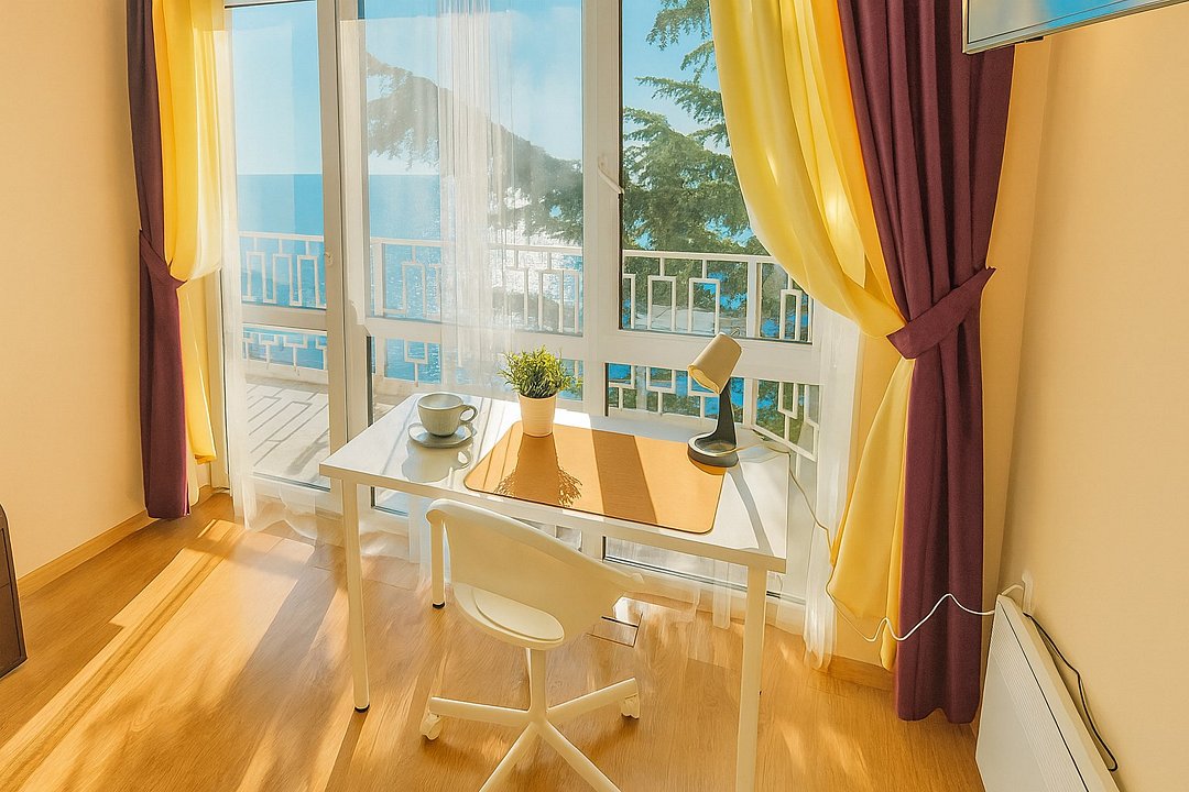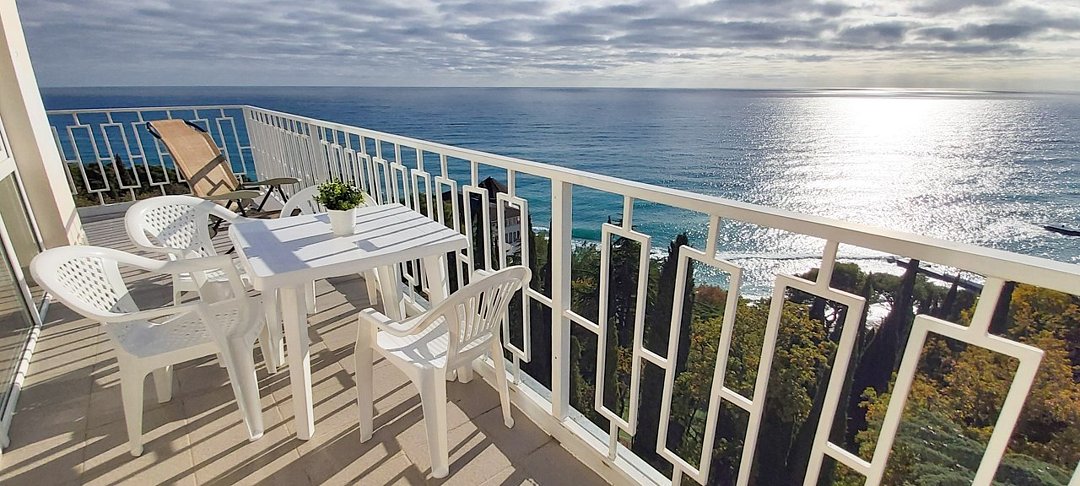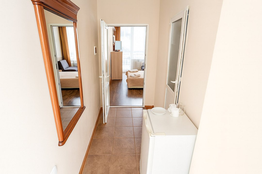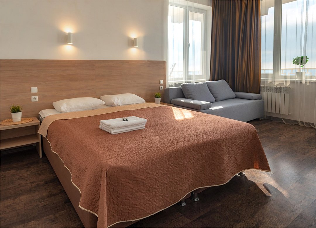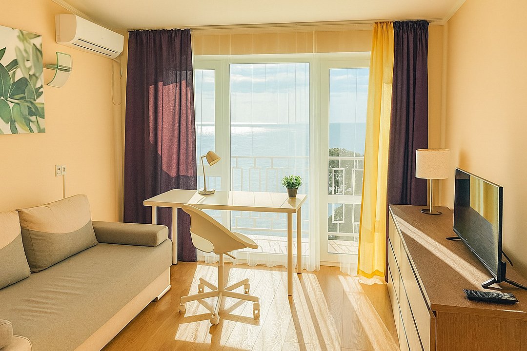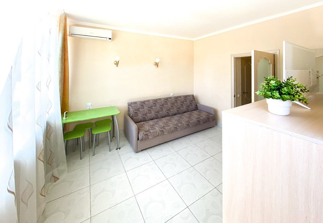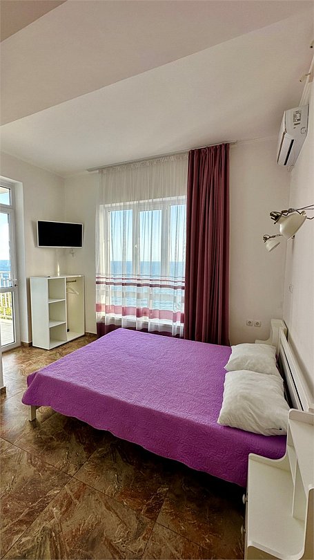 Люкс с мини-кухней площадью 52 м2- двухкомнатный номер с ванной комнатой и балконом. Каждая деталь продумана для вашего комфорта, две спальни: двуспальная кровать и раскладной диван, постельное белье, столик, телевизор, WI-FI, мини- кухня, микроволновая печь, мультиварка, обеденная зона, кондиционер, фен. Санузел оборудован: ванна, стиральная машина, набор полотенец, ванные принадлежности. С балкона открывается панорамный вид на море! Номер расположен на 4 этаже.Услуги и удобства