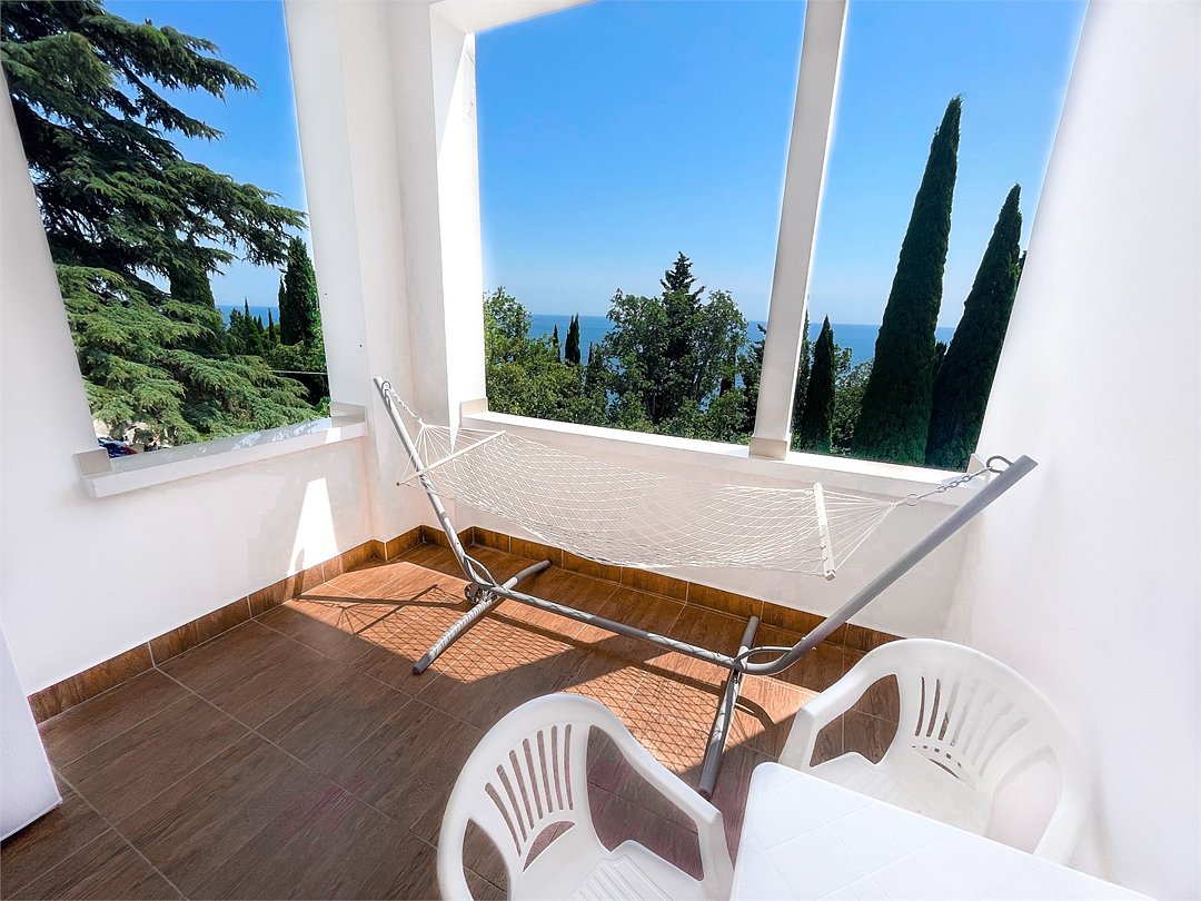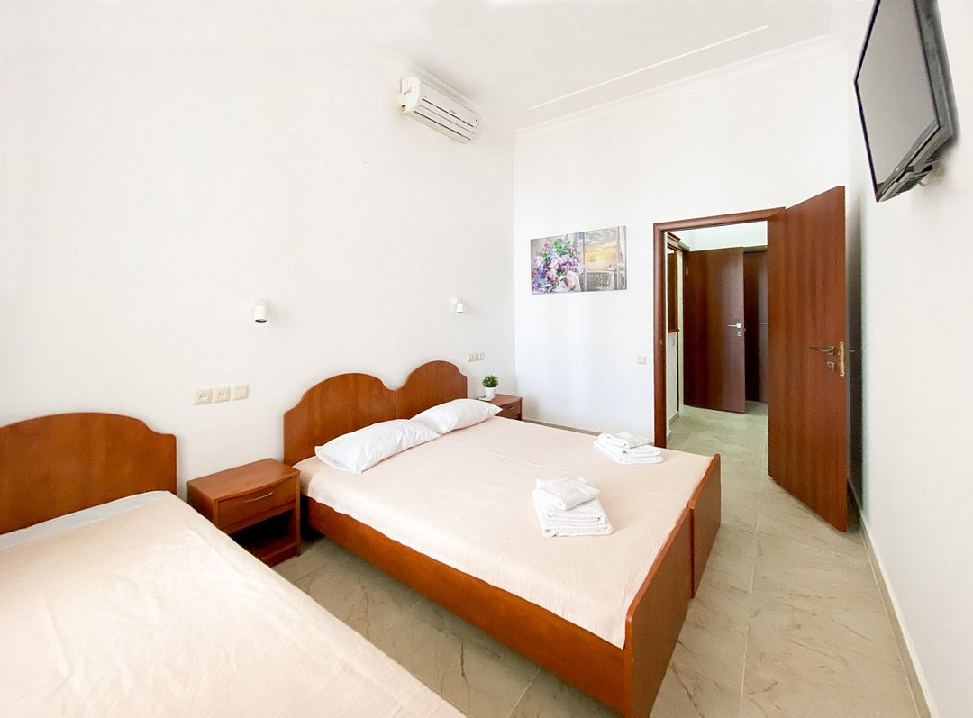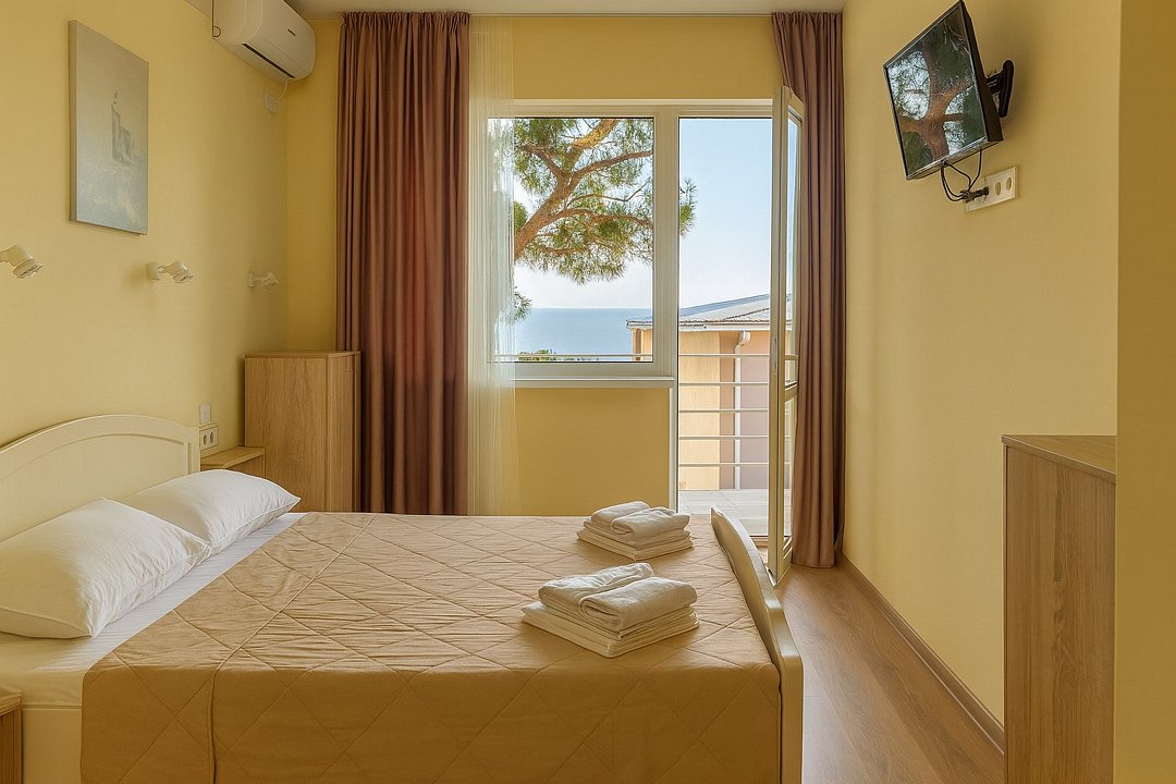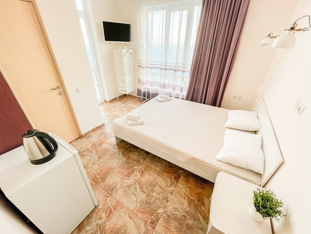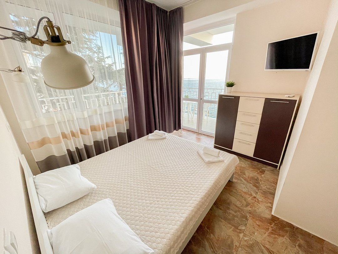 Wi-Fi, холодильник, кондиционер, терраса, двуспальная кровать, односпальная кровать, тумбы, стулья, вешалки, обеденный стол, зеркало, набор посуды, чайник, душ, вид на море, стаканы, столовые приборы, стул, стол, цифровое тв, затемняющая штора, можно с питомцамиВ номере