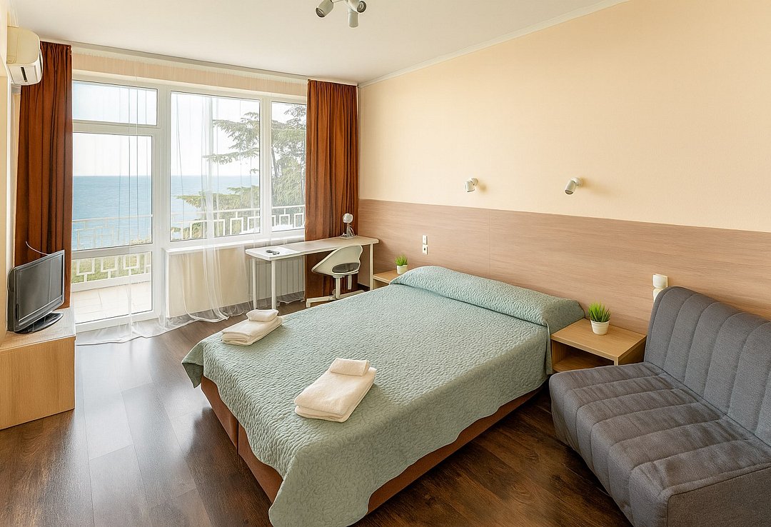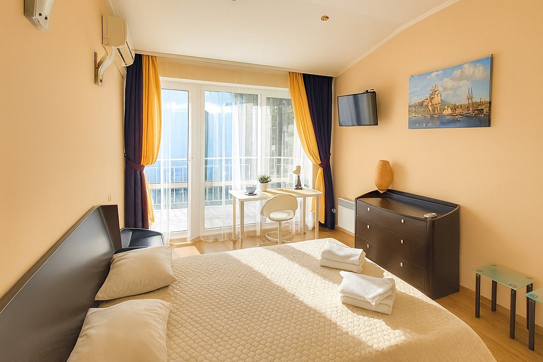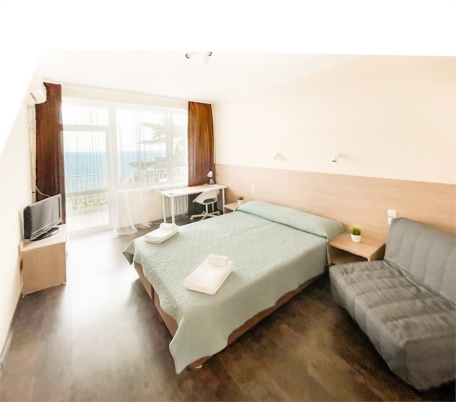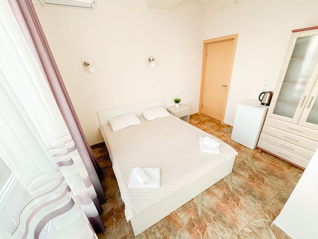 Номер «Евростандарт» – это однокомнатный номер с ванной комнатой и балконом. Площадь номера – 22 кв.м.. В номере: двухспальная кровать, раскладное кресло-кровать, кондиционер, настенное зеркало, мини-холодильник, письменный столик, светильники, телевизор, фен. К Вашим услугам: WI-FI, ванные принадлежности, набор полотенец. С балкона открывается панорамный вид на море! Номер расположен на 1-3 этаже. Добро пожаловать в отель Эллада!Услуги и удобства
