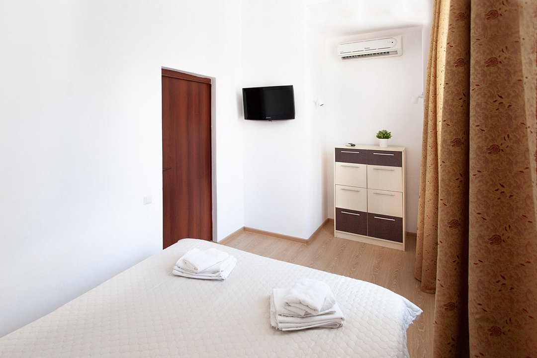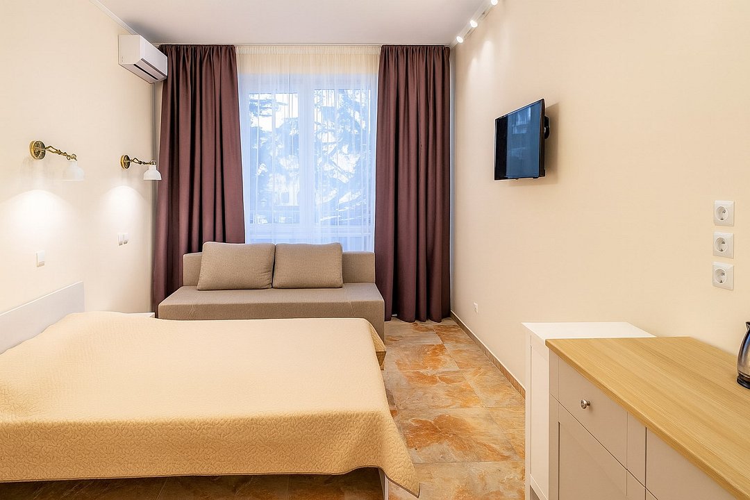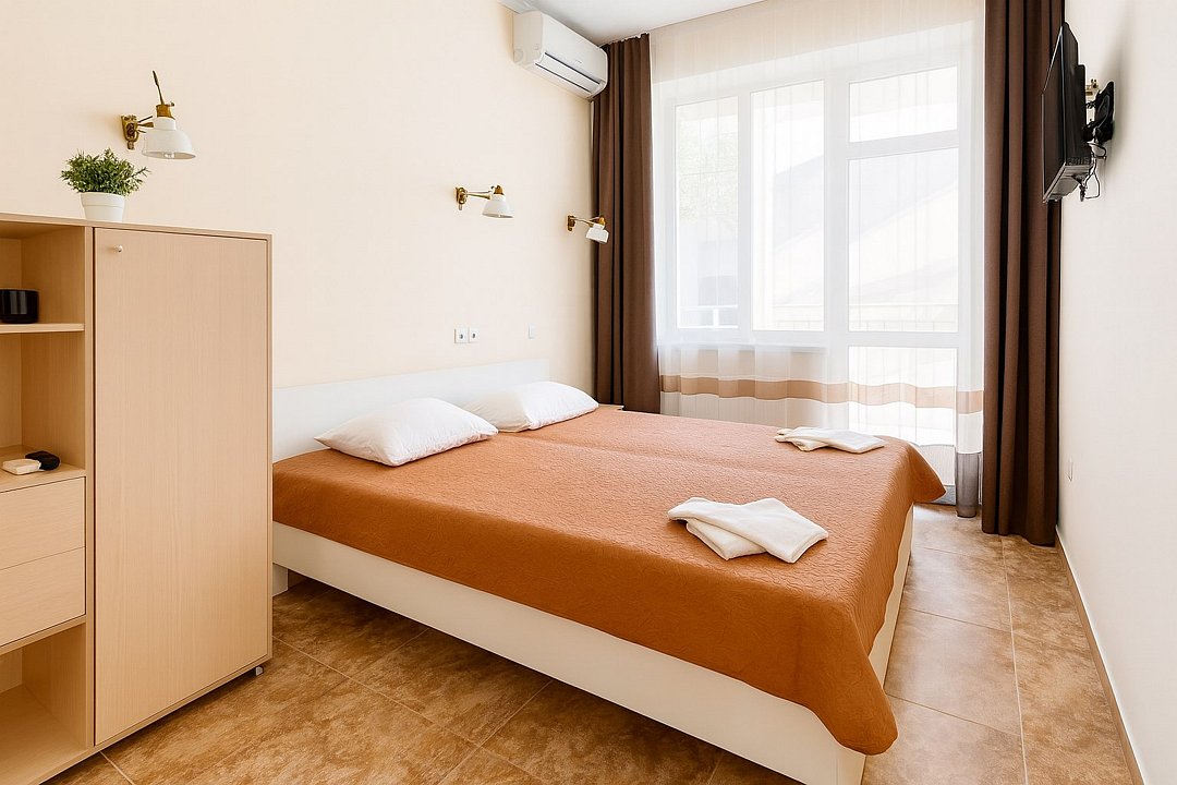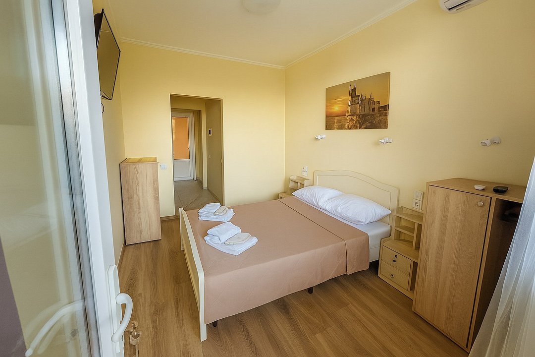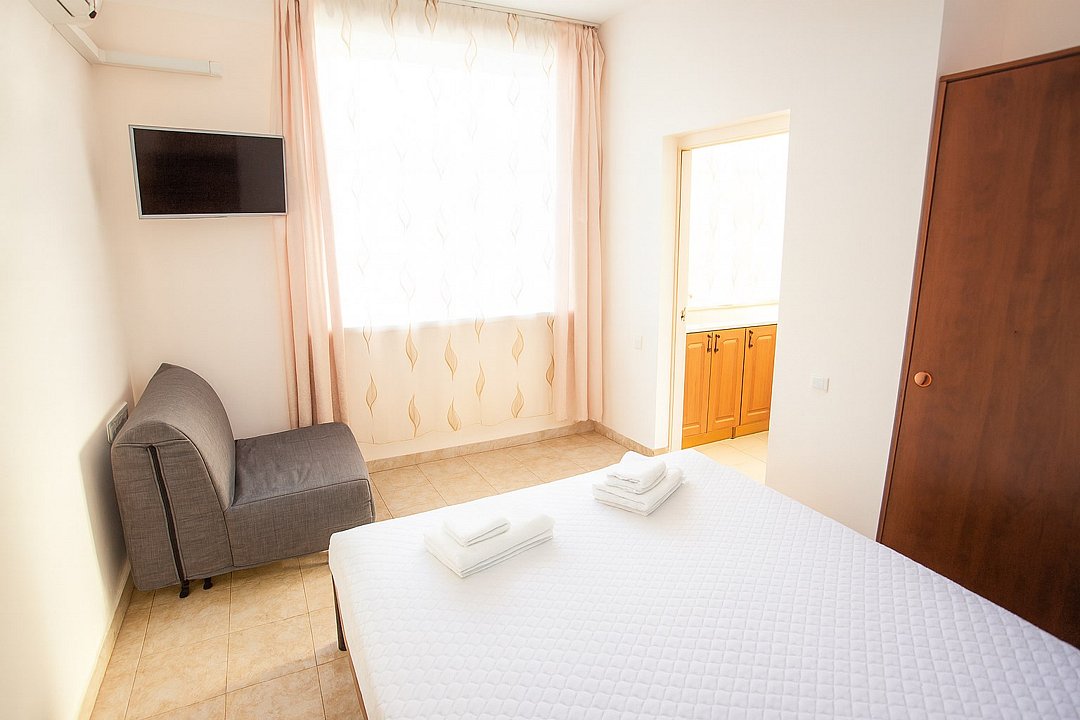 Номер «Евростандарт» – это однокомнатный номер с ванной комнатой и балконом. Площадь номера – 22 кв.м.. В номере: двухспальная кровать, раскладное кресло-кровать, кондиционер, настенное зеркало, мини-холодильник, письменный столик, светильники, телевизор, фен. К Вашим услугам: WI-FI, ванные принадлежности, набор полотенец. С балкона открывается панорамный вид на море! Номер расположен на 1-3 этаже. Добро пожаловать в отель Эллада!Услуги и удобства