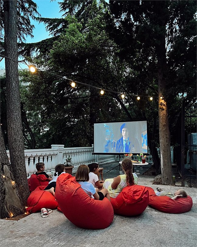 - Летний кинотеатр под открытым небом между соснами.