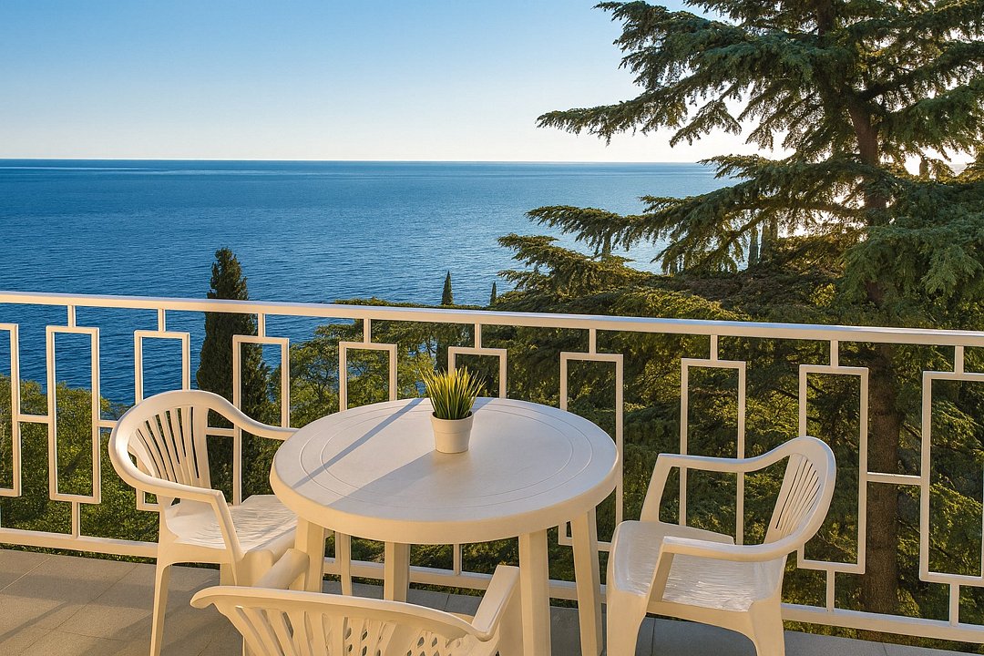 телевизор, Wi-Fi, холодильник, кондиционер, ванна или душевая кабина, балкон, двуспальная кровать, тумбы, стулья, зеркало, набор посуды, чайник, мягкая мебель, отопление, вид на море, кресло, стаканы, столовые приборы, стул, стол, туалетный столик, сушилка для белья, цифровое тв, затемняющая штора, можно с питомцамиВ номере
