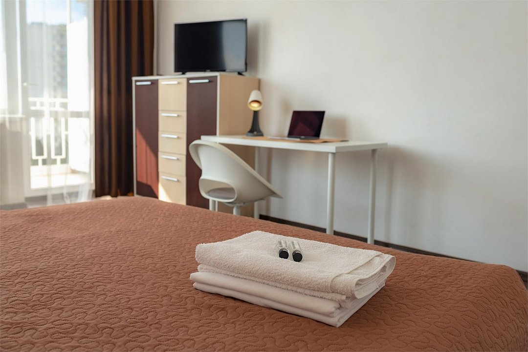 Номер «Стандарт 4-х местный» – это однокомнатный номер с ванной комнатой и балконом. Площадь номера – 24 кв.м.. В номере: двухспальная кровать, диван, кондиционер, настенное зеркало, мини-холодильник, письменный столик и светильники, телевизор, фен. К Вашим услугам: WI-FI, ванные принадлежности, набор полотенец. С балкона открывается вид на горы и внутренний дворик! Номера расположены на 4-5 этаже.Услуги и удобства