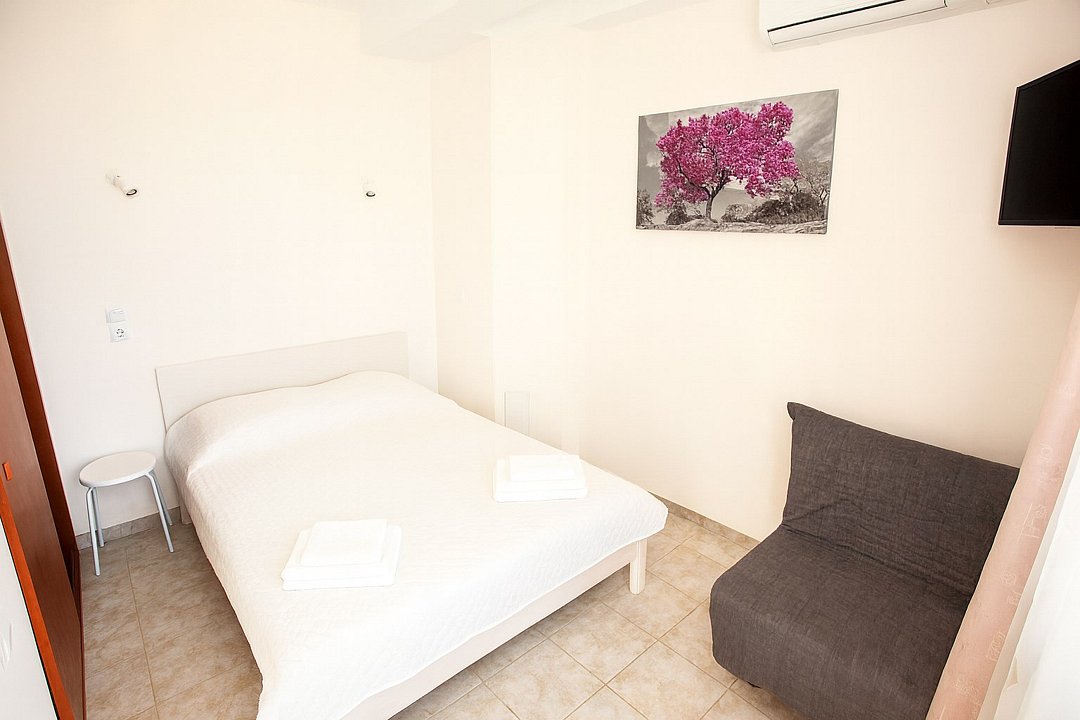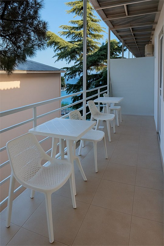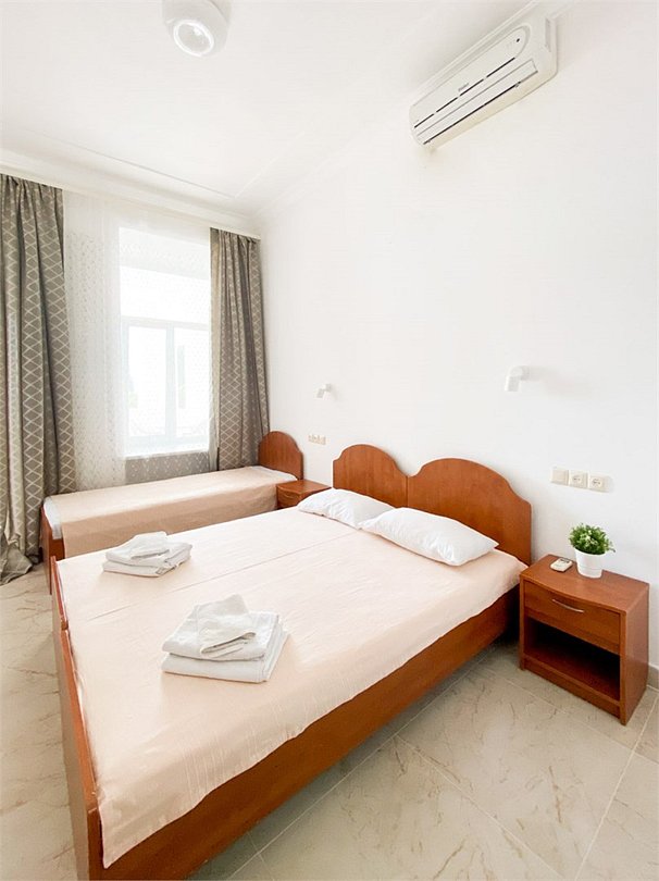 Номер «Стандарт с террасой» – - однокомнатный номер с ванной комнатой, террасой 16 м2 и гамаком. Площадь номера – 22 кв.м.. В номере на выбор: двухспальная + одна односпальная кровать или три односпальных кровати, кондиционер, настенное зеркало, мини-холодильник, гамак, письменный столик, светильники, телевизор и фен. К Вашим услугам: WI-FI, ванные принадлежности, набор полотенец. С террасы открывается шикарный вид на море! Номер расположен на 2-3 этаже. Добро пожаловать в отель Эллада!Услуги и удобства