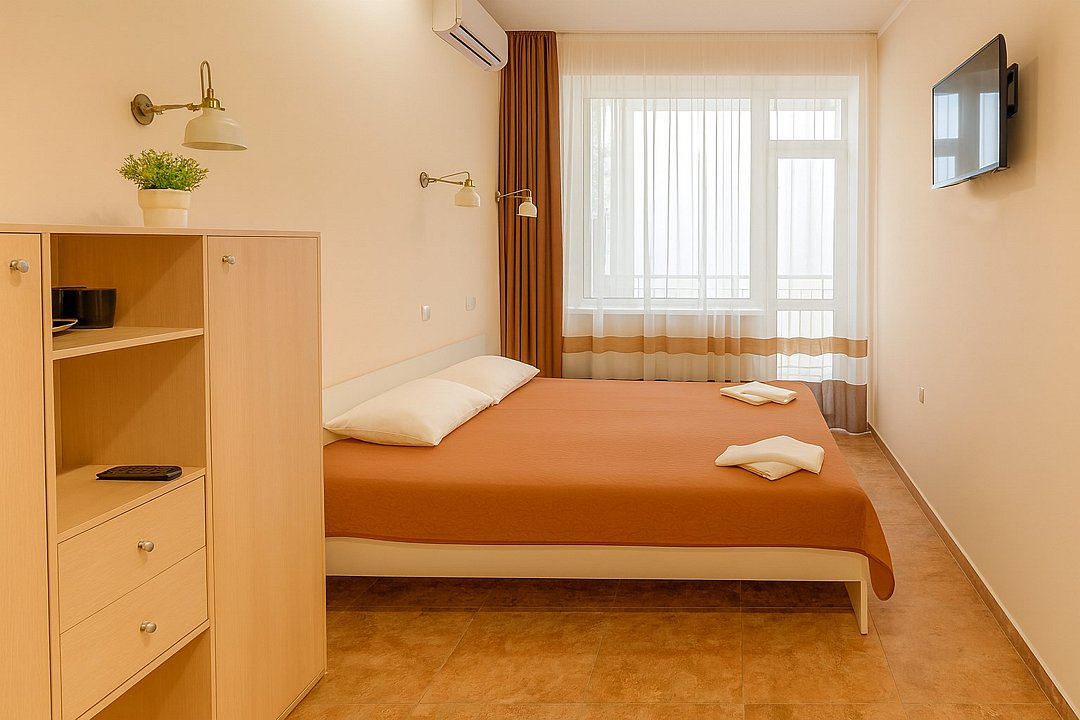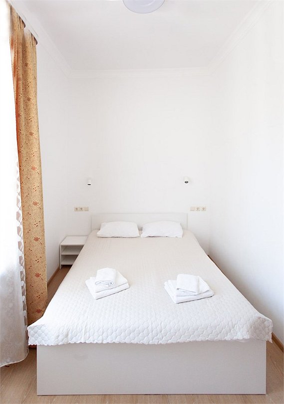 Номер «Стандарт» – это однокомнатный номер с ванной комнатой и балконом. Площадь номера – 16 кв.м.. В номере: двухспальная кровать, кондиционер, настенное зеркало, мини-холодильник, письменный столик и светильники, телевизор, фен. К Вашим услугам: WI-FI, ванные принадлежности, набор полотенец. С балкона открывается красивый вид на море! Номер расположен на 4-5 этаже. Добро пожаловать в отель Эллада!Услуги и удобства