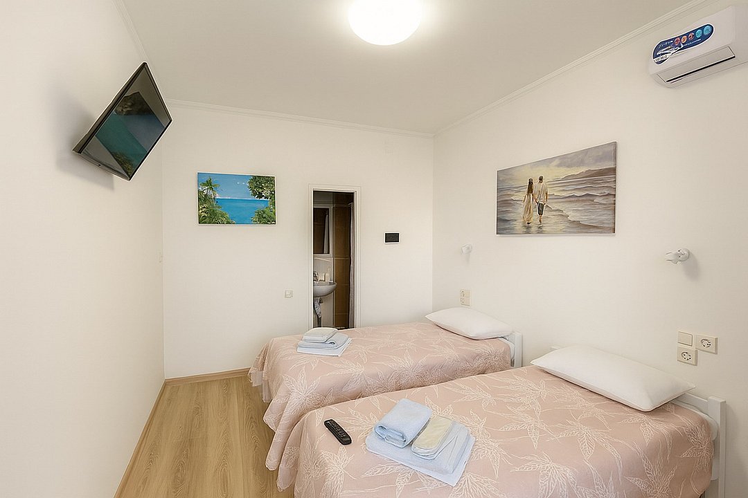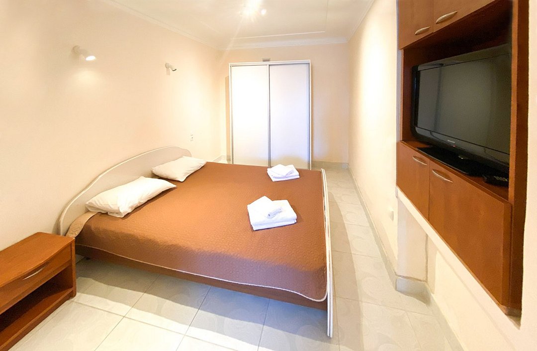 Номер «Стандарт с мини-кухней» площадью 70 м2- двухкомнатный номер с ванной комнатой и балконом. Каждая деталь продумана для вашего комфорта, две спальни: двуспальная кровать и две односпальные, постельное белье, столик, телевизор, WI-FI, мини- кухня, микроволновая печь, мультиварка, обеденная зона, кондиционер, фен. Санузел оборудован: душевая кабина, набор полотенец, ванные принадлежности. С балкона открывается панорамный вид на море! Номер расположен на 2 и 3 этаже. Добро пожаловать в отель Эллада!Услуги и удобства