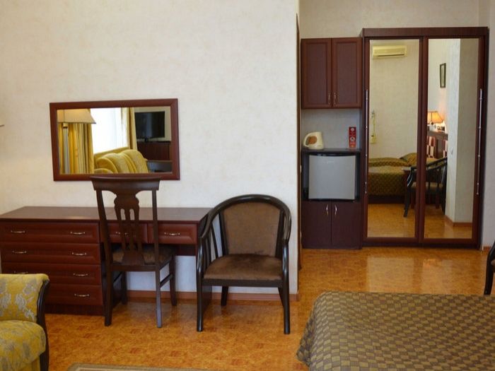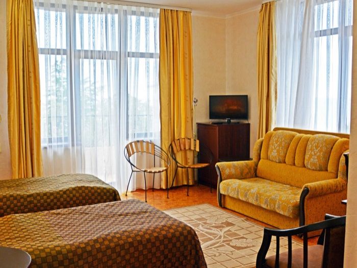Парк-отель занимает благоустроенную территорию площадью 2 гектара, расположенную всего в 150 метрах от моря. Размеситься гости могут в современном 5-ти этажном корпусе, который включает в себя двухместные номера Стандарт и Полулюкс. В комнатах со светлым интерьером есть все необходимое для комфортного проживания: индивидуальный санузел, кондиционер, удобный мебельный гарнитур, бытовая техника.