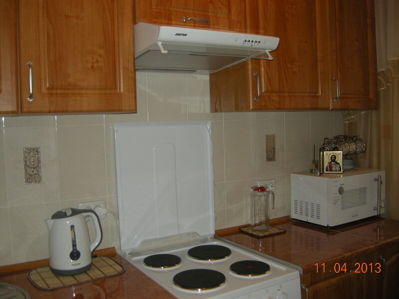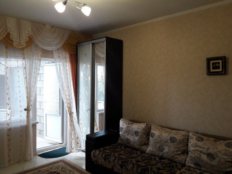 В квартире все для комфортного и отличного отдыха — бойлер, спутниковое ТВ, холодильник, стиральная машинка, утюг, посуда и мебель. Вода горячая постоянно. Во дворе все выложено кафелем. Два раздельных выхода. Во дворе столик со стульями. Один из выходов — балкончик с видом на море, где можно полюбоваться видом на море, сидя за столиком. В каждой комнате один двуспальный диван и высокий шкаф. Двор декорирован цветочным палисадником