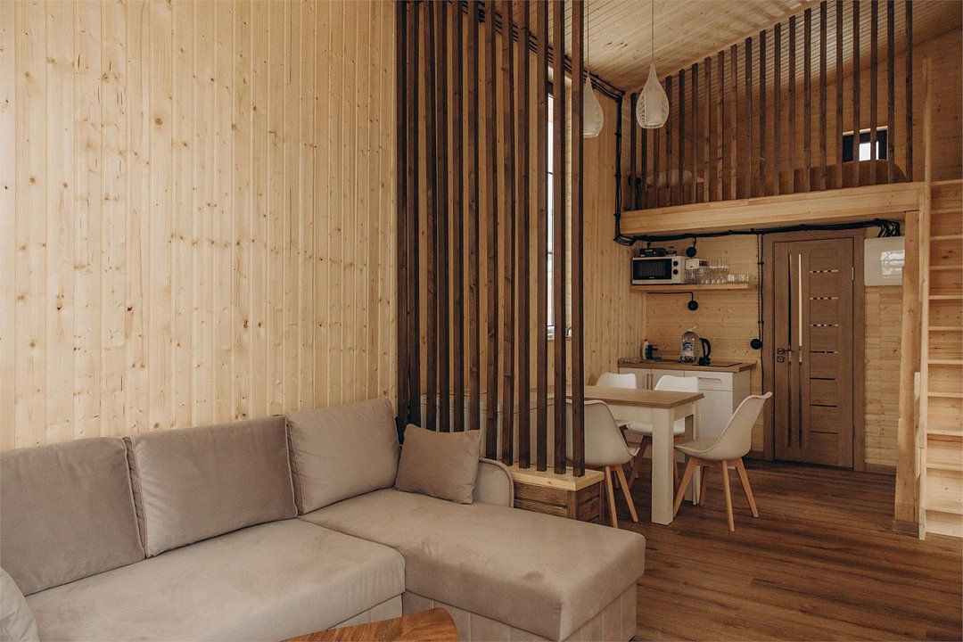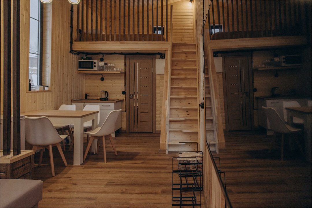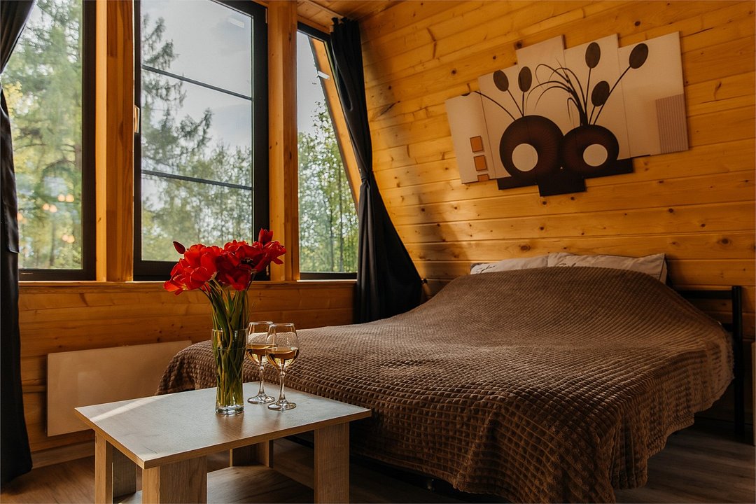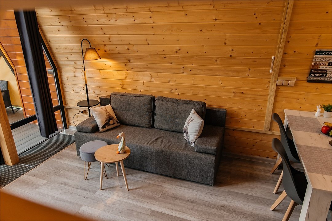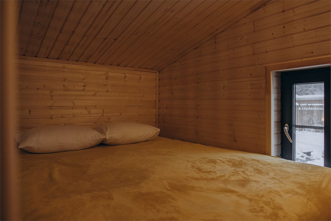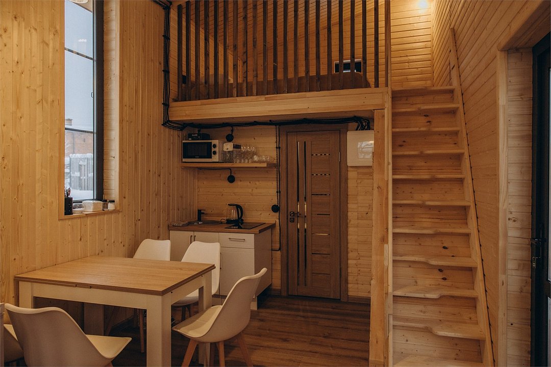 Двухэтажный домик 48 м² со спальней на 2 этаже и всеми удобствами. Оснащен террасой и панорамными окнами с видом на реку. На террасе у домика расположены гриль барбекю, мангал и садовая мебель. У каждого домика есть отдельная баня и купель.Услуги и удобства
