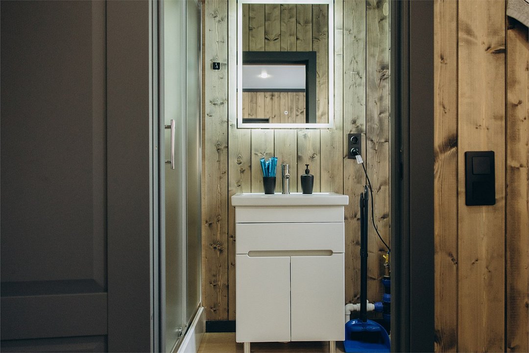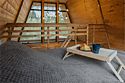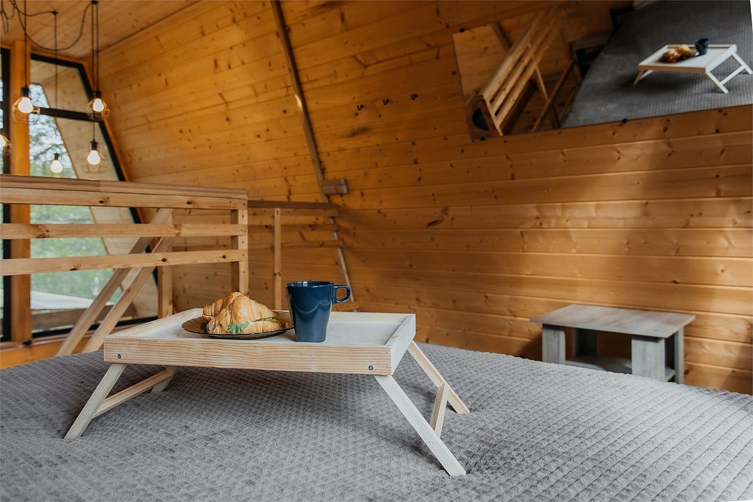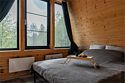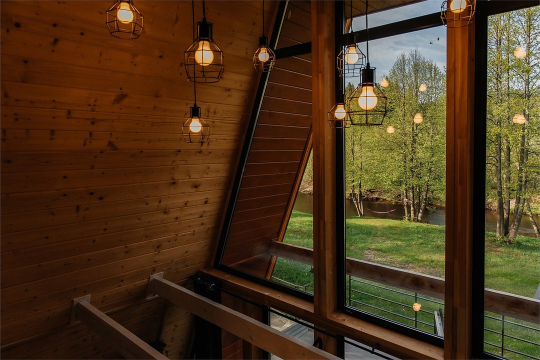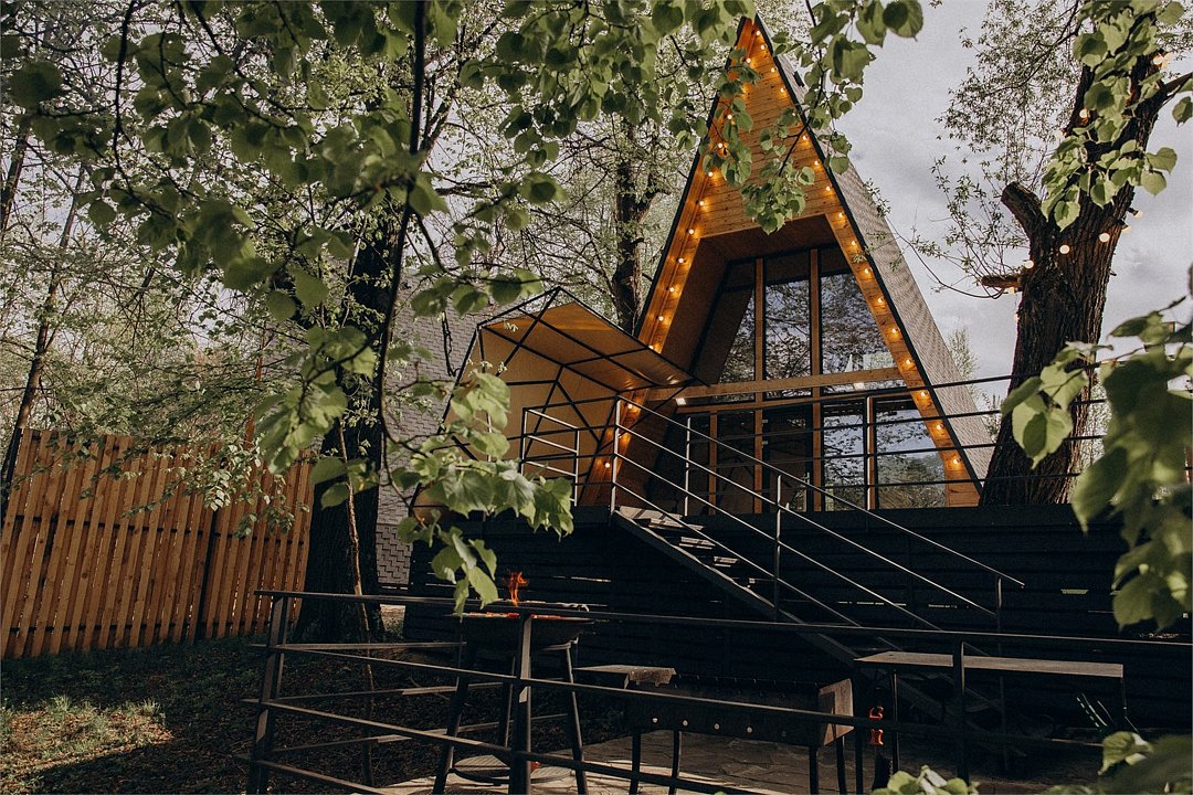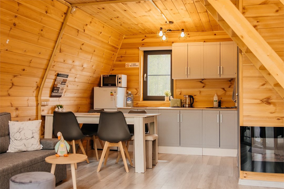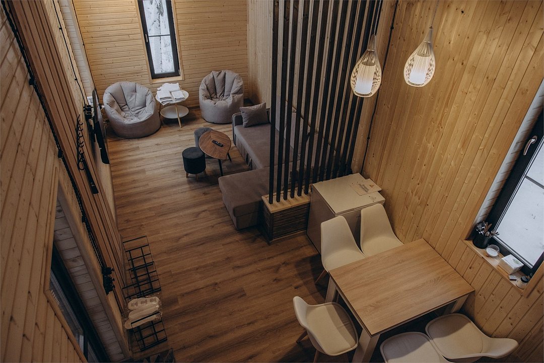 Двухэтажный домик 48 м² со спальней на 2 этаже и всеми удобствами. Оснащен террасой и панорамными окнами с видом на реку. На террасе у домика расположены гриль барбекю, мангал и садовая мебель. У каждого домика есть отдельная баня и купель.Услуги и удобства