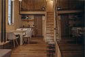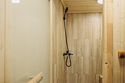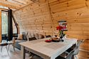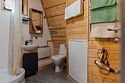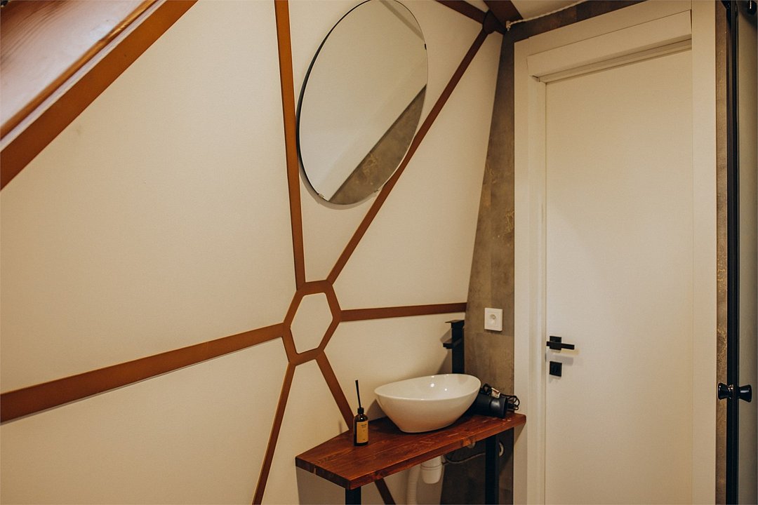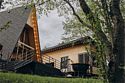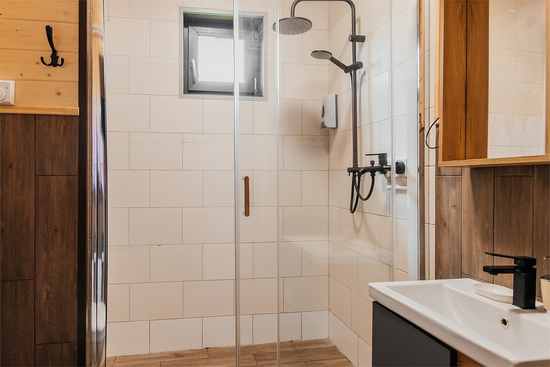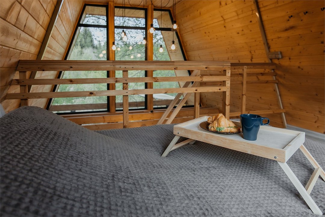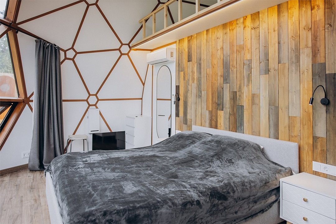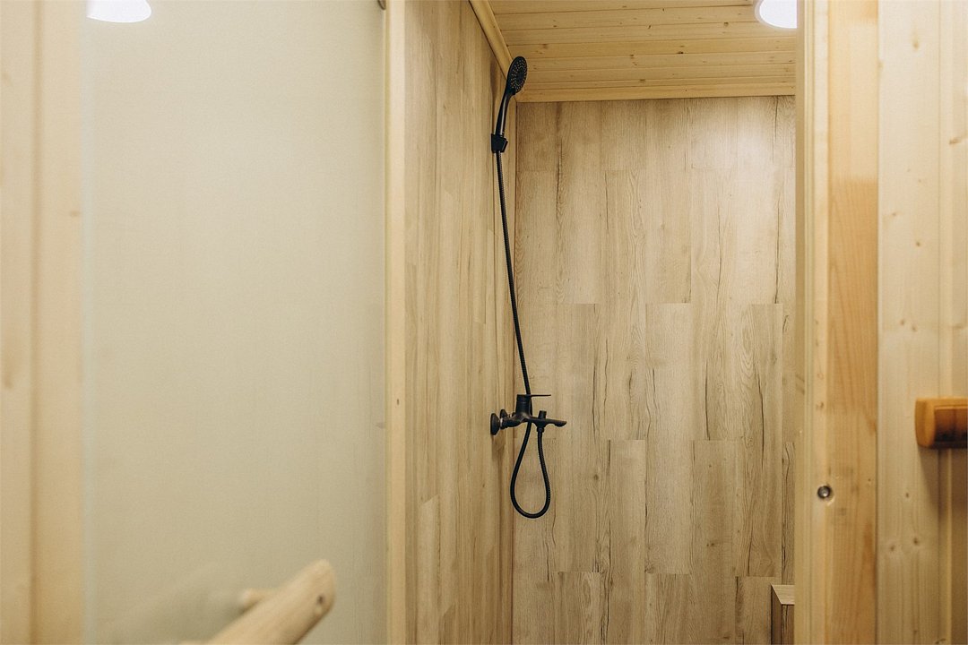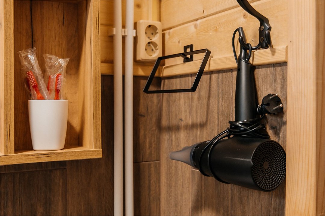Двухэтажный домик 48 м² со спальней на 2 этаже и всеми удобствами. Оснащен террасой и панорамными окнами с видом на реку. На террасе у домика расположены гриль барбекю, мангал и садовая мебель. У каждого домика есть отдельная баня и купель.Услуги и удобства