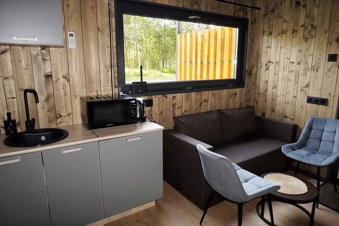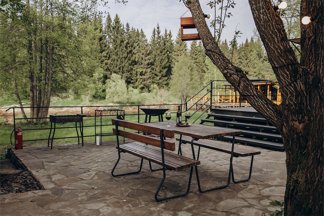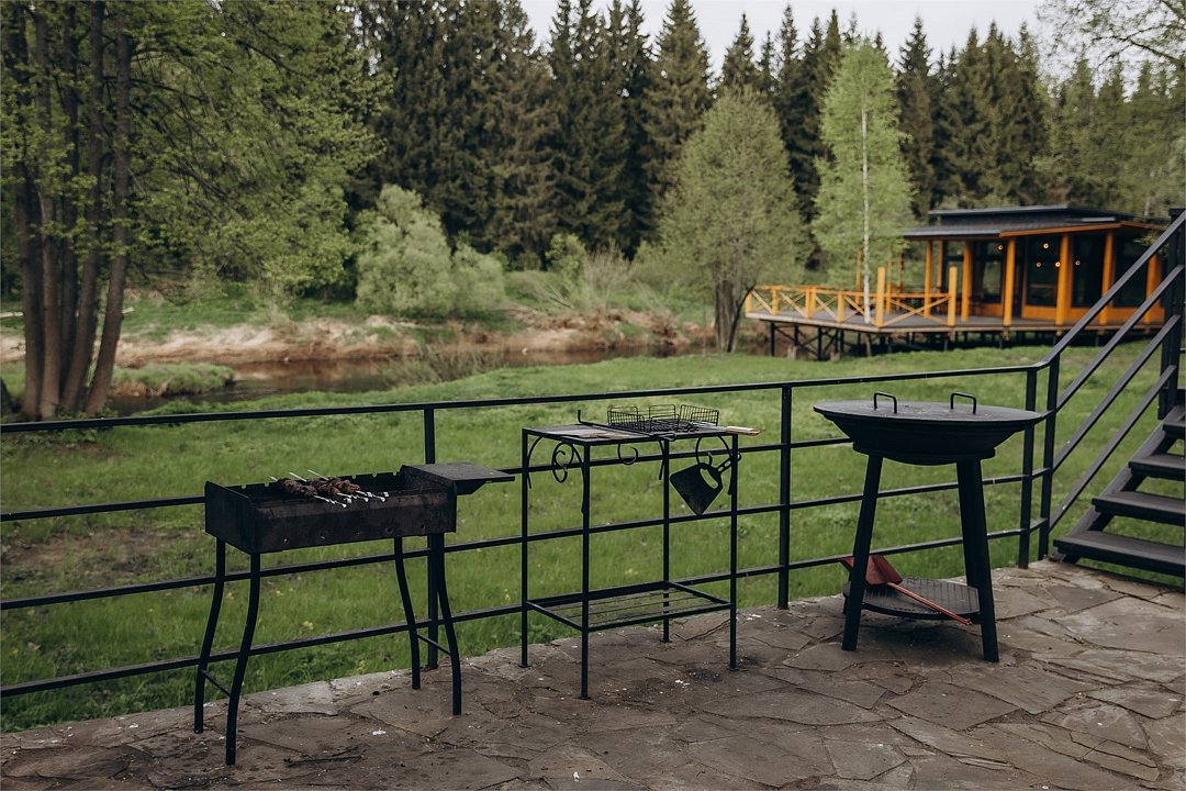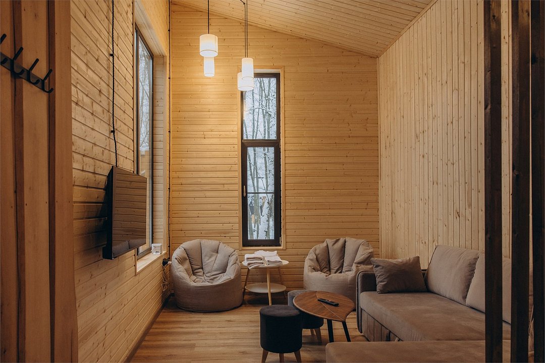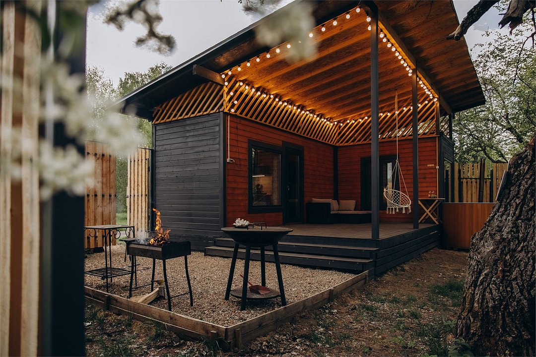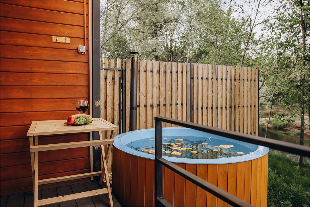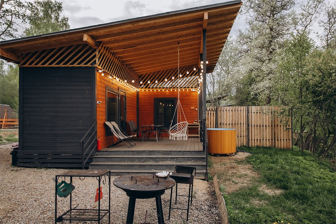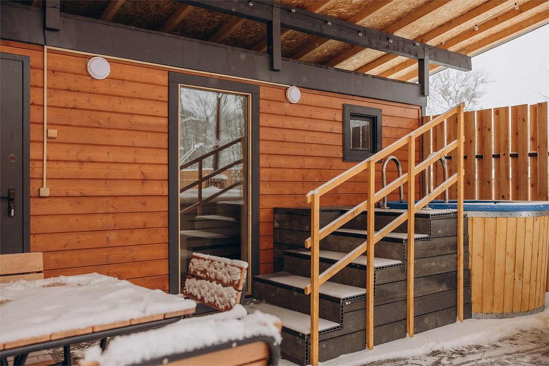 Одноэтажный домик площадью 29 м² с террасой и панорамными окнами (вид на реку). Есть все удобства и зона барбекю. В домике установлен электрический камин. На террасе у домика расположены гриль барбекю, мангал и садовая мебель. У каждого домика есть отдельная купель.Услуги и удобства