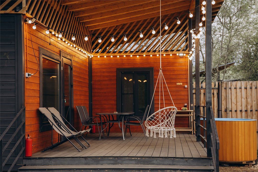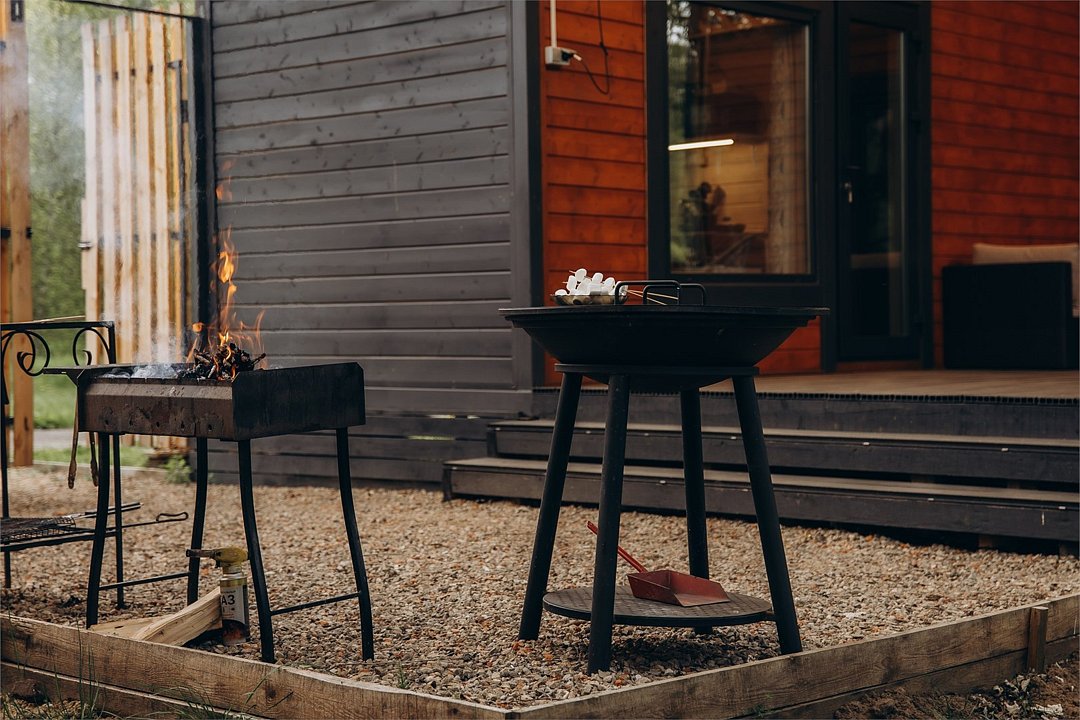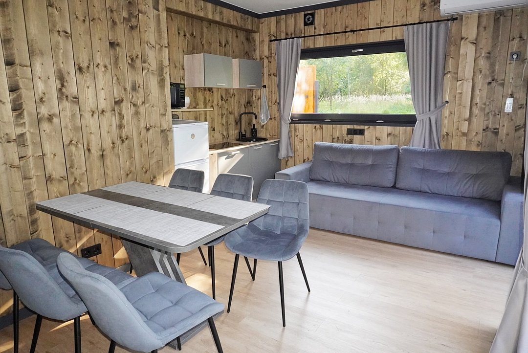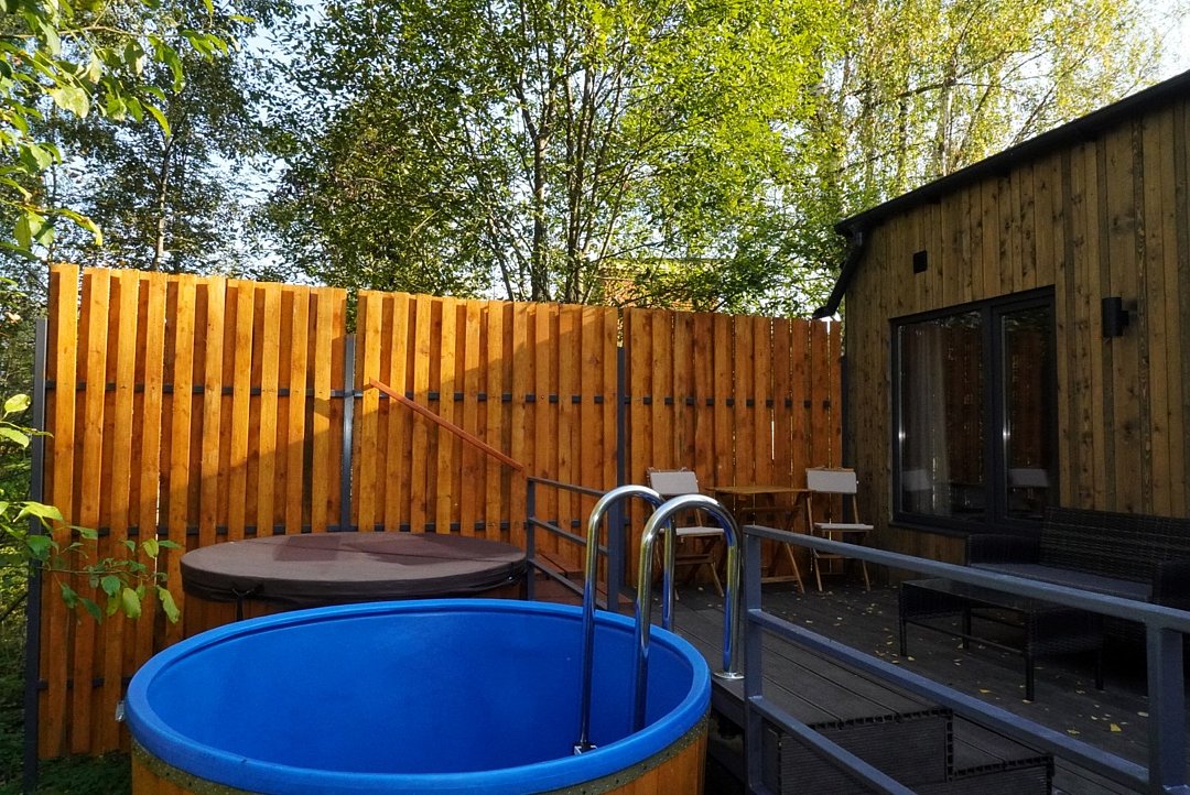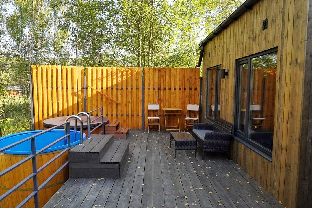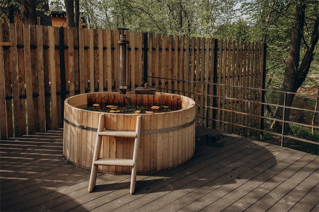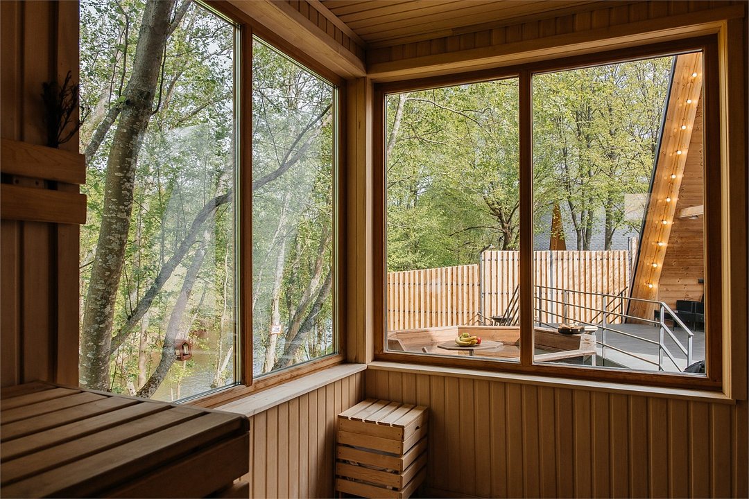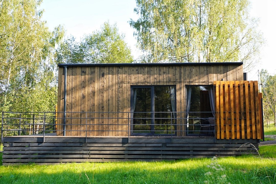 Одноэтажный домик площадью 29 м² с террасой и панорамными окнами (вид на реку). Есть все удобства и зона барбекю. В домике установлен электрический камин. На террасе у домика расположены гриль барбекю, мангал и садовая мебель. У каждого домика есть отдельная купель.Услуги и удобства