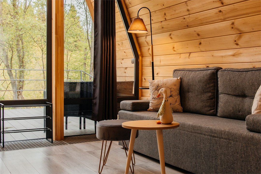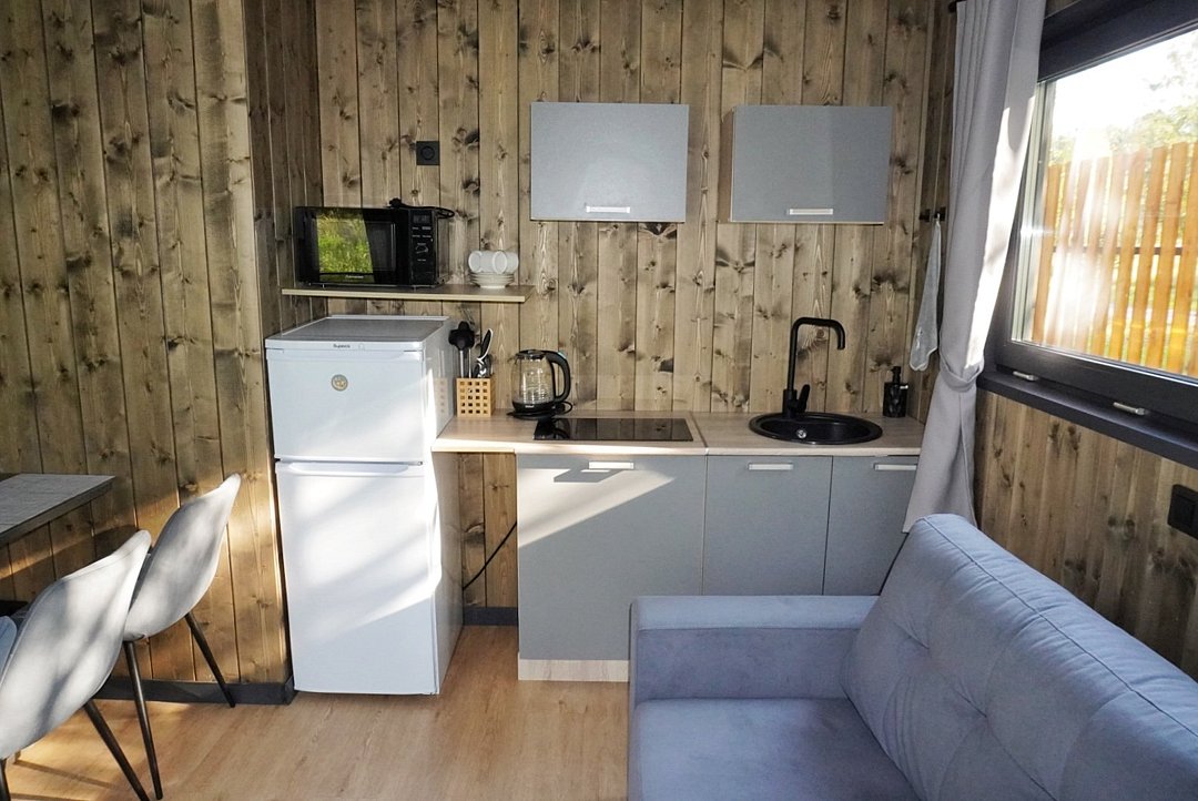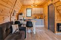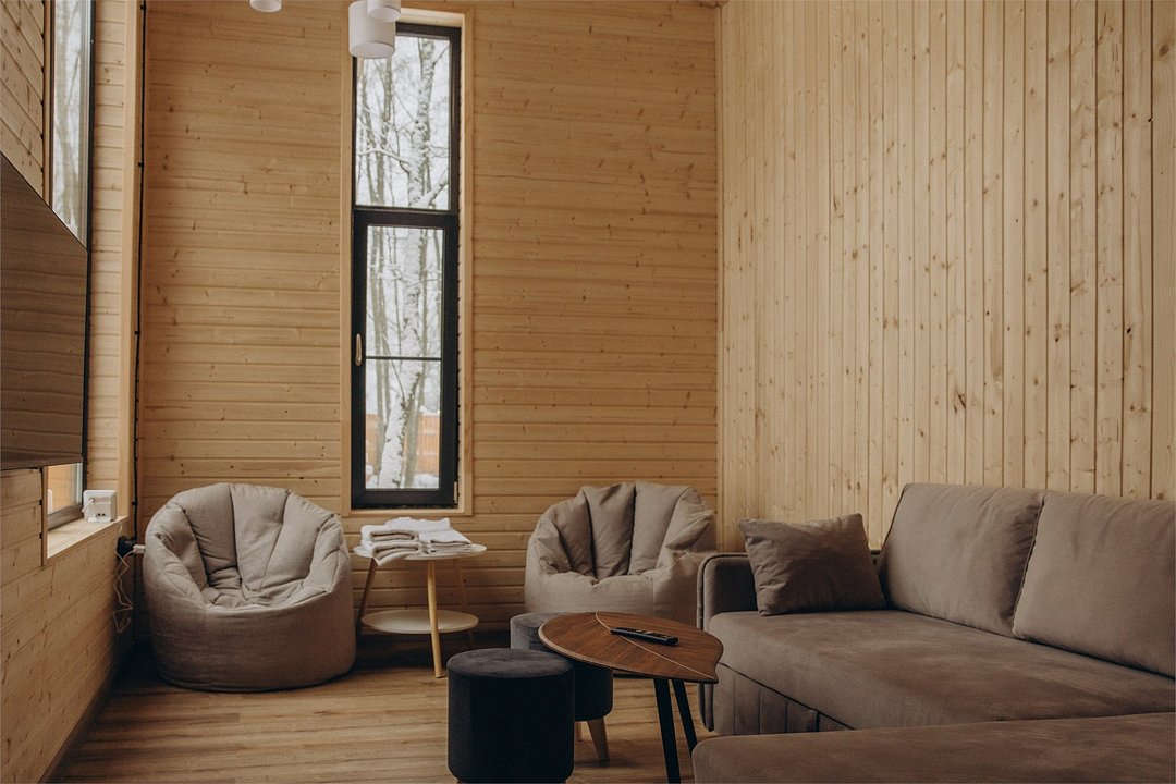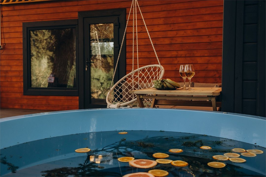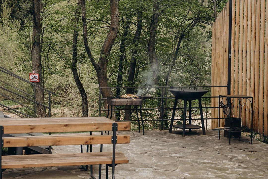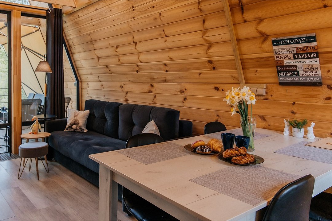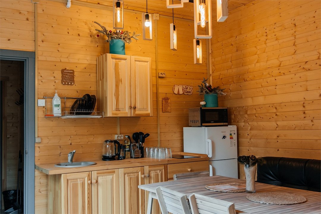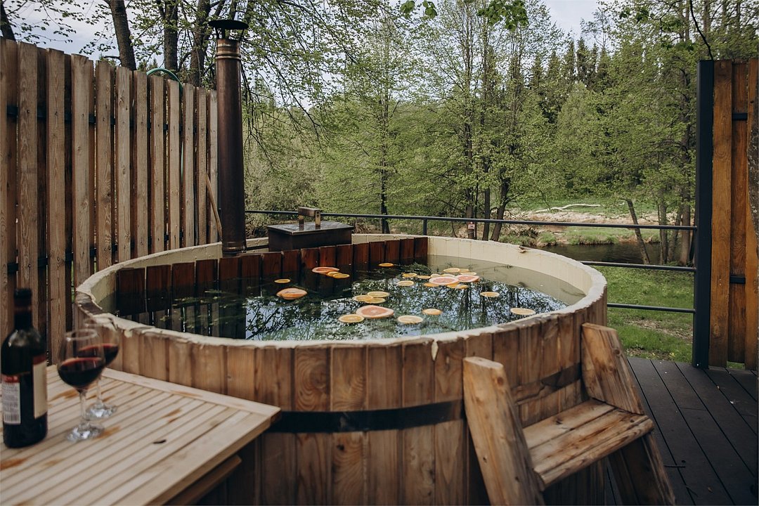 Одноэтажный домик площадью 29 м² с террасой и панорамными окнами (вид на реку). Есть все удобства и зона барбекю. В домике установлен электрический камин. На террасе у домика расположены гриль барбекю, мангал и садовая мебель. У каждого домика есть отдельная купель.Услуги и удобства