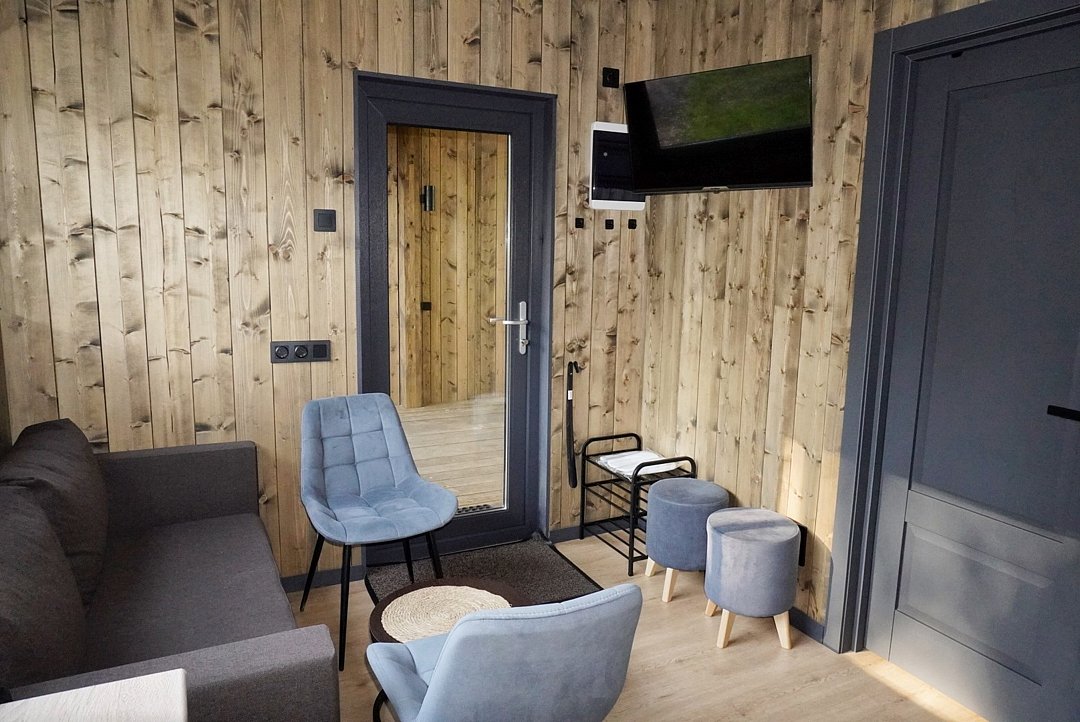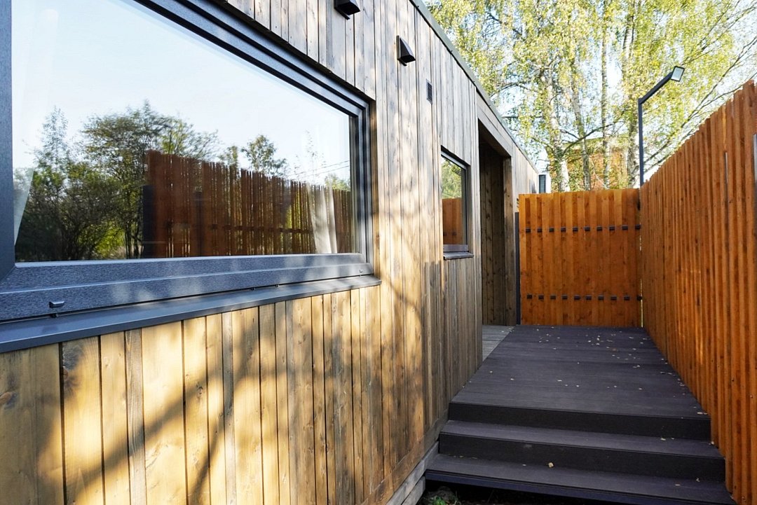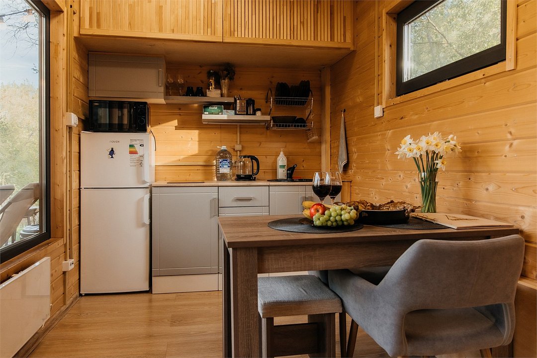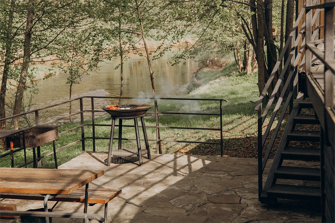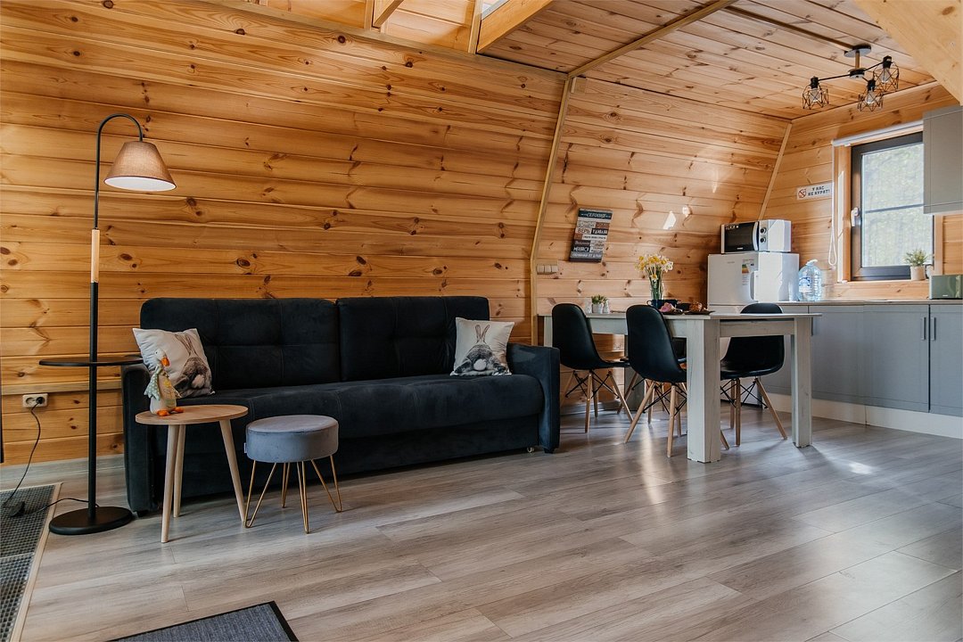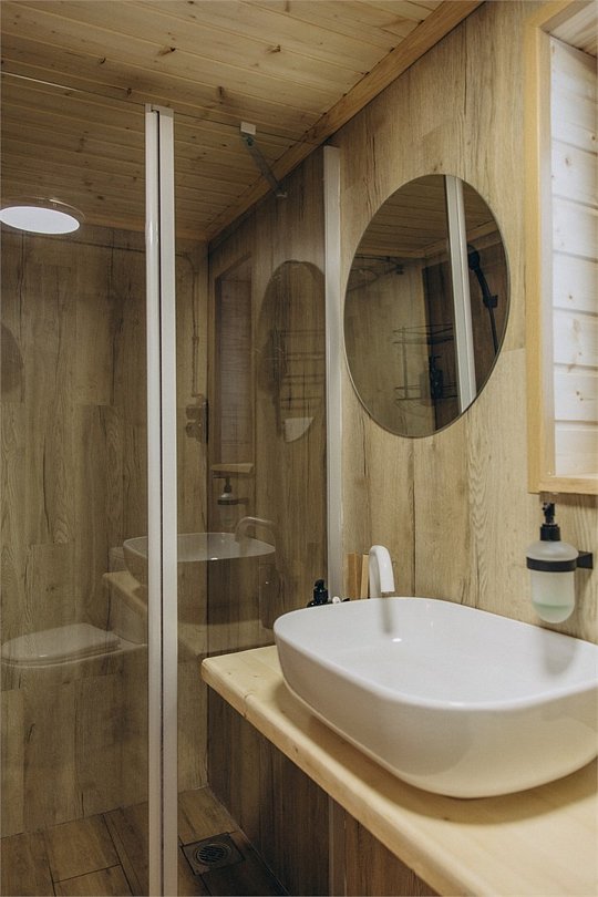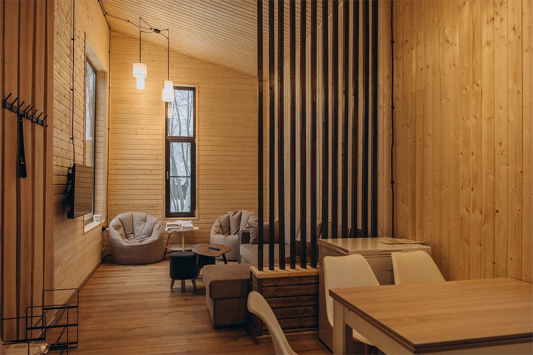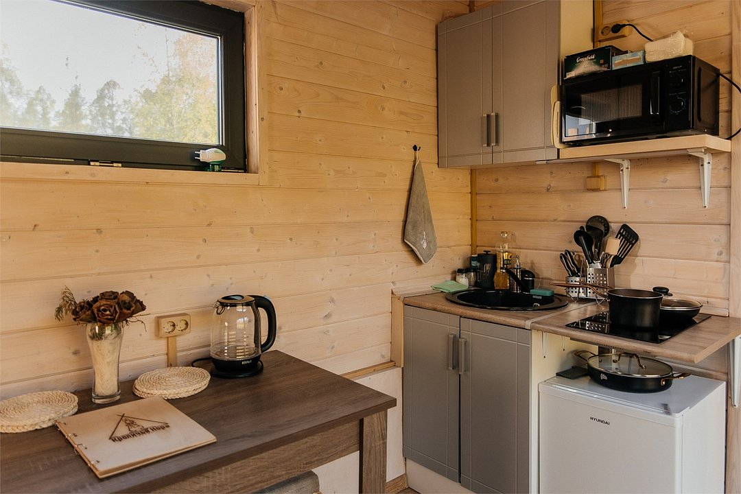 Одноэтажный домик площадью 29 м² с террасой и панорамными окнами (вид на реку). Есть все удобства и зона барбекю. В домике установлен электрический камин. На террасе у домика расположены гриль барбекю, мангал и садовая мебель. У каждого домика есть отдельная купель.Услуги и удобства