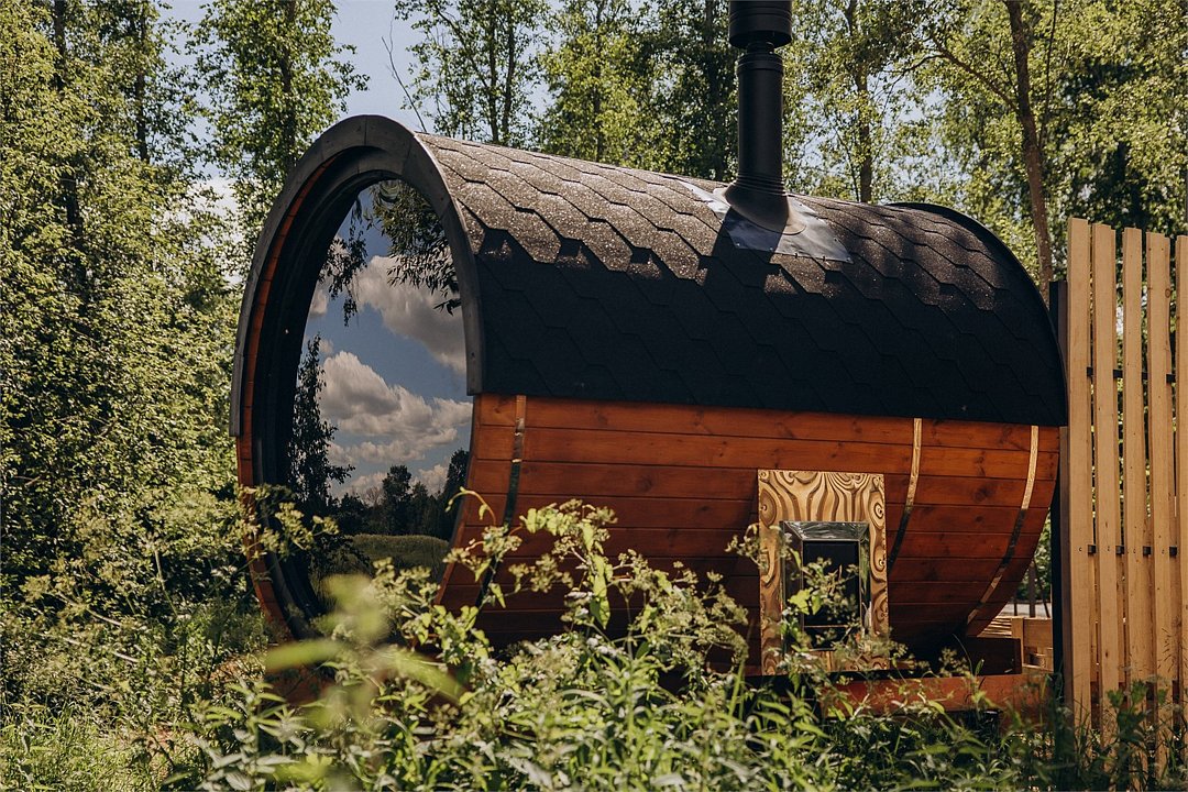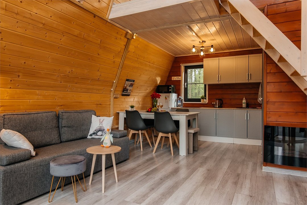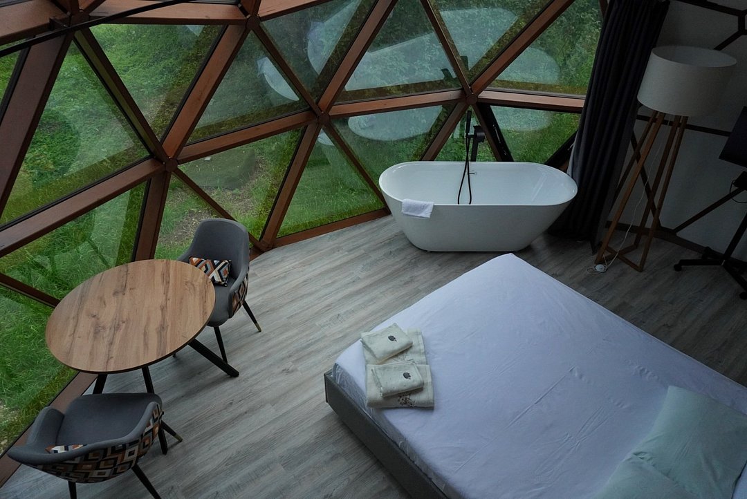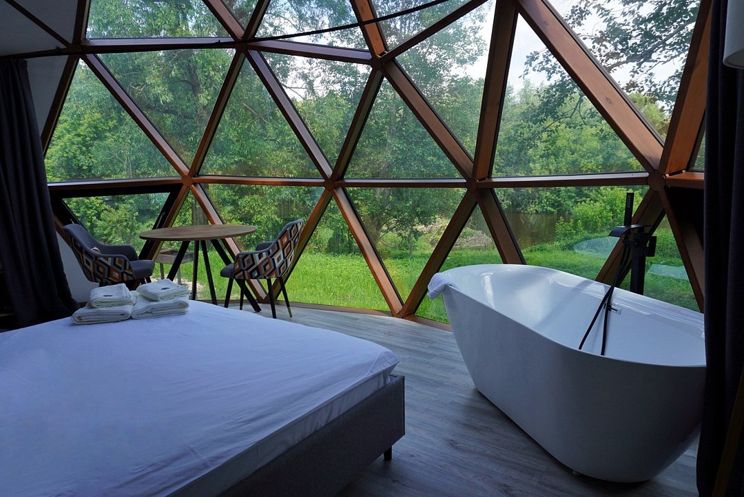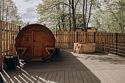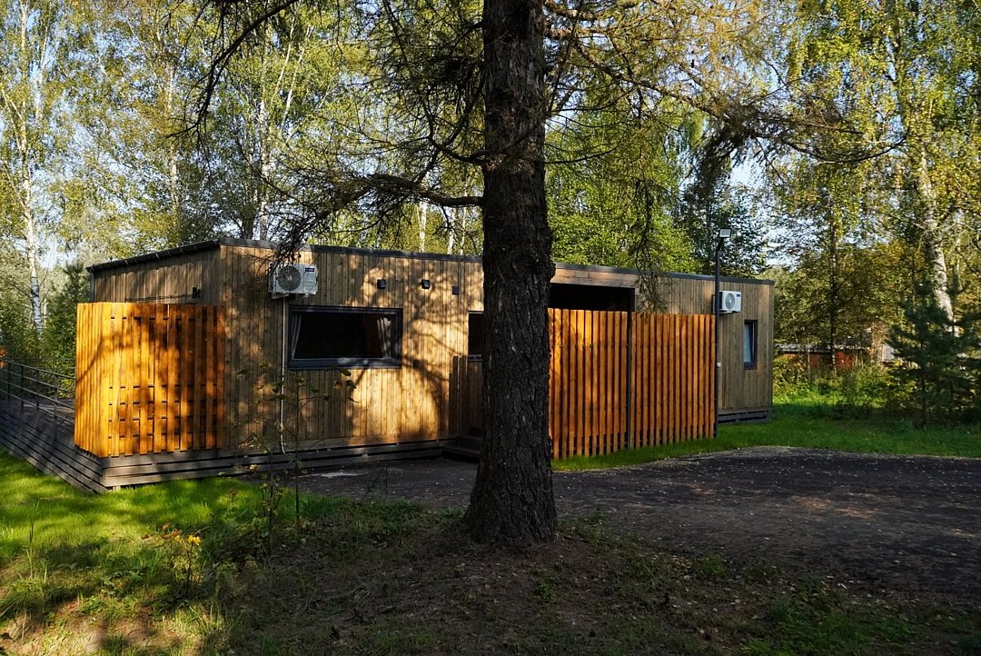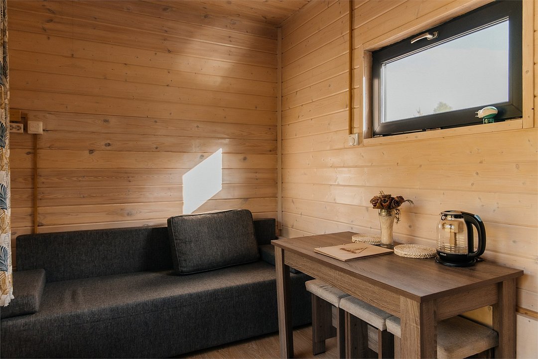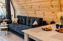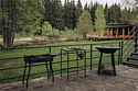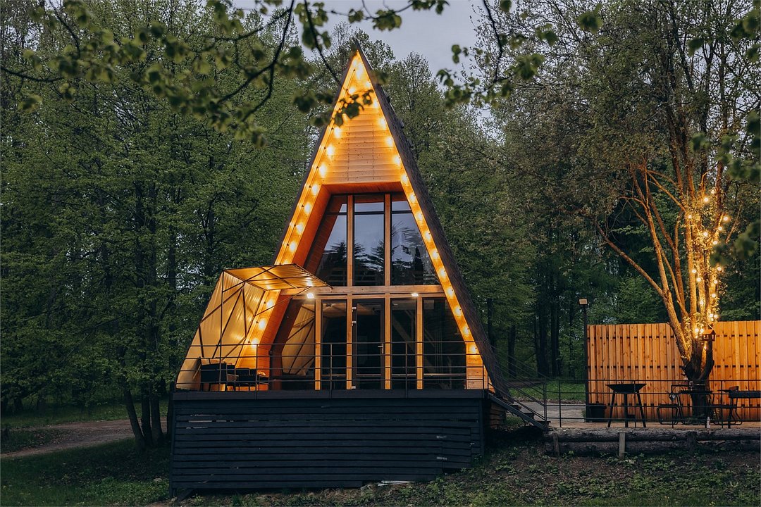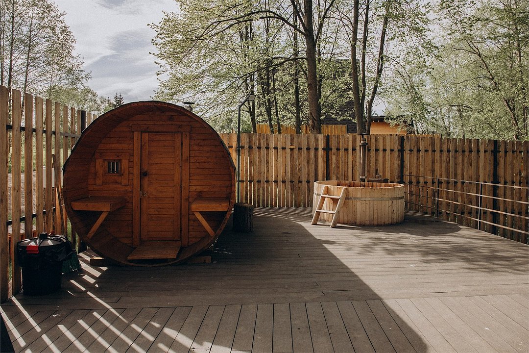 Одноэтажный домик площадью 29 м² с террасой и панорамными окнами (вид на реку). Есть все удобства и зона барбекю. В домике установлен электрический камин. На террасе у домика расположены гриль барбекю, мангал и садовая мебель. У каждого домика есть отдельная купель.Услуги и удобства